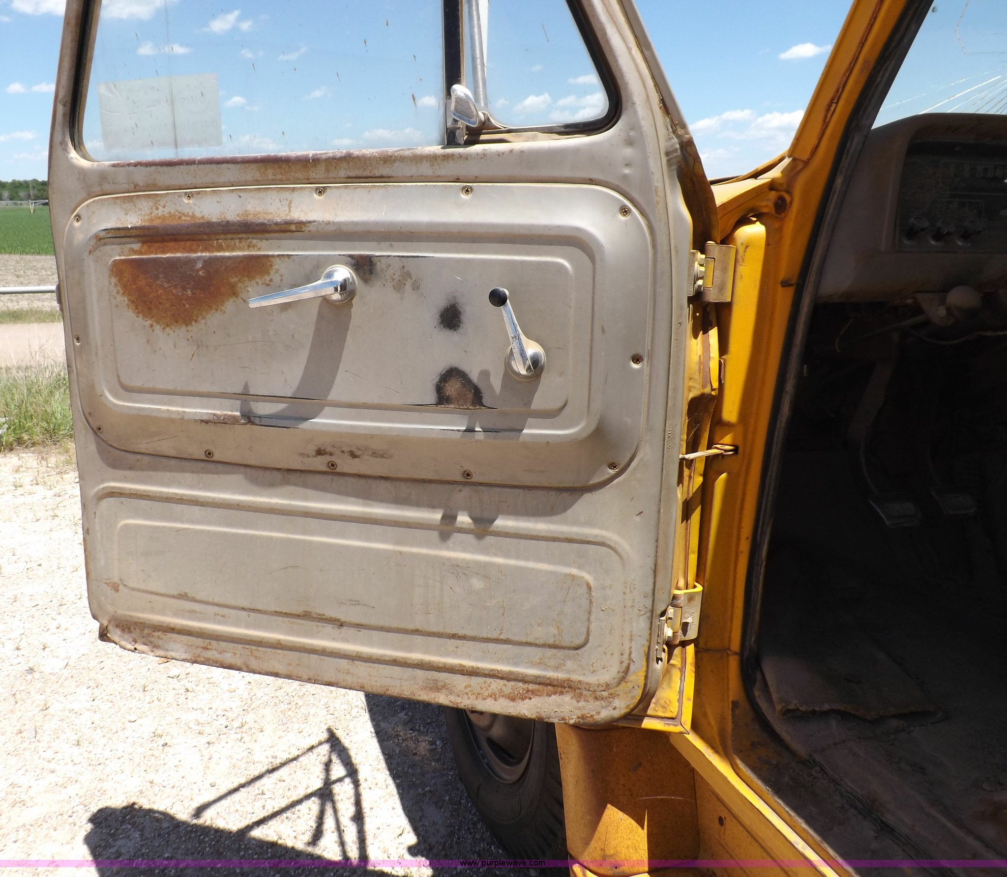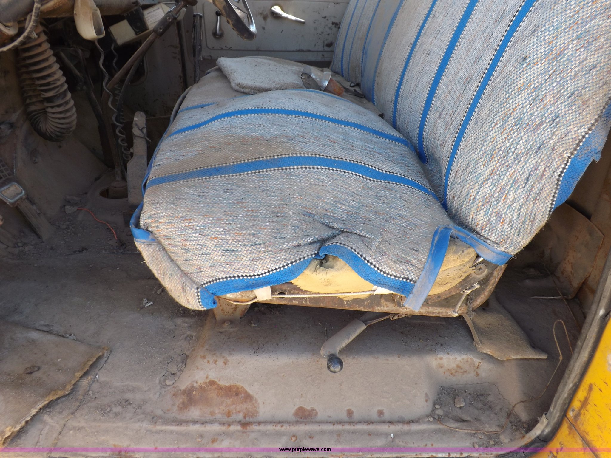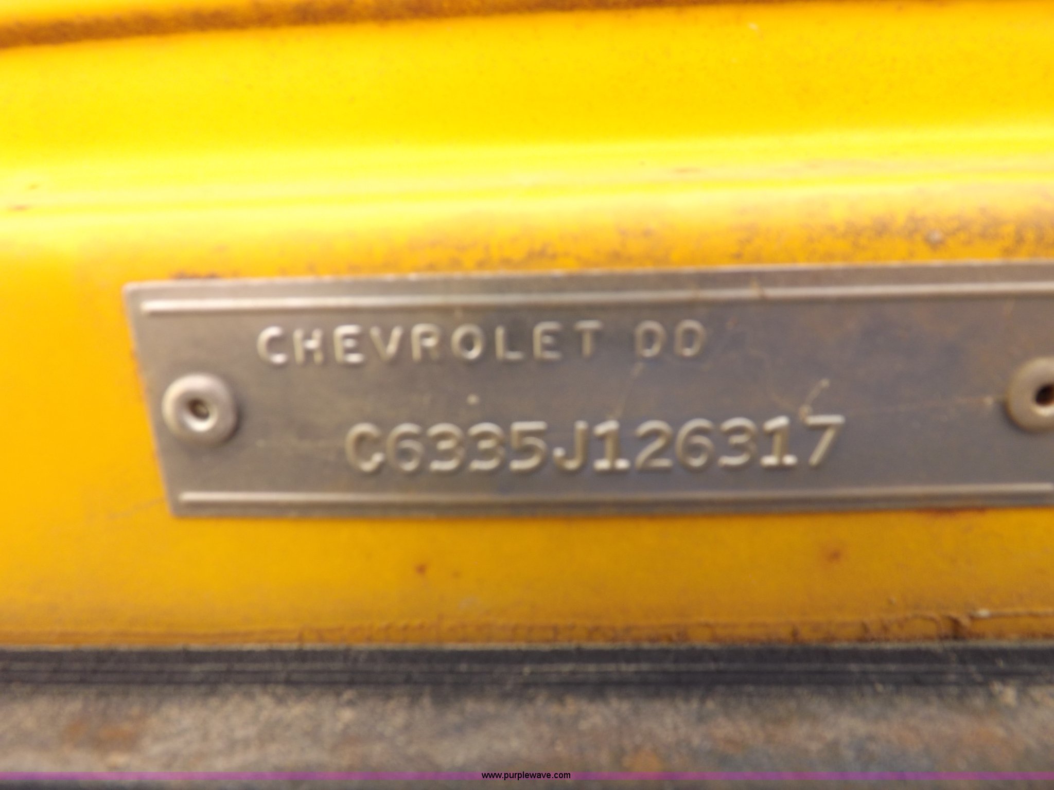 Purple Wave is selling a used Construction Dump Truck in Kansas. This item is a 1965 Chevrolet C60 dump truck with the following: 77,857 miles on odometer, Chevrolet six cylinder gas engine, Four speed manual transmission, Two speed rear end, PTO, 10'L x 7'W steel dump bed, 34"H sides, Single ram hoist, Manual end gate, Dual fuel tanks, Spring suspension, Hydraulic brakes, 156" wheelbase, 8.250-20 tires, Interior/exterior cosmetic damage, Windshield broken, Right side door glass broken, Hood sprung, Dents, Rust, Non-operational unit, Must be towed or hauled