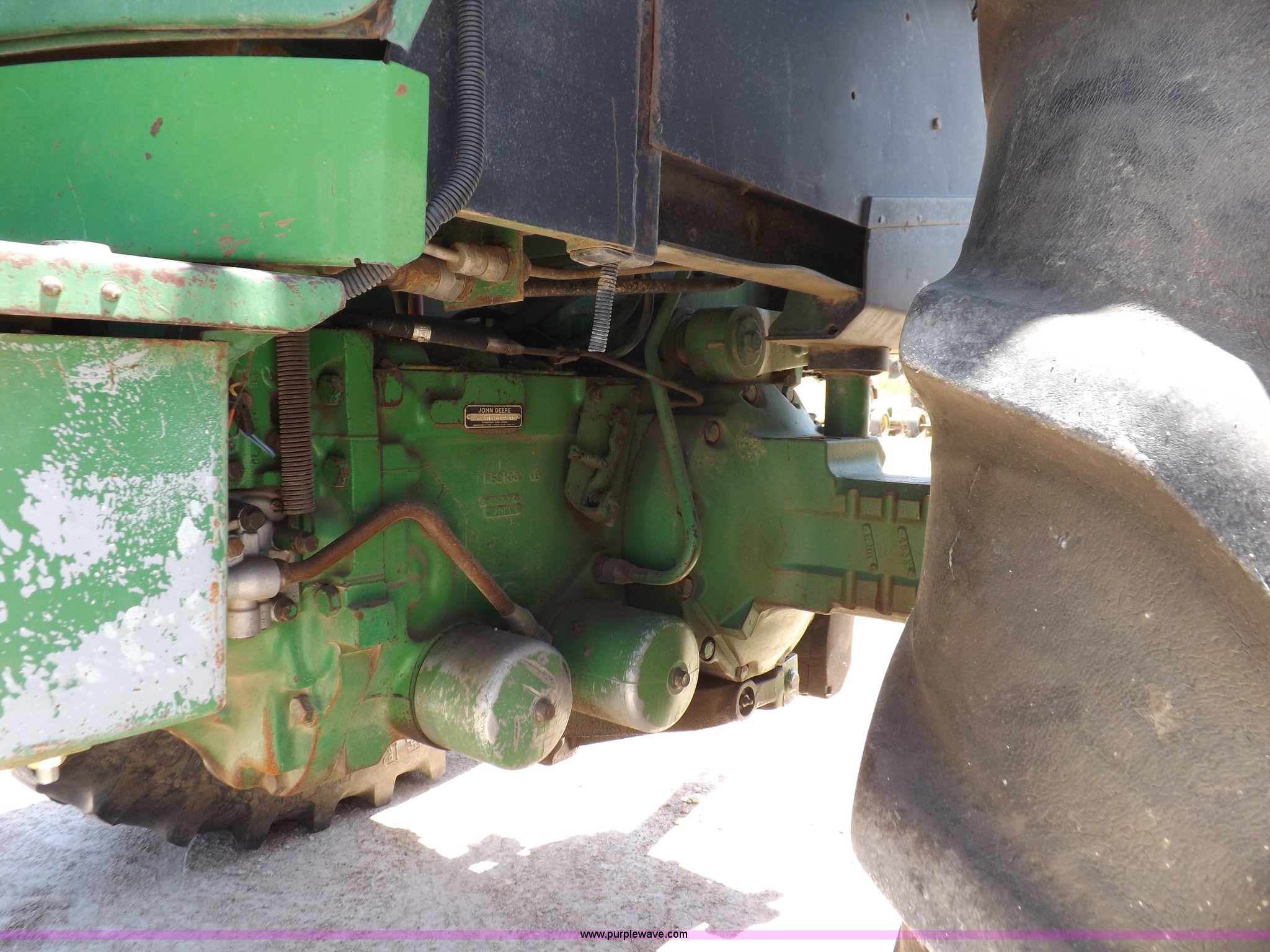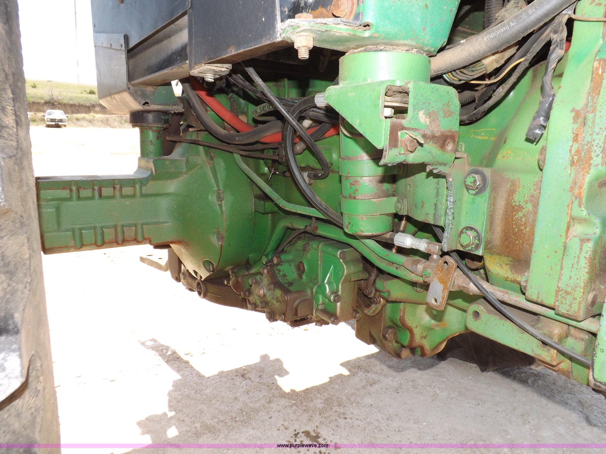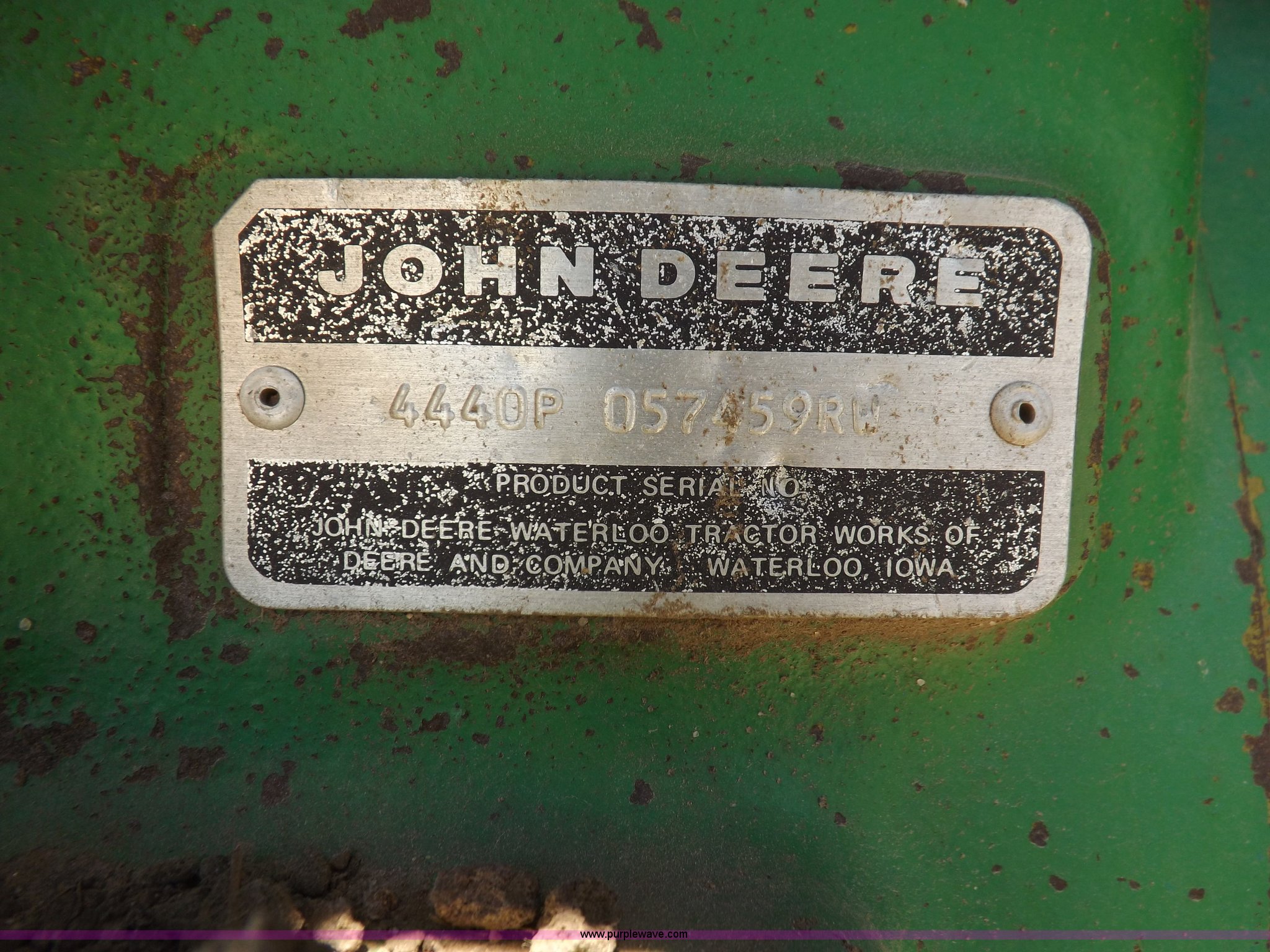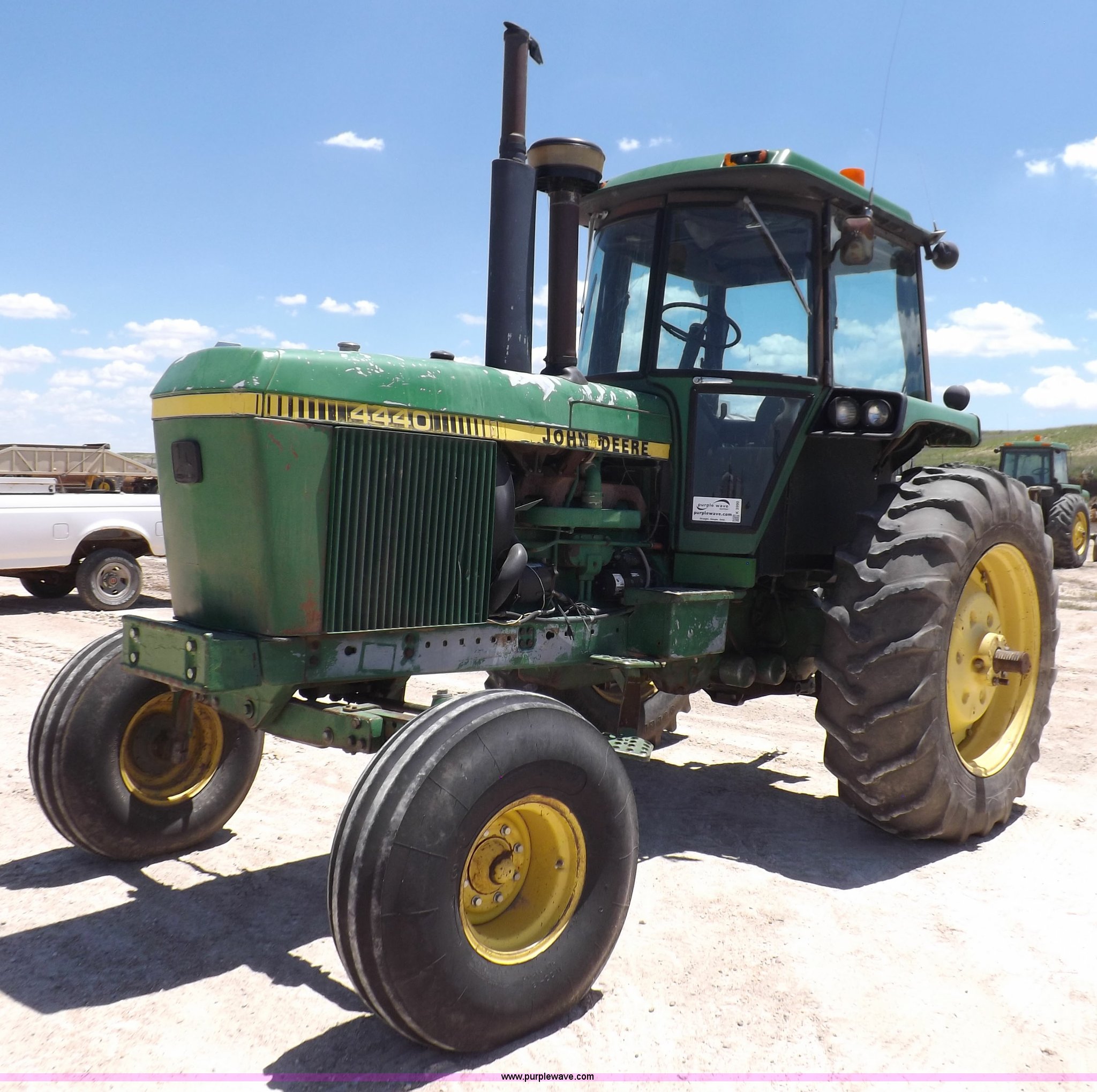 Purple Wave is selling a used Tractor in Kansas. This item is a 1982 John Deere 4440 tractor with the following: 4,954 hours on meter, John Deere 6466TP-04 six cylinder turbo diesel engine, Serial 191275RG, Powershift transmission, 8F-4R gears, Differential lock, AC and heat, AM/FM, Suspension seat, Tilt steering wheel, Block heater, Three point, 1000 PTO, (3) rear hydraulic remote sets, Inner wheel weights, 107" wheelbase, 11.00-16 front tires, 18.4-38 rear tires, Interior/exterior cosmetic damage, Engine weak, Paint damage, Serial 04440P057459RW