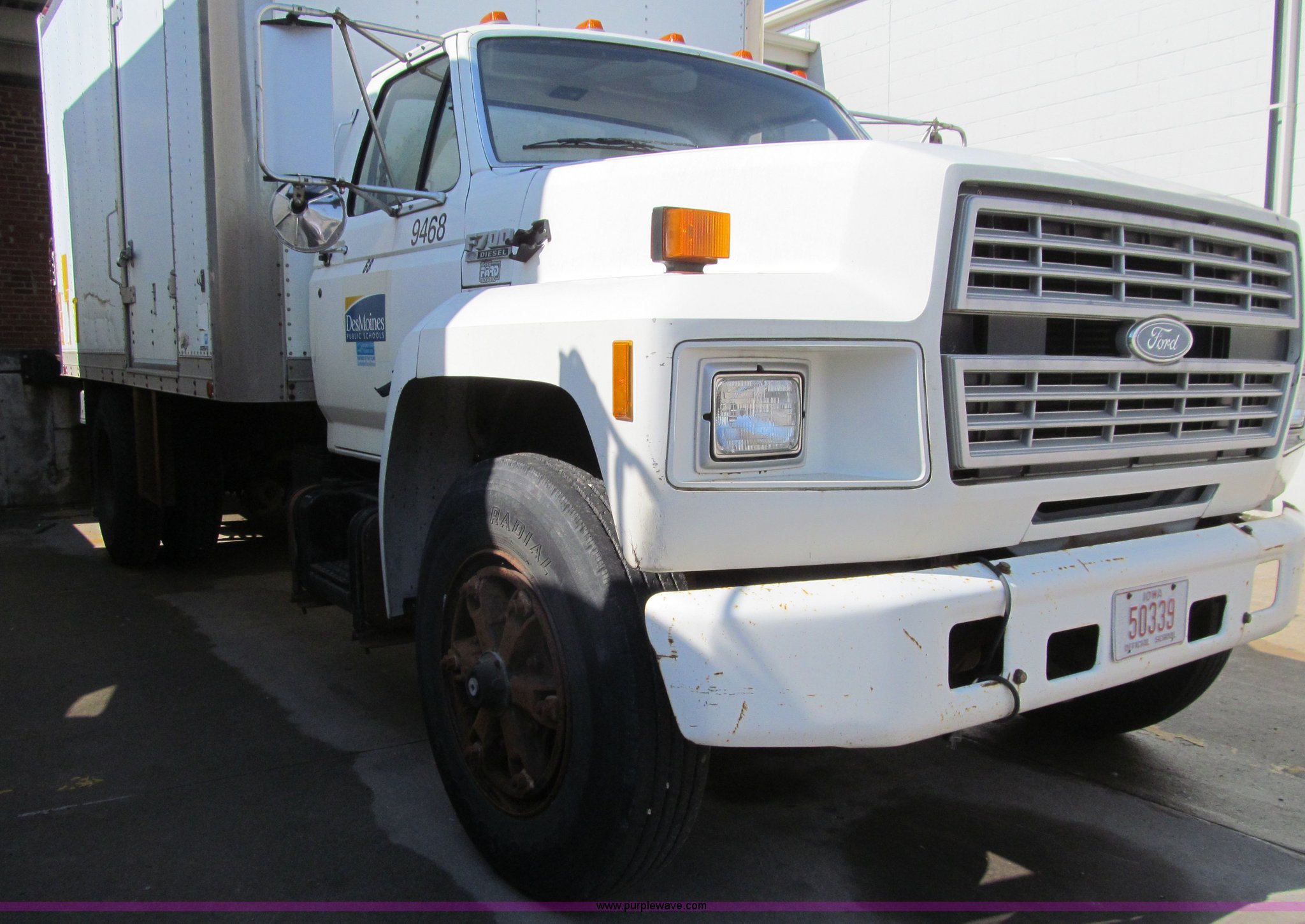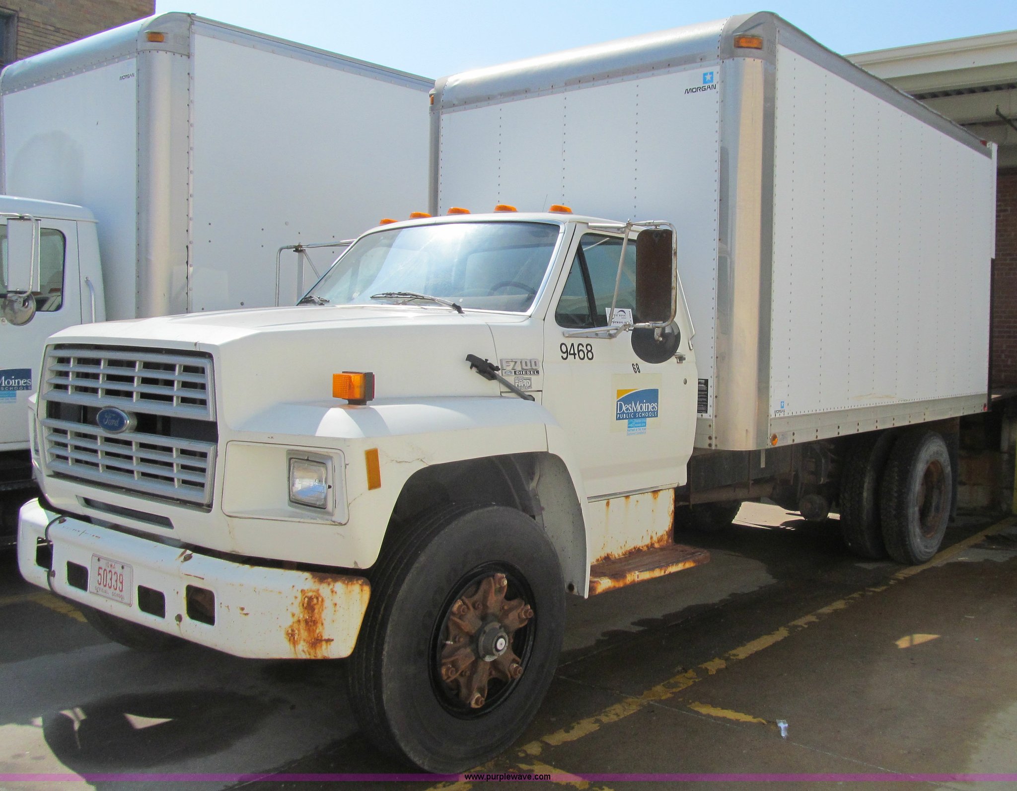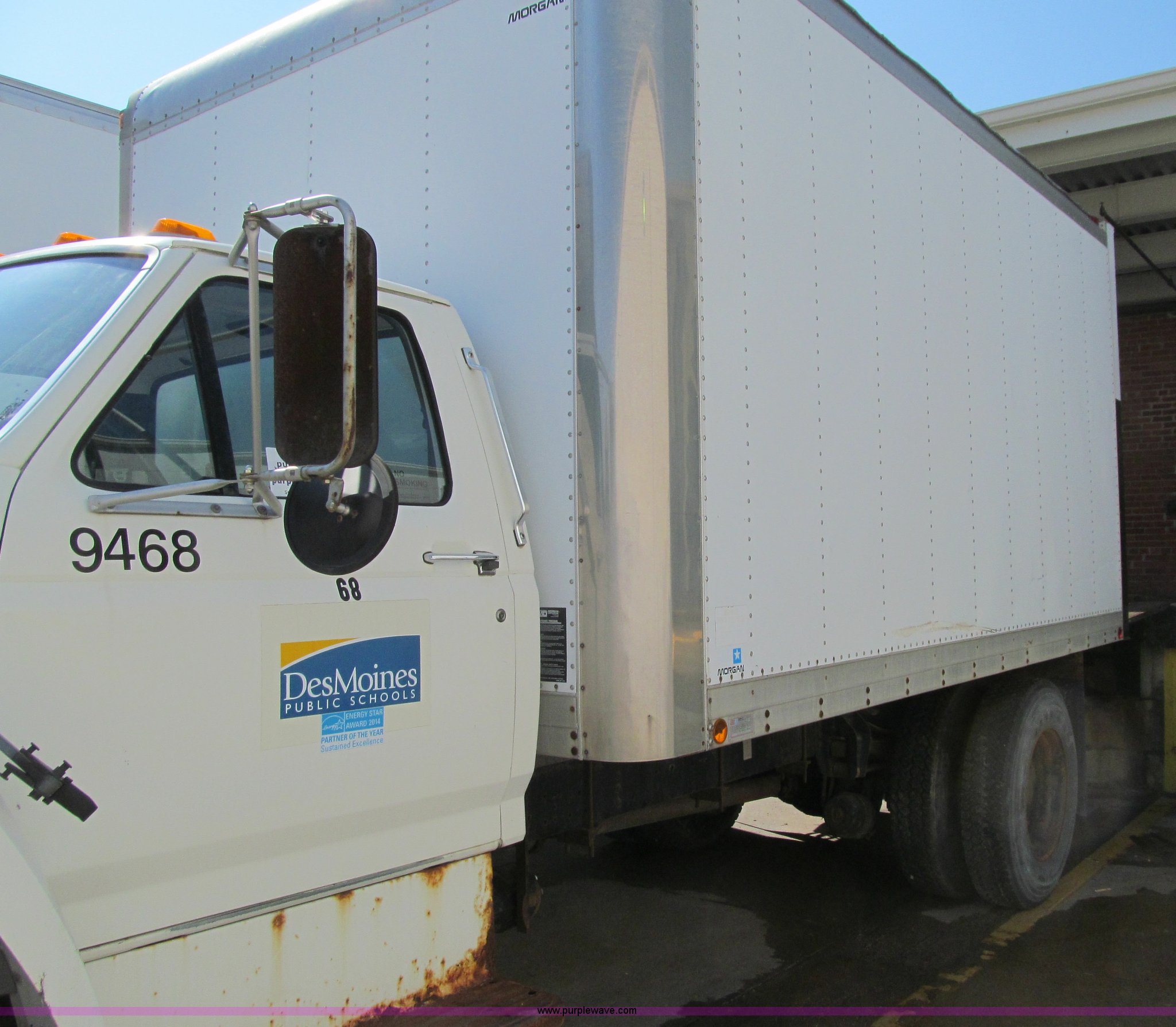 1994 Ford F700 box truck. 95,942 miles on odometer Miles may vary, still in use, Cummins ISB 5.9L L6 turbo diesel engine 175 HP, Automatic transmission, Heat, Block heater, Morgan GVSD08514096 box 14.5'L x 8'W, Wood floor, Swing side door, Roll up rear door, Level lift hydraulic tailgate, Serial 877002, Bendix air dryer, Spring suspension, Air brakes, 189" wheelbase, Firestone 10R22.5 front tires, Goodyear 10R22.5 rear tires, GVWR 22,000 lbs, Business band radio not included, Battery box cover missing, Box contents not included, Unit# 9468. Seller is a government entity who will be assigning and distributing the title. Please contact the seller for distribution questions. 1FDWK74C0RVA43220. Des Moines Public Schools. 1225 Second Avenue. Des Moines, IA 50310