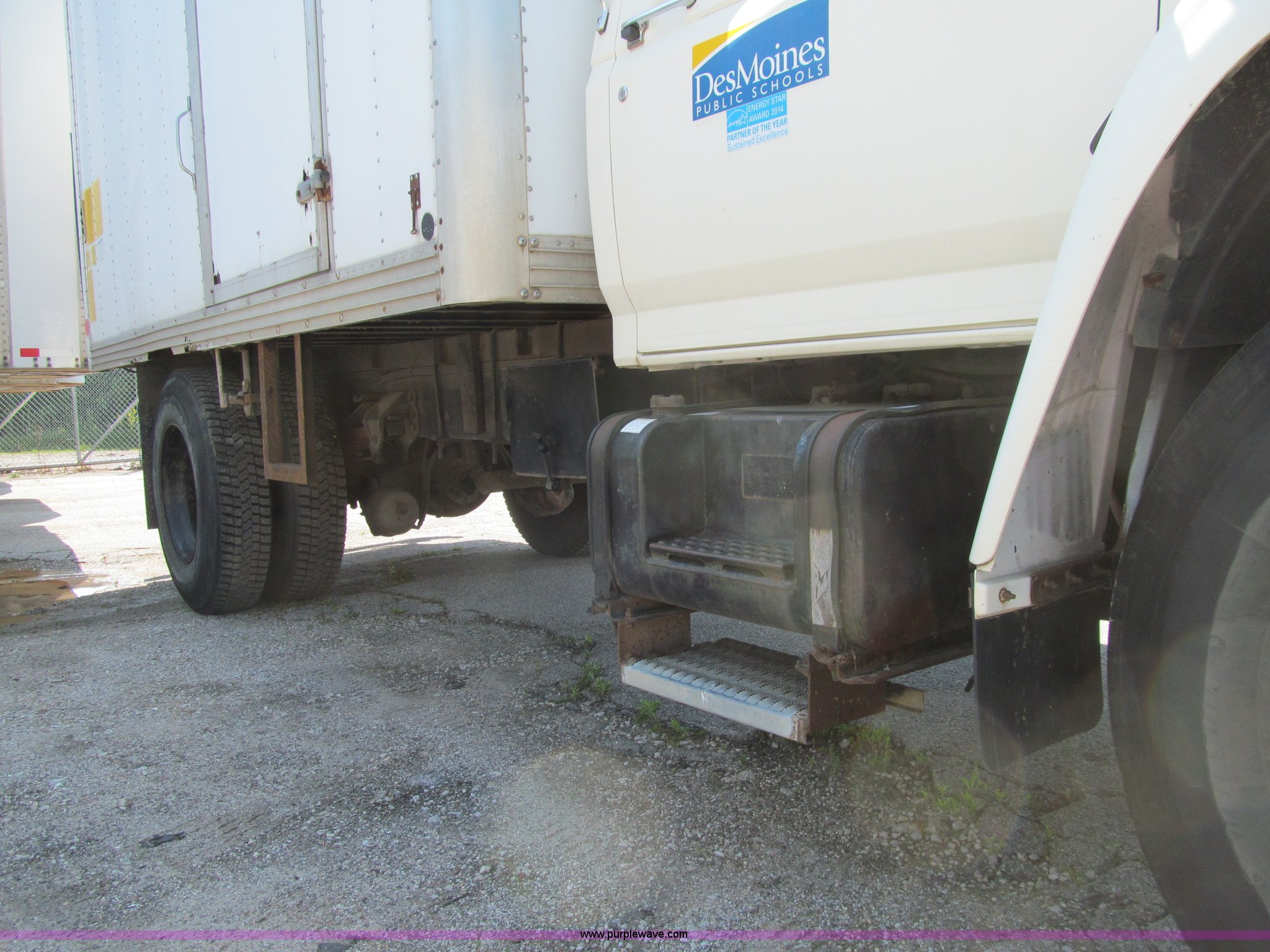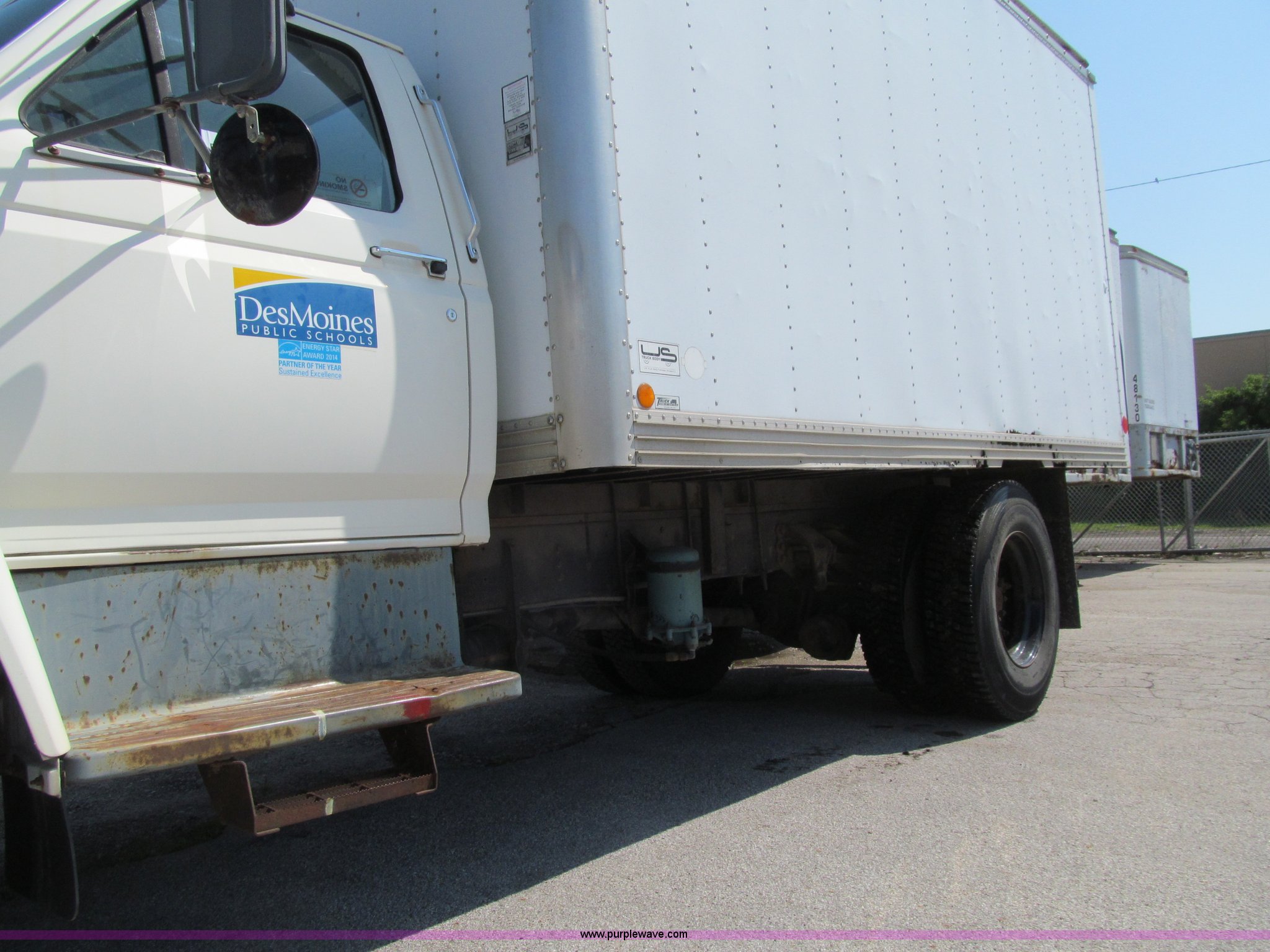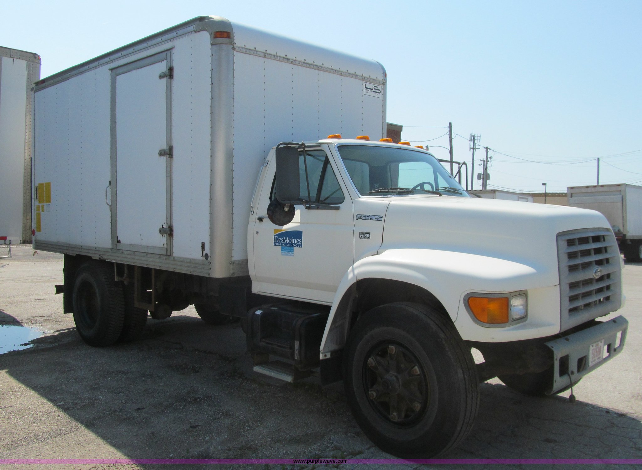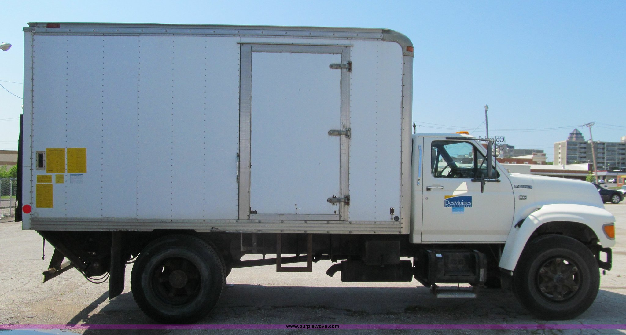 1998 Ford F800 box truck. 101,878 miles on odometer Miles may vary, still in use, Cummins ISB 5.9L L6 diesel engine, Automatic transmission, Heat, Backup alarm, Block heater, US Truck box 14.5'L x 8'W, Wood floor, Translucent box roof, Swing side door, Roll up rear door, Level lift hydraulic tailgate 4,400 lbs capacity, Serial MW9371, Spring suspension, Air brakes, 178" wheelbase, Firestone 11R22.5 tires, GVWR 26,000 lbs, Business band radio not included, Oil leak at front of engine, Right side cosmetic damage, Unit# 9738. Seller is a government entity who will be assigning and distributing the title. Please contact the seller for distribution questions. 1FDWF80C0WVA07054. Des Moines Public Schools. 1225 Second Avenue. Des Moines, IA 50310