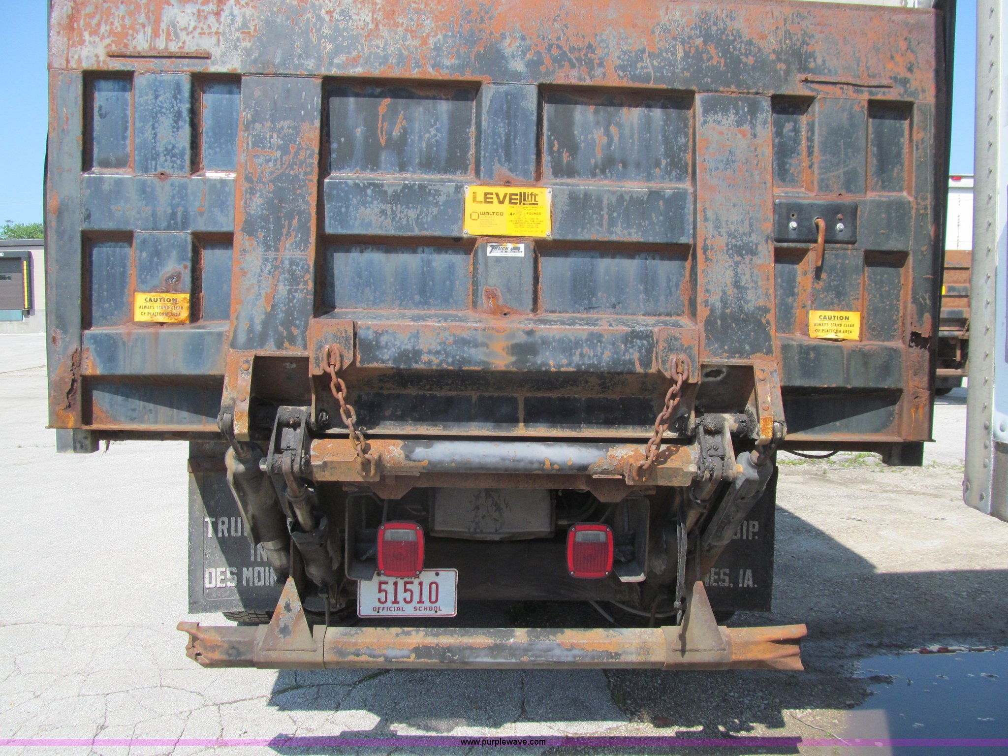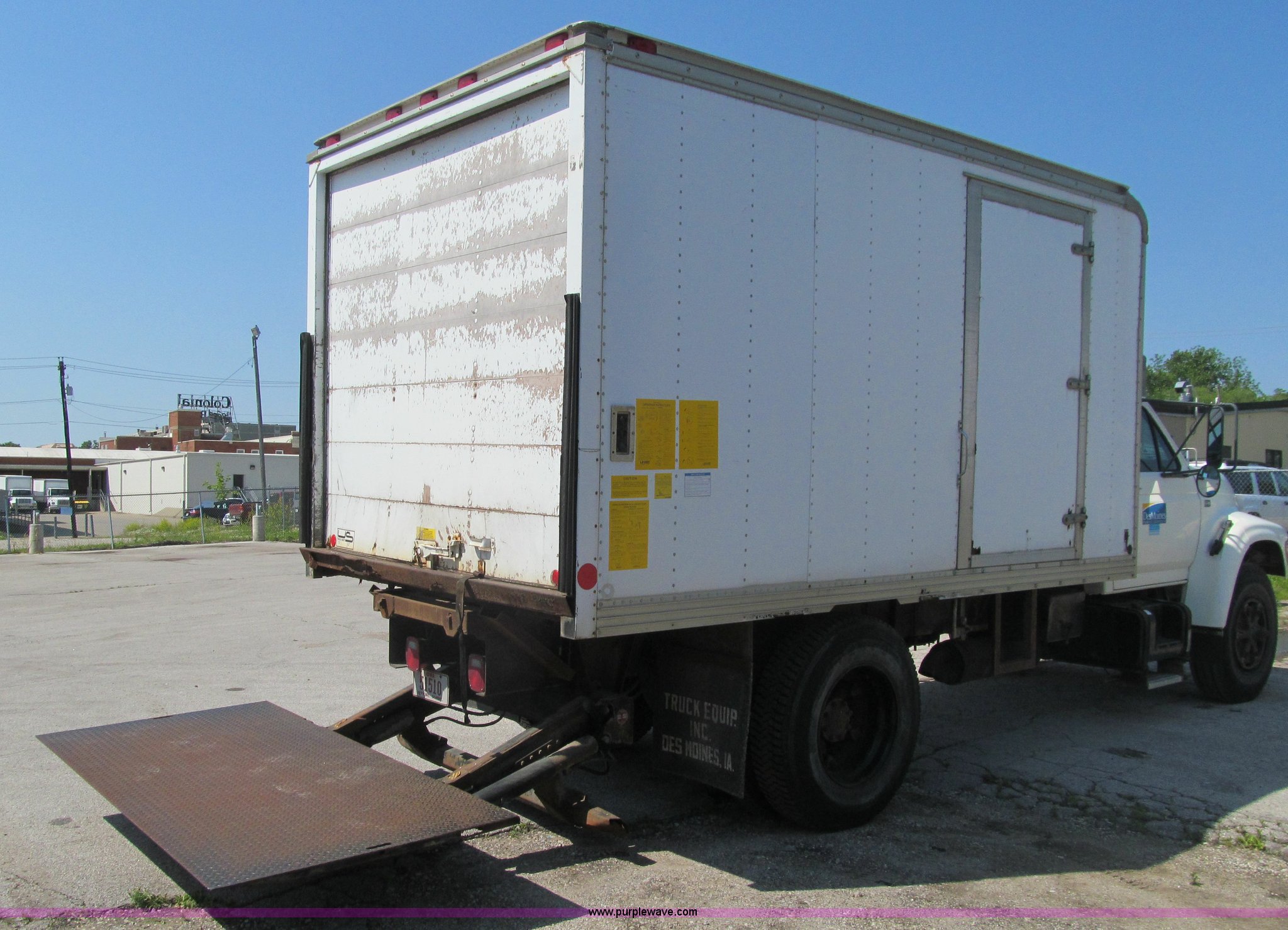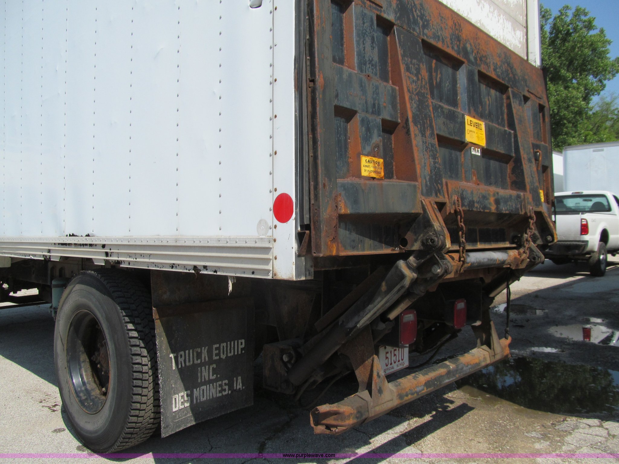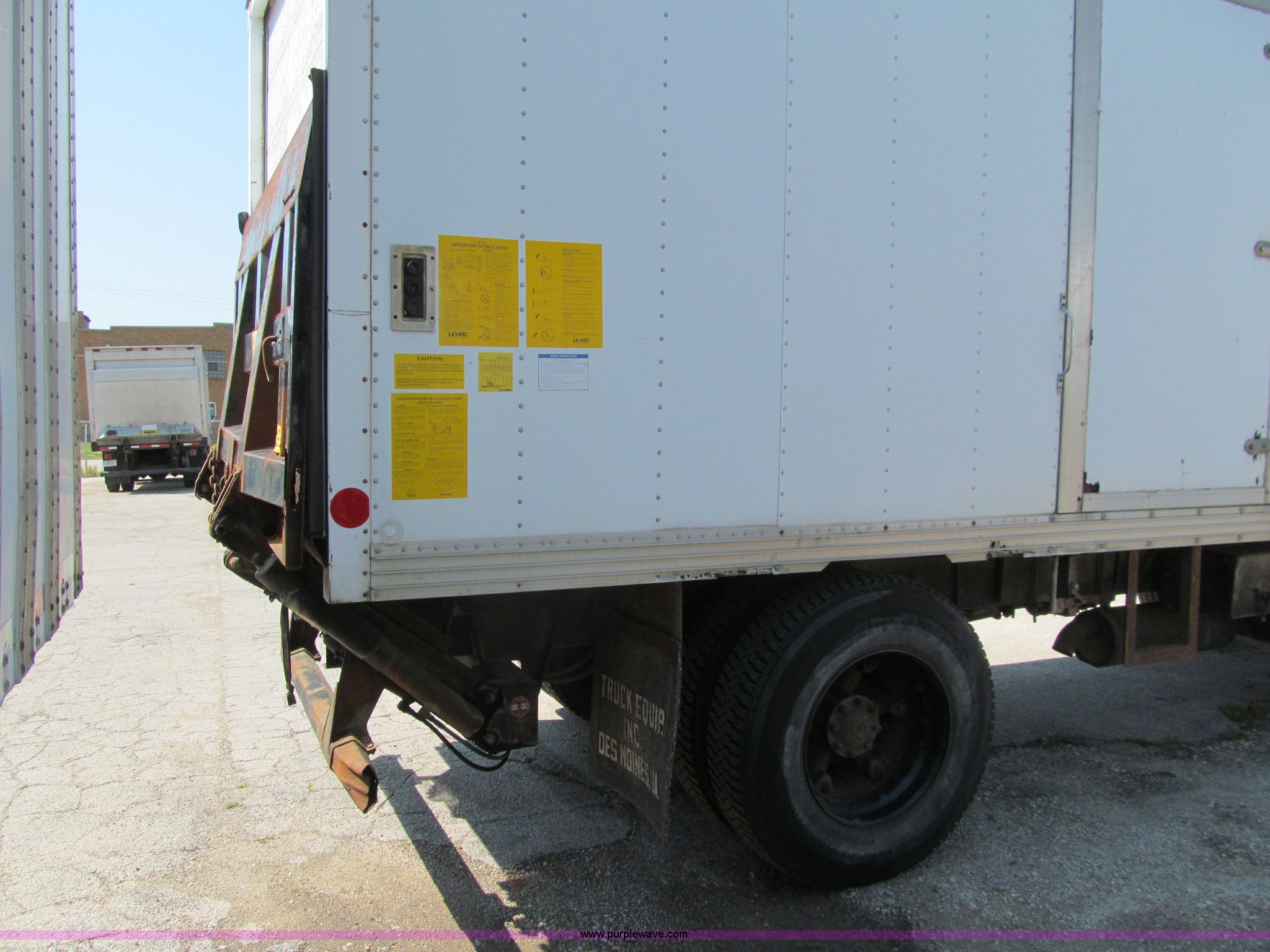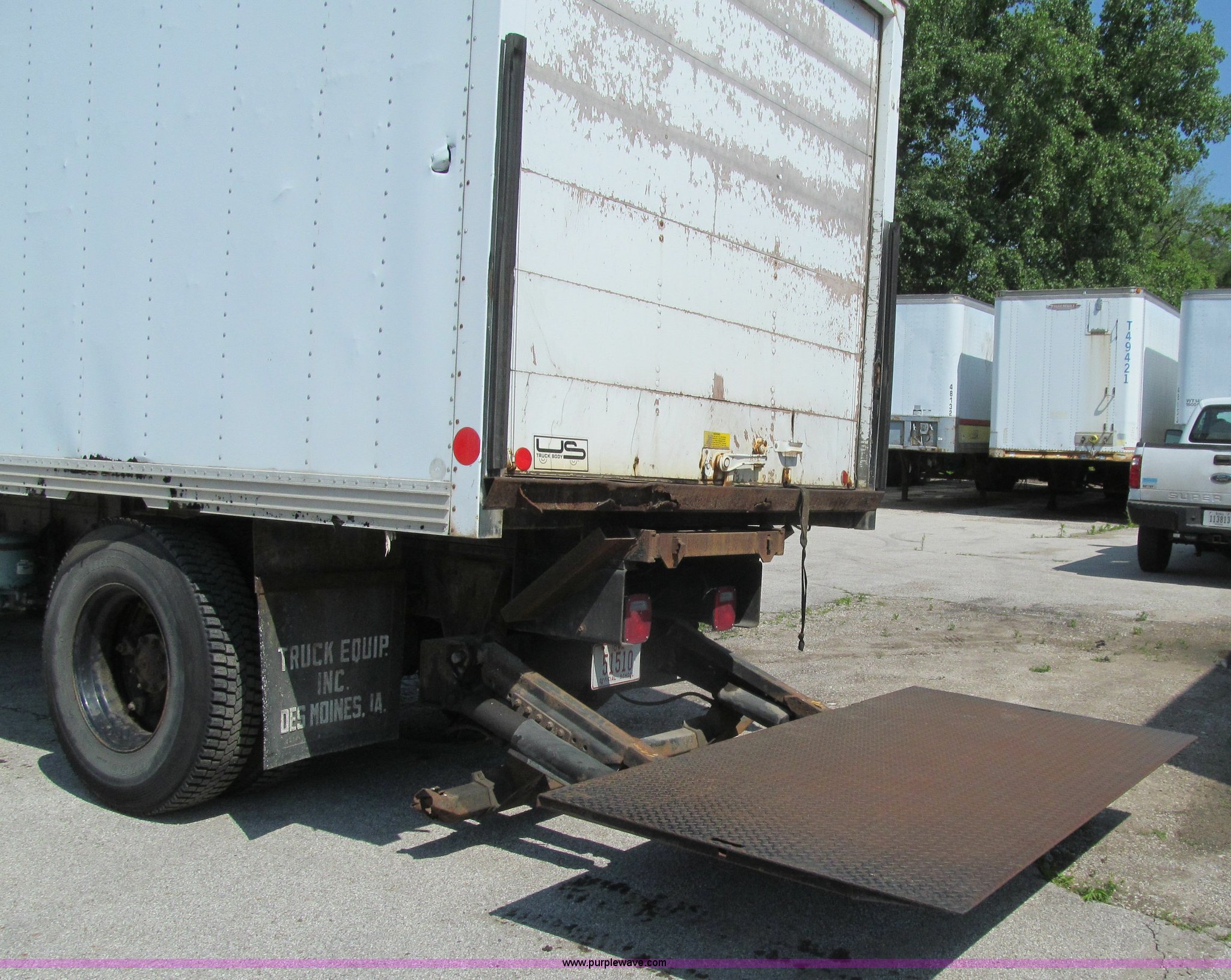 1998 Ford F800 box truck. 101,878 miles on odometer Miles may vary, still in use, Cummins ISB 5.9L L6 diesel engine, Automatic transmission, Heat, Backup alarm, Block heater, US Truck box 14.5'L x 8'W, Wood floor, Translucent box roof, Swing side door, Roll up rear door, Level lift hydraulic tailgate 4,400 lbs capacity, Serial MW9371, Spring suspension, Air brakes, 178" wheelbase, Firestone 11R22.5 tires, GVWR 26,000 lbs, Business band radio not included, Oil leak at front of engine, Right side cosmetic damage, Unit# 9738. Seller is a government entity who will be assigning and distributing the title. Please contact the seller for distribution questions. 1FDWF80C0WVA07054. Des Moines Public Schools. 1225 Second Avenue. Des Moines, IA 50310