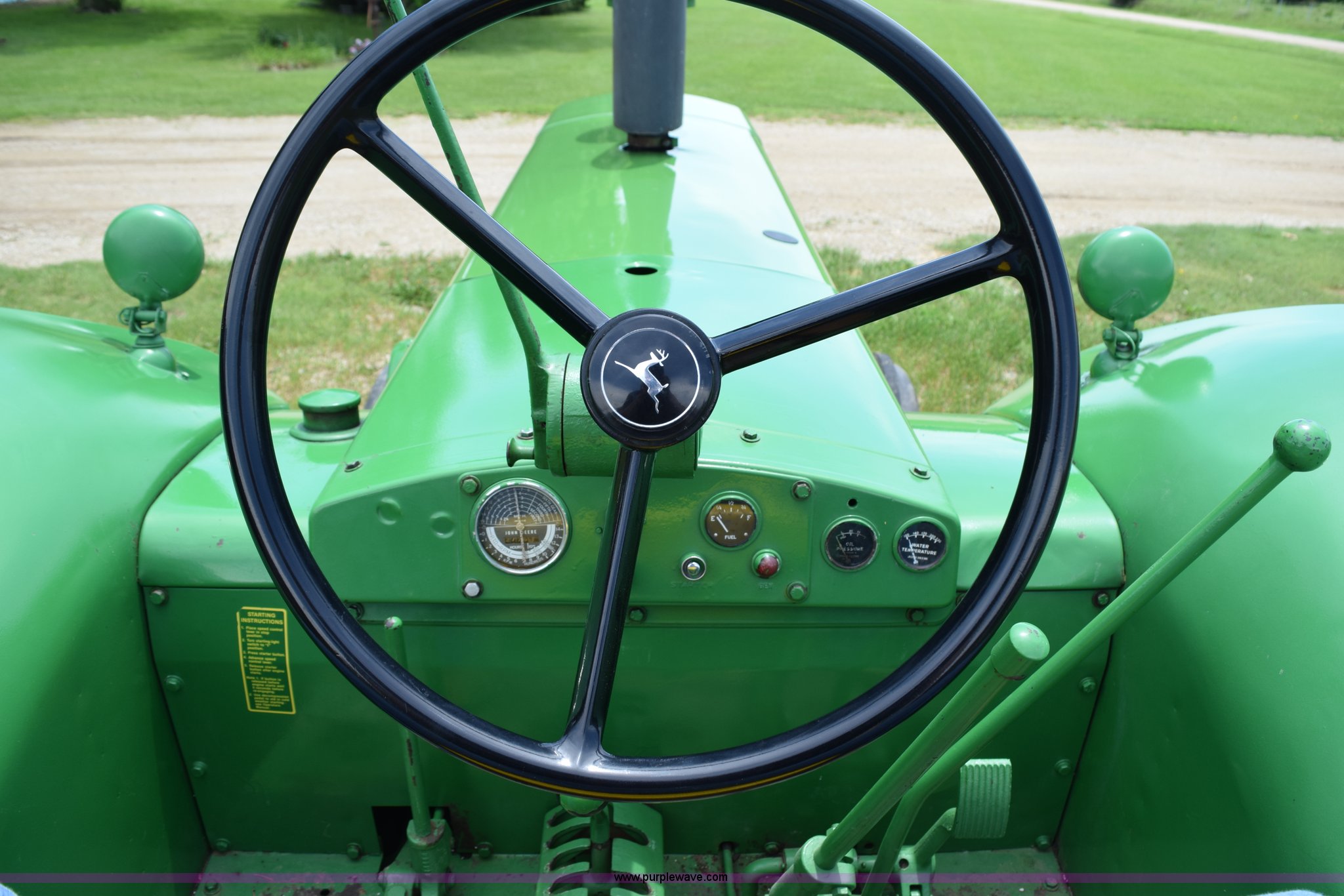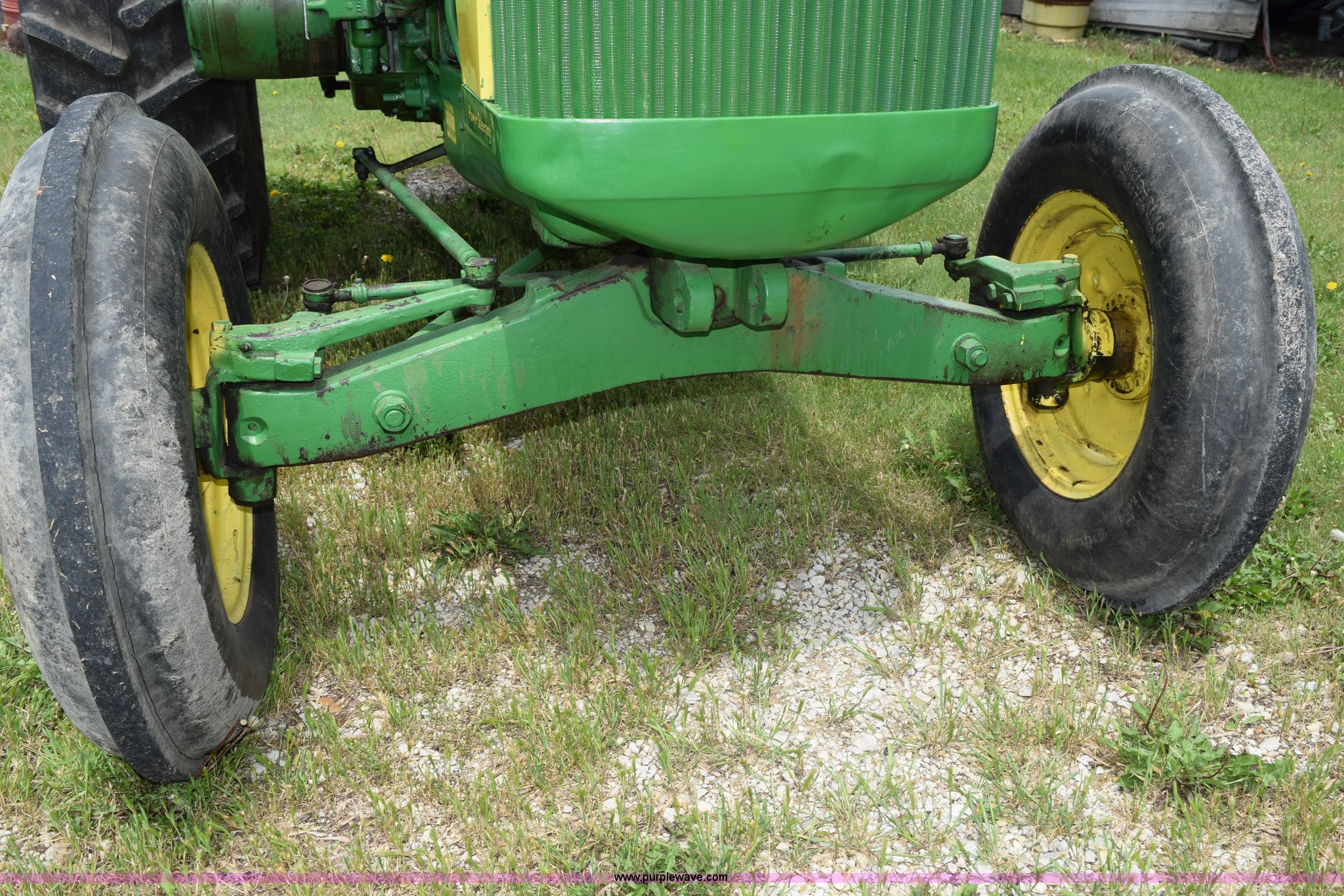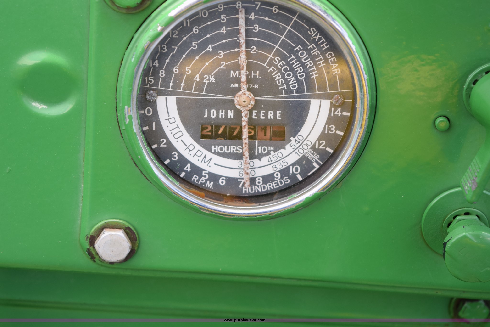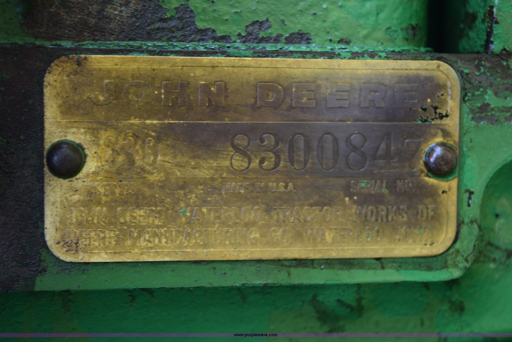 Purple Wave is selling a used Tractor in Kansas. This item is a 1959 John Deere 830 tractor with the following: 2,776 hours on meter, John Deere two cylinder diesel engine, Manual transmission, 6F-1R gears, Direct start, Power steering, Suspension seat, 540 PTO, Rear hydraulic remote set, Recently rebuilt remote, (6) wheel weights, 7.50-18 front tires, 18.4-34 rear tires, Recently replaced rear tires, Serial 8300847