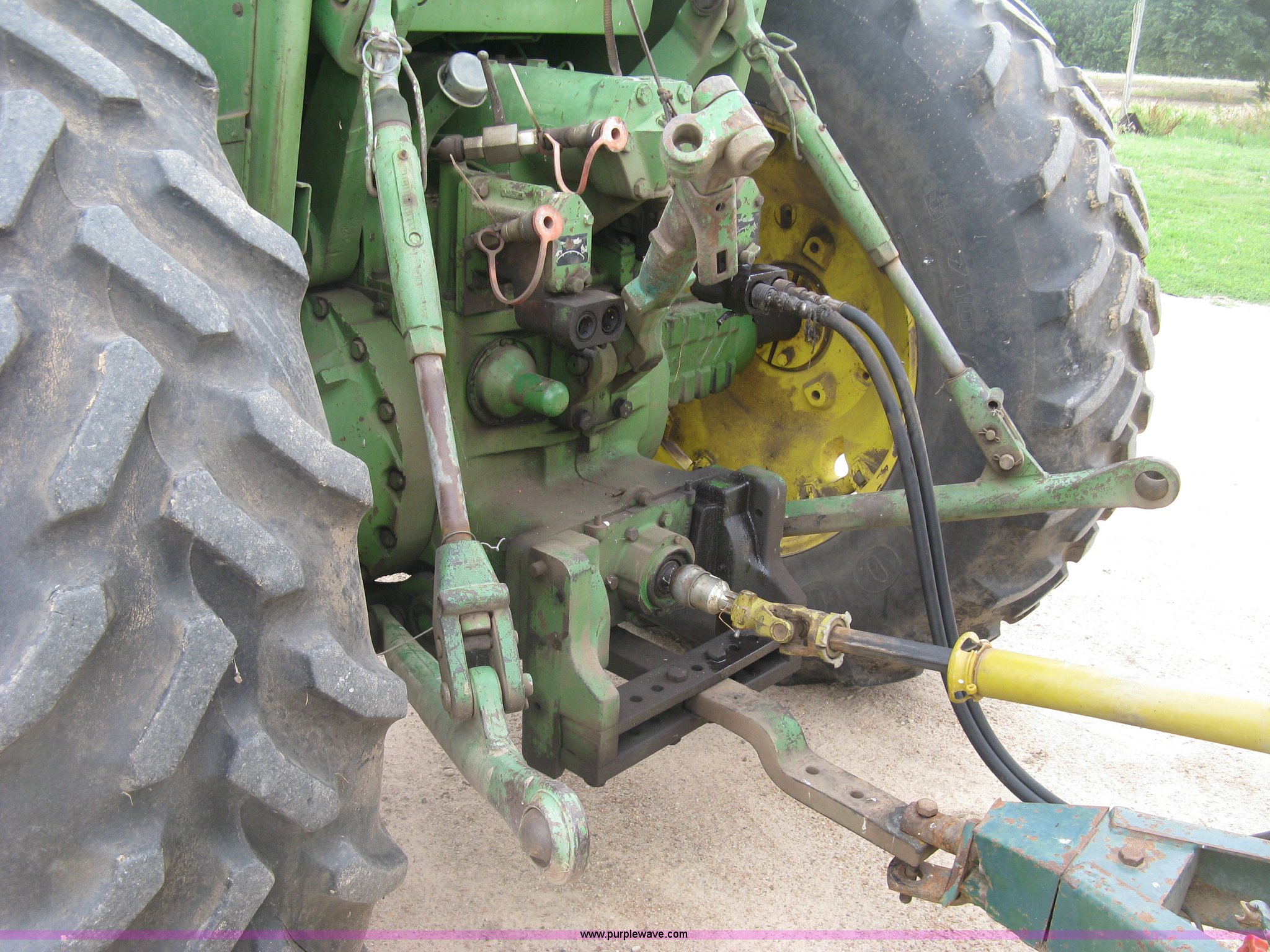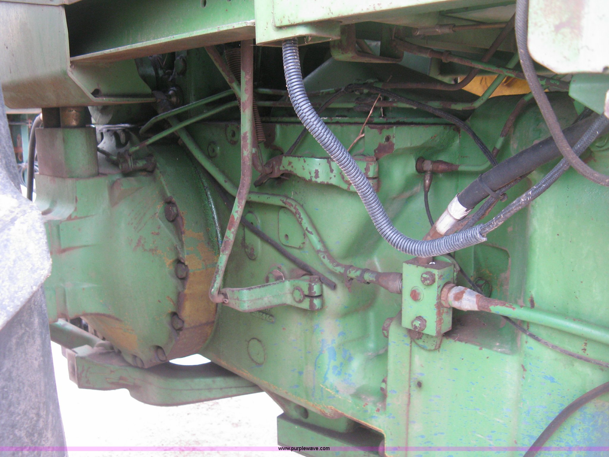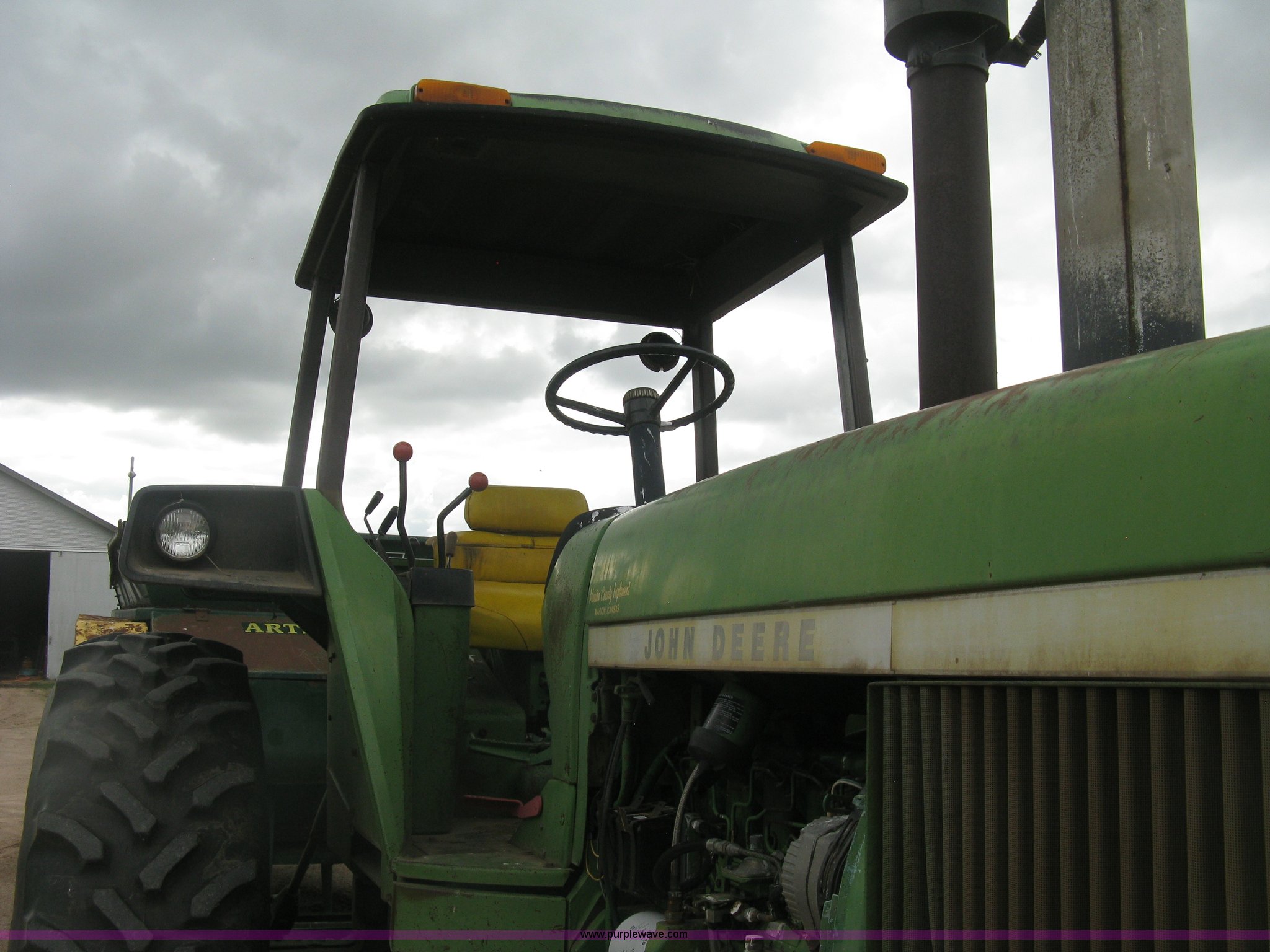 Purple Wave is selling a used Tractor in Kansas. This item is a 1975 John Deere 4630 tractor with the following: 7,983 hours on meter, John Deere 6404AR-12 diesel engine, Serial 442074R, 16F-2R gears, Hard top canopy, Plastic top cracked, Tilt steering wheel, Three point, Top link included, Draw bar, 1000 PTO, (3) rear hydraulic remote sets, 11.00-16SL front tires, 18.4R38 rear tires, 540 PTO adapter not included, Serial 018074R