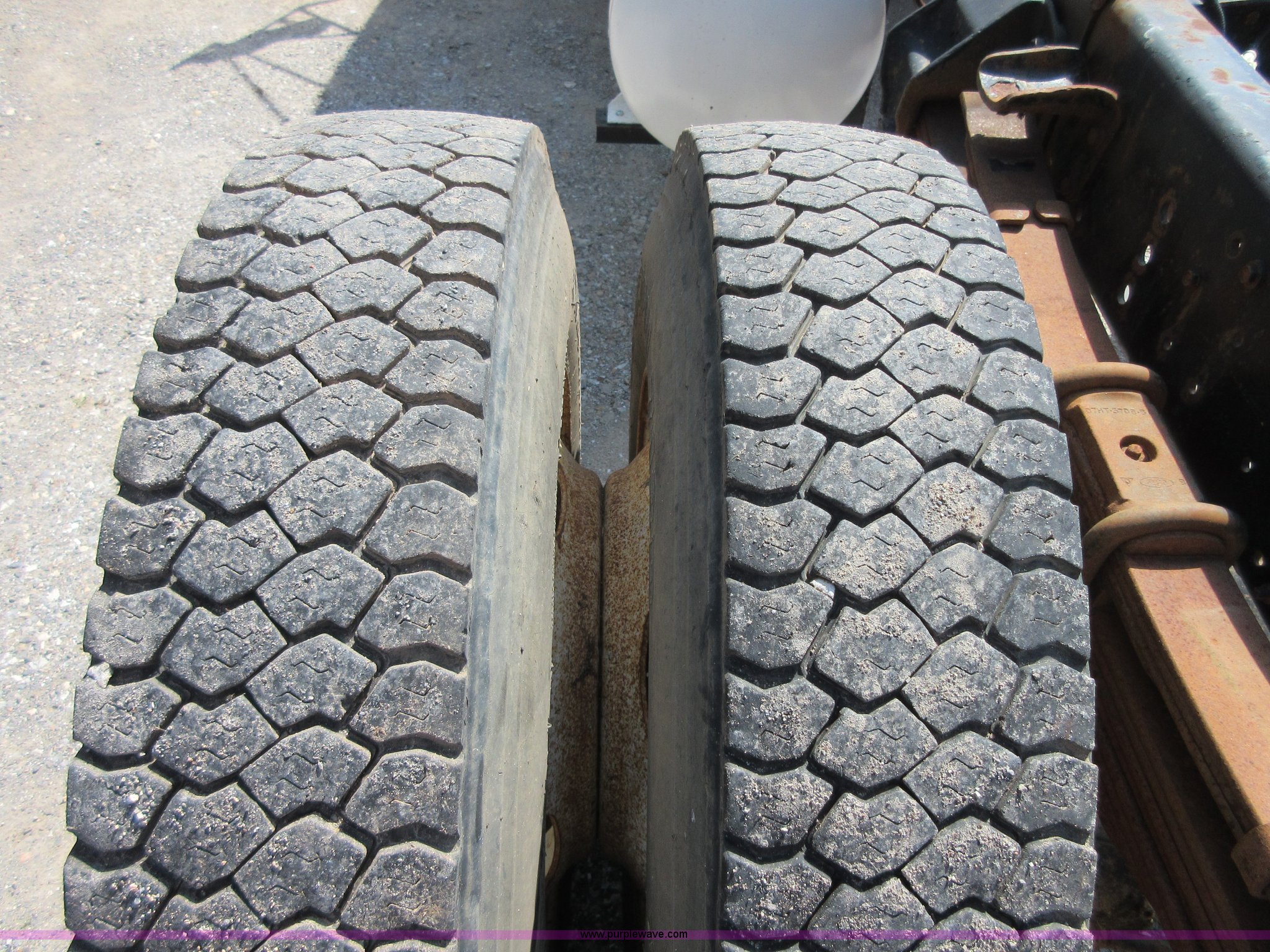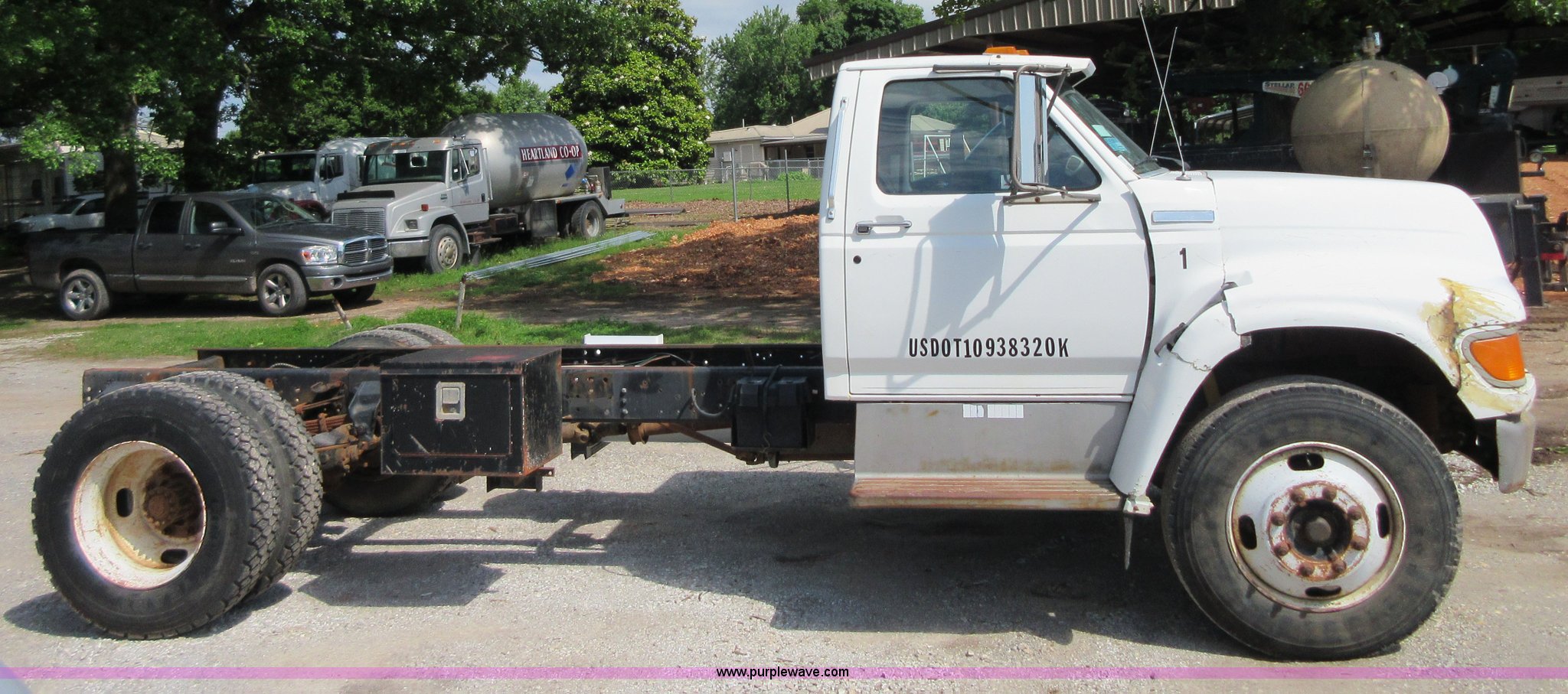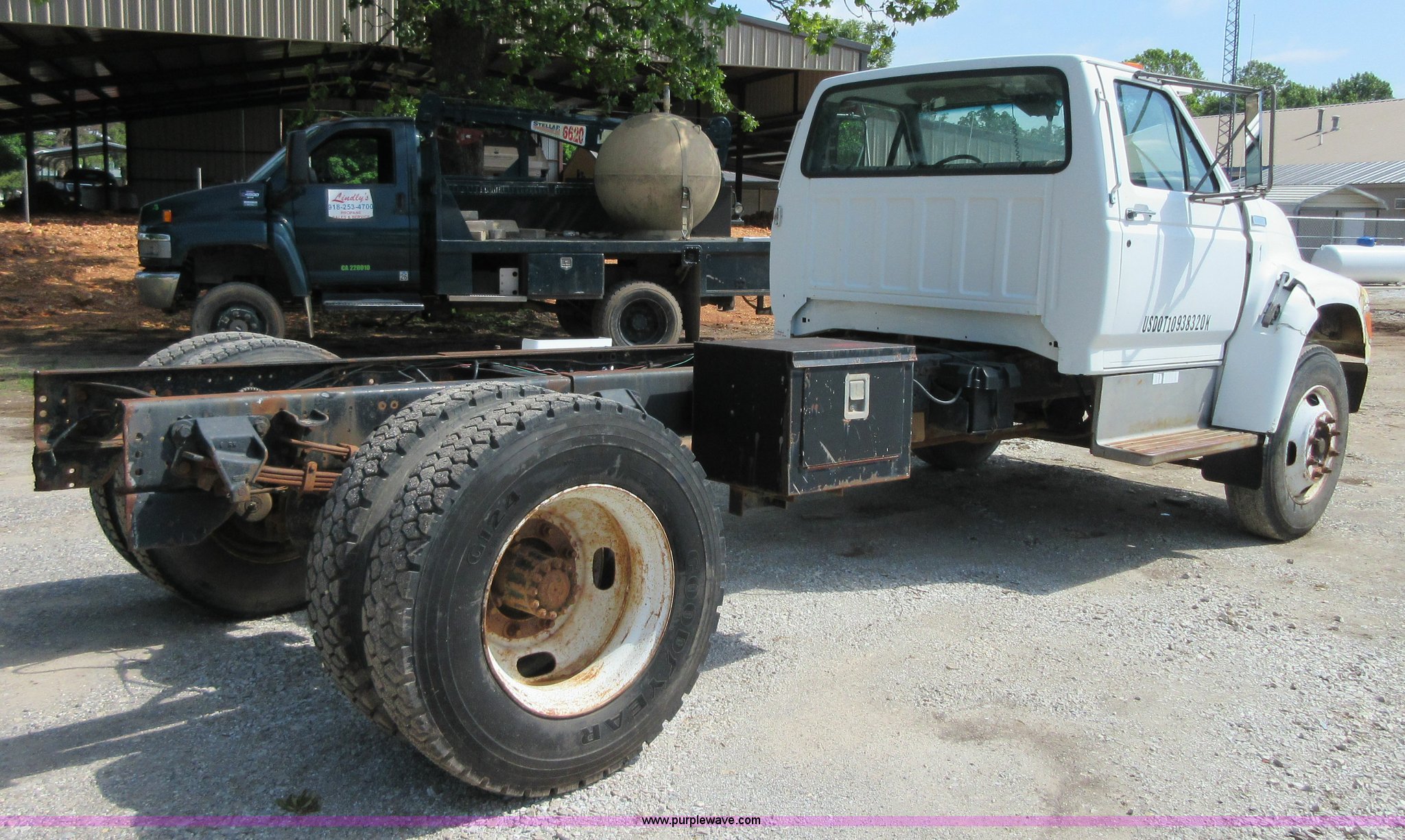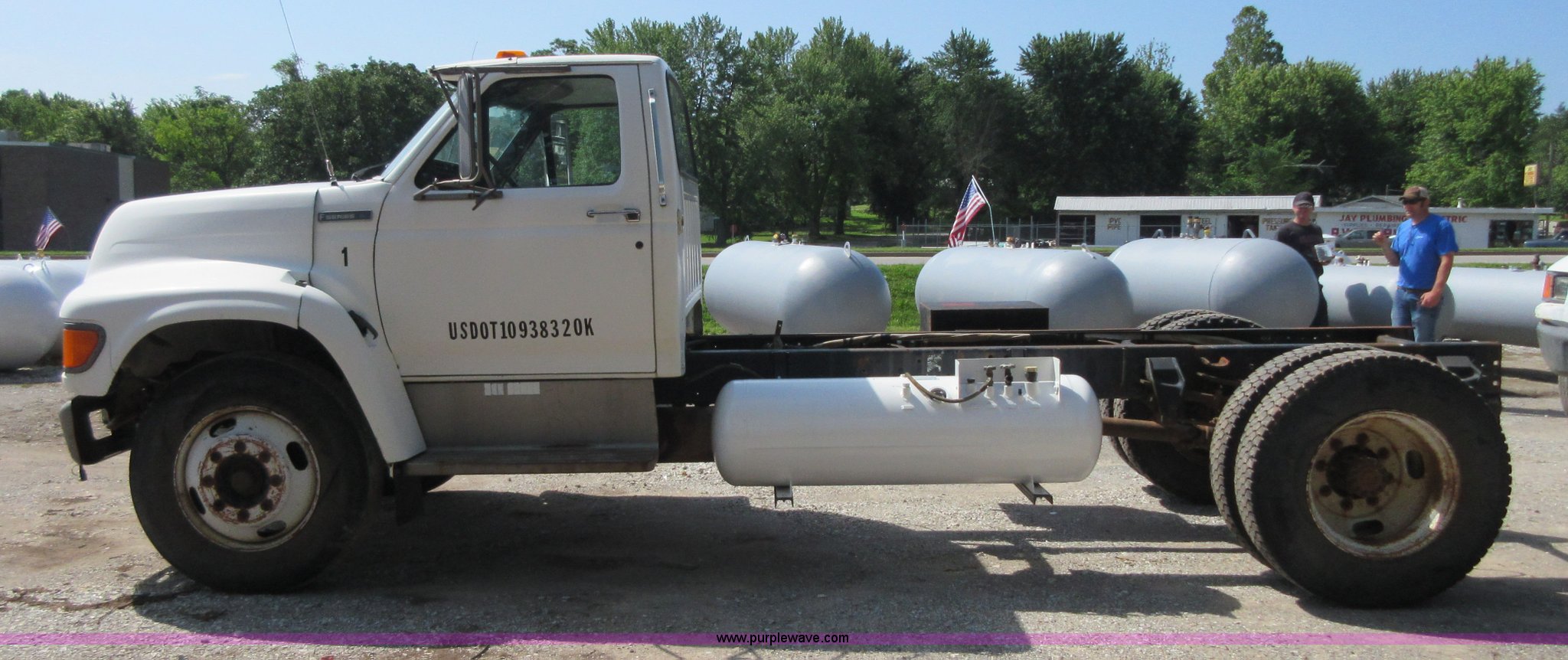Purple Wave is selling a used Truck Chassis in Oklahoma. This item is a 1995 Ford F700 truck cab and chassis with the following: 158,595 miles on odometer, 7.0L V8 propane engine, Five speed manual transmission, Two speed rear end, AC and heat, AC needs charged, AM/FM/cassette, Business band radio, Hand throttle, Block heater, Exterior visor, Front tow hooks, 68 gallon fuel tank, PTO, Spring suspension, Hydraulic brakes, Partial double frame, 177" wheelbase, 10R22.5 tires, GVWR 24,500 lbs, FAWR 7,000 lbs, RAWR 17,500 lbs, Recently replaced batteries, Hood damage, Unit# 1