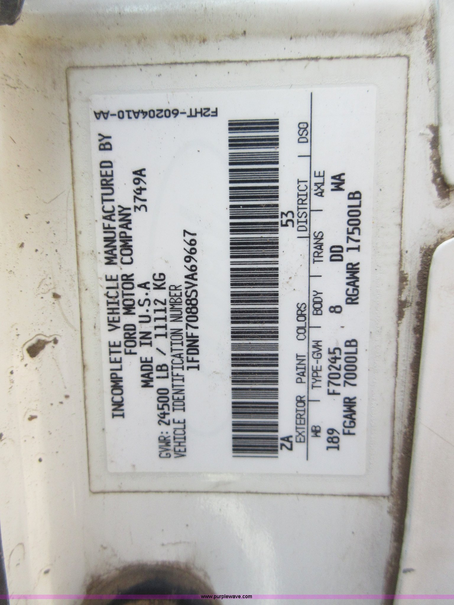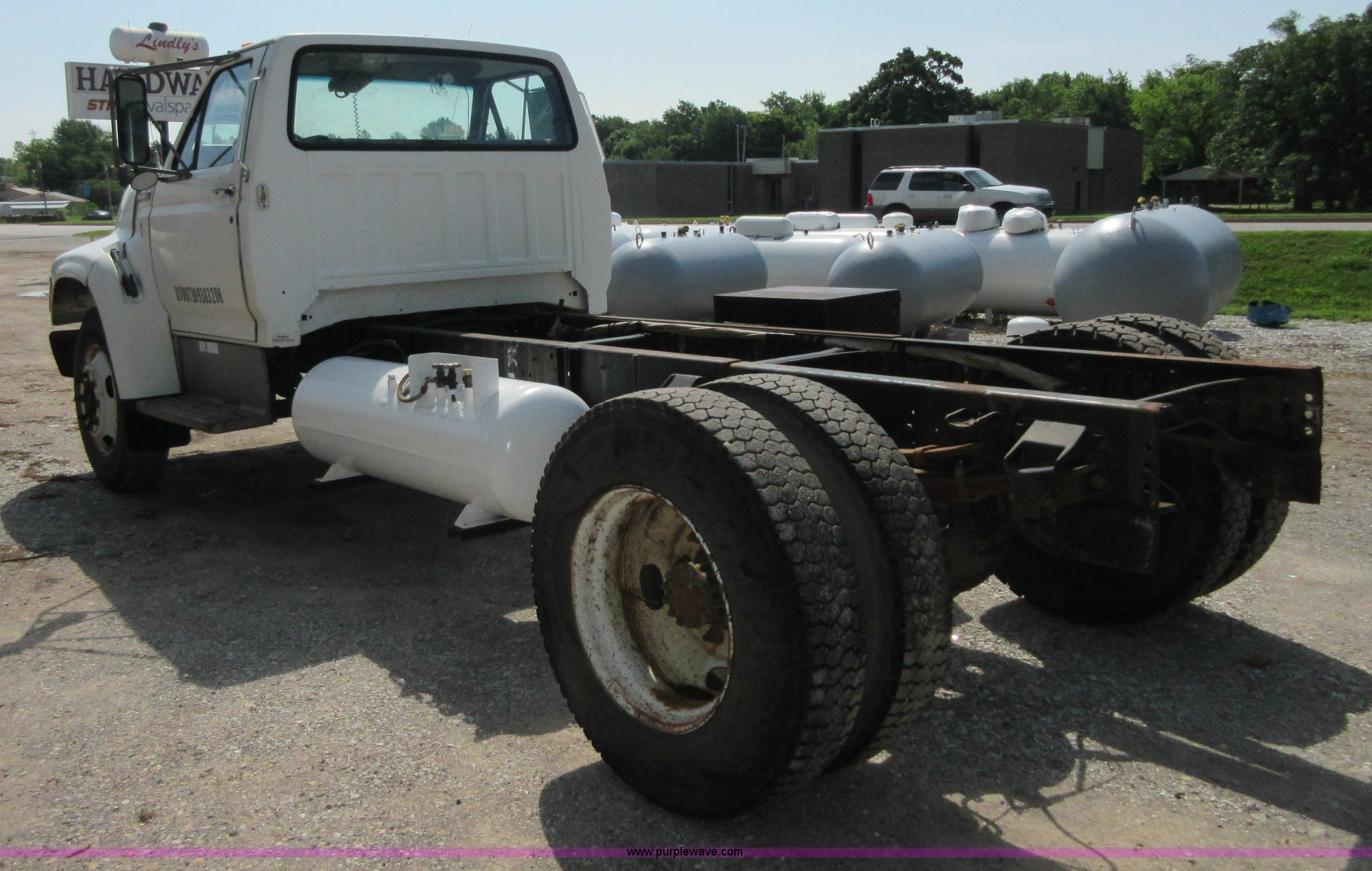 1995 Ford F700 truck cab and chassis. 158,595 miles on odometer, 7.0L V8 propane engine, Five speed manual transmission, Two speed rear end, AC and heat AC needs charged, AM/FM/cassette, Business band radio, Hand throttle, Block heater, Exterior visor, Front tow hooks, 68 gallon fuel tank, PTO, Spring suspension, Hydraulic brakes, Partial double frame, 177" wheelbase, 10R22.5 tires, GVWR 24,500 lbs, FAWR 7,000 lbs, RAWR 17,500 lbs, Recently replaced batteries, Hood damage, Unit# 1. 1FDNF7088SVA69667. View equipment video. Lindly's Inc.. 911 South Main. Jay, OK 74346