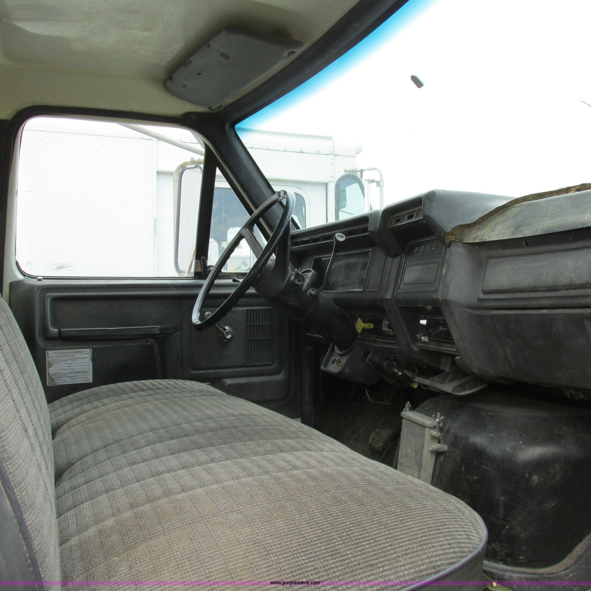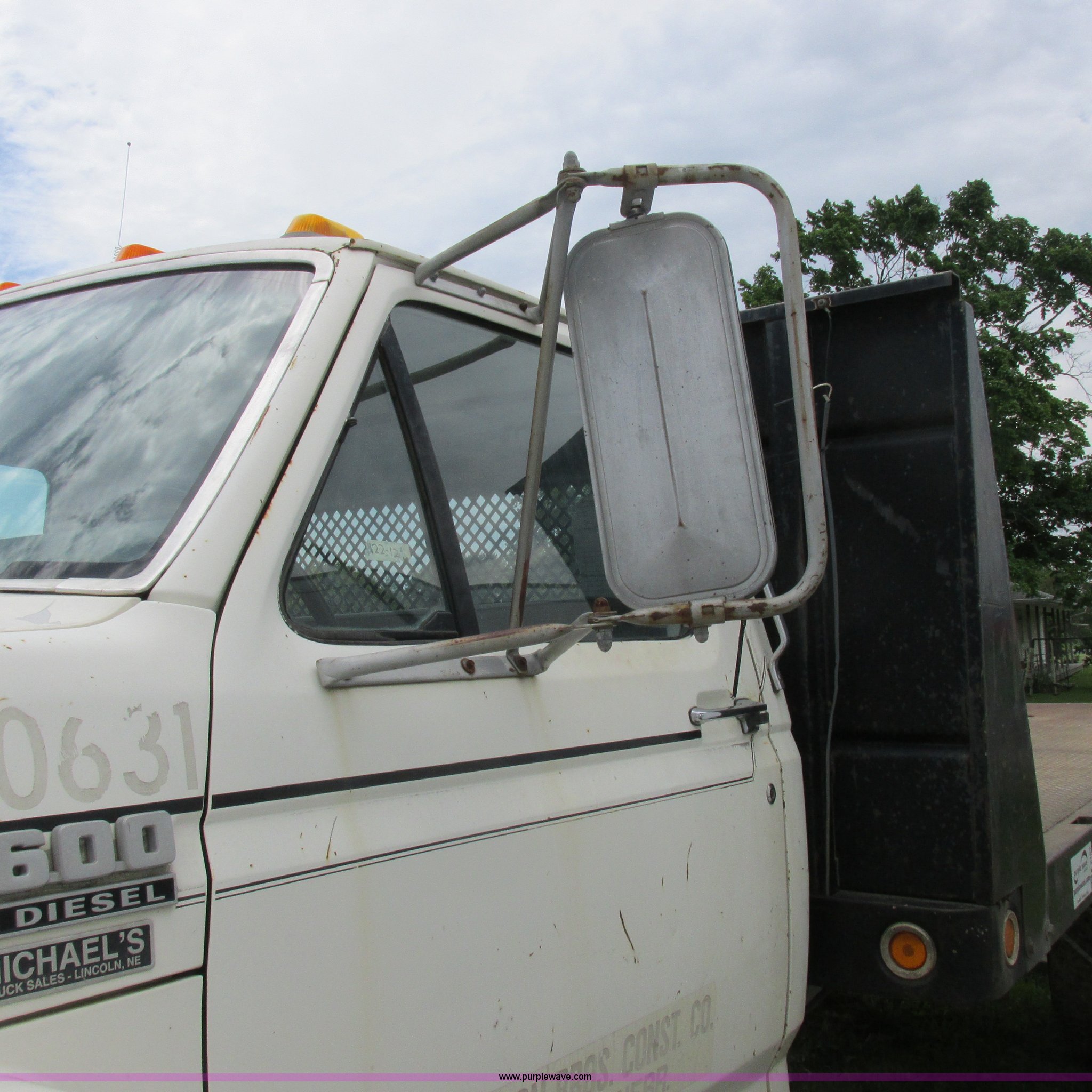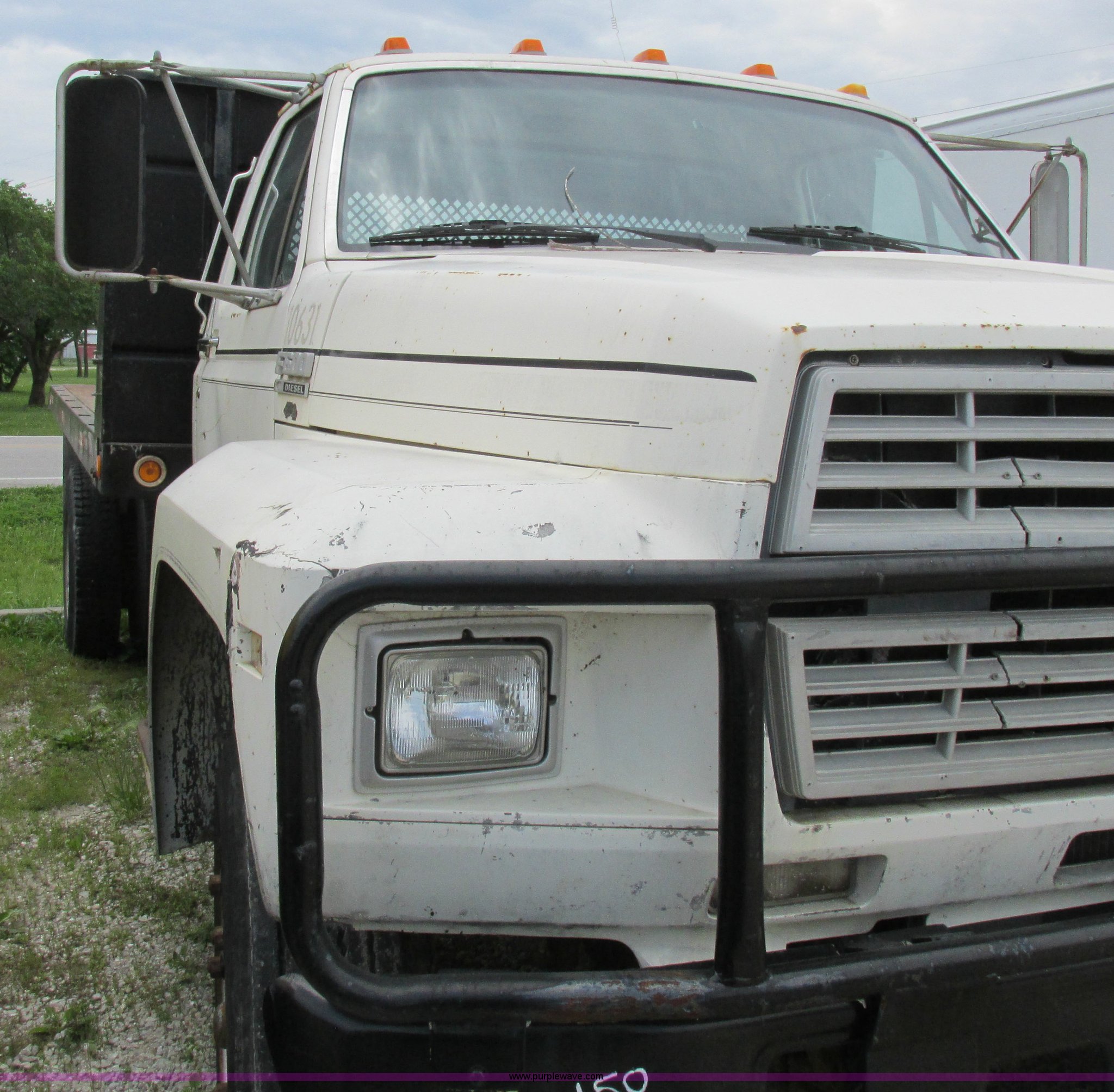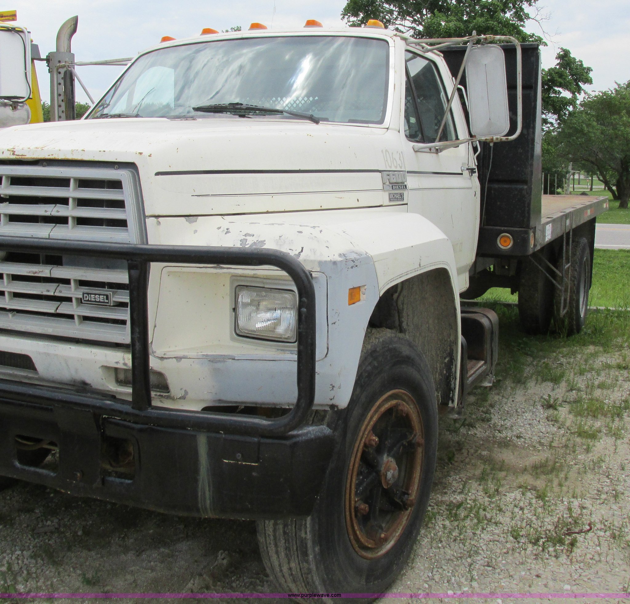 Purple Wave is selling a used Flat Bed Truck in Missouri. This item is a 1988 Ford F600 flatbed truck with the following: 66,907 miles on odometer, 2,540 hours on meter, 6.6L six cylinder diesel engine, Automatic transmission, Heat, Spring suspension seat, 16'L flatbed, Pintle hitch, Trailer wiring, Spring suspension, Hydraulic brakes, 10R22.5 tires, Interior/exterior cosmetic damage