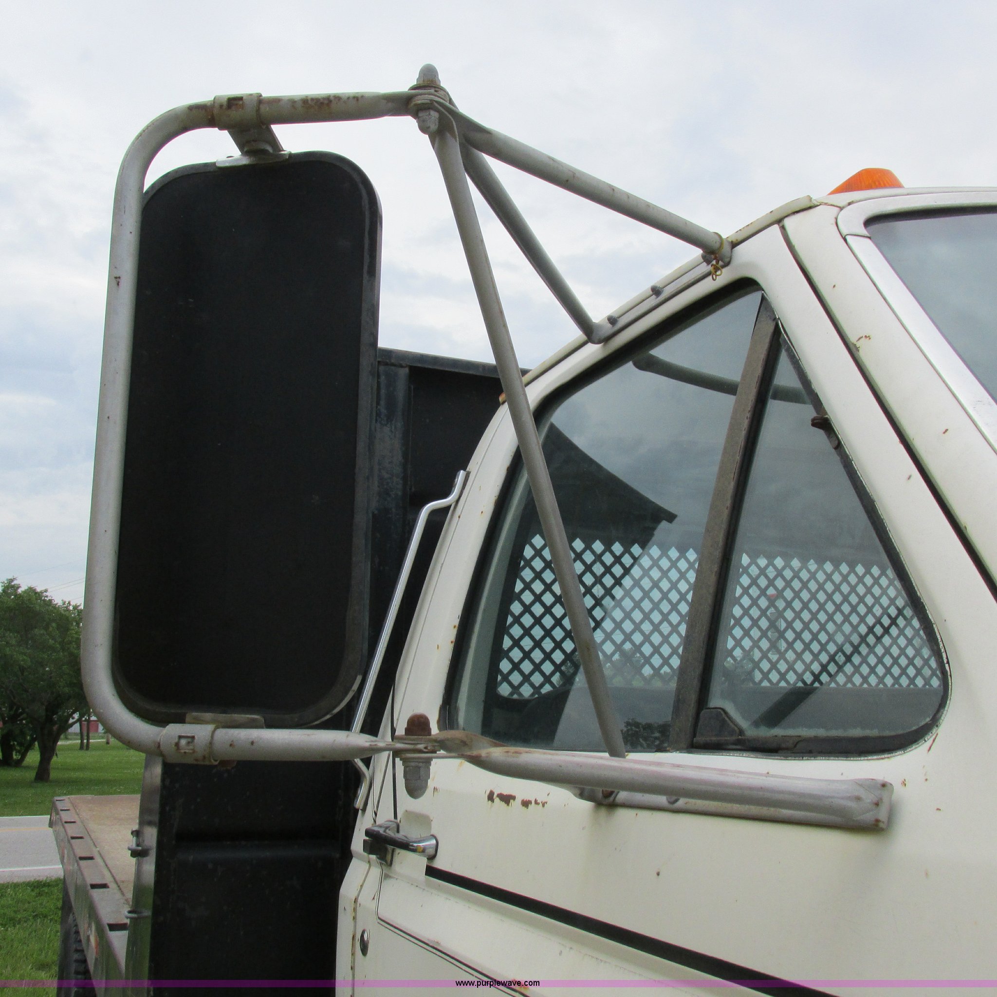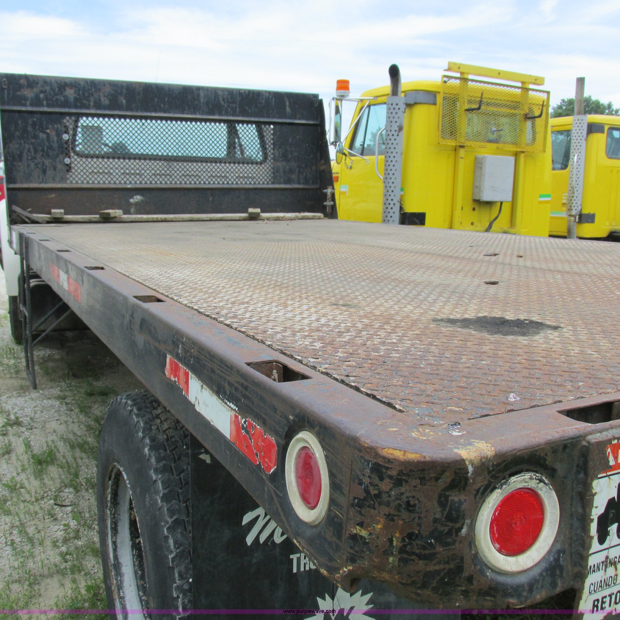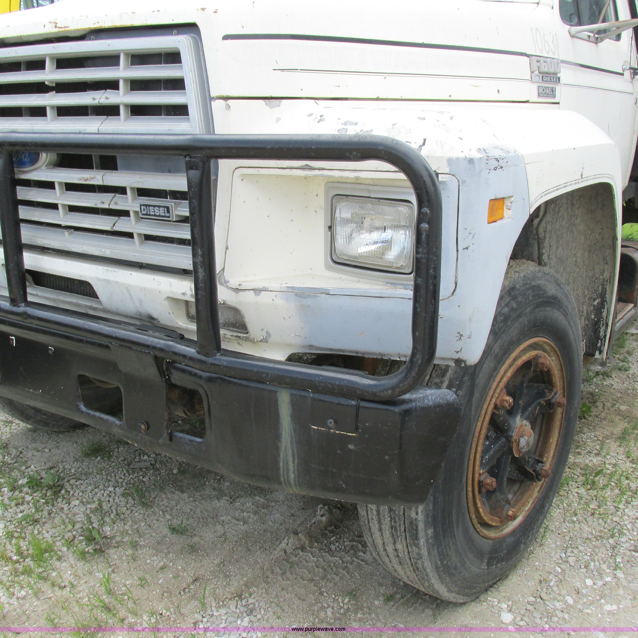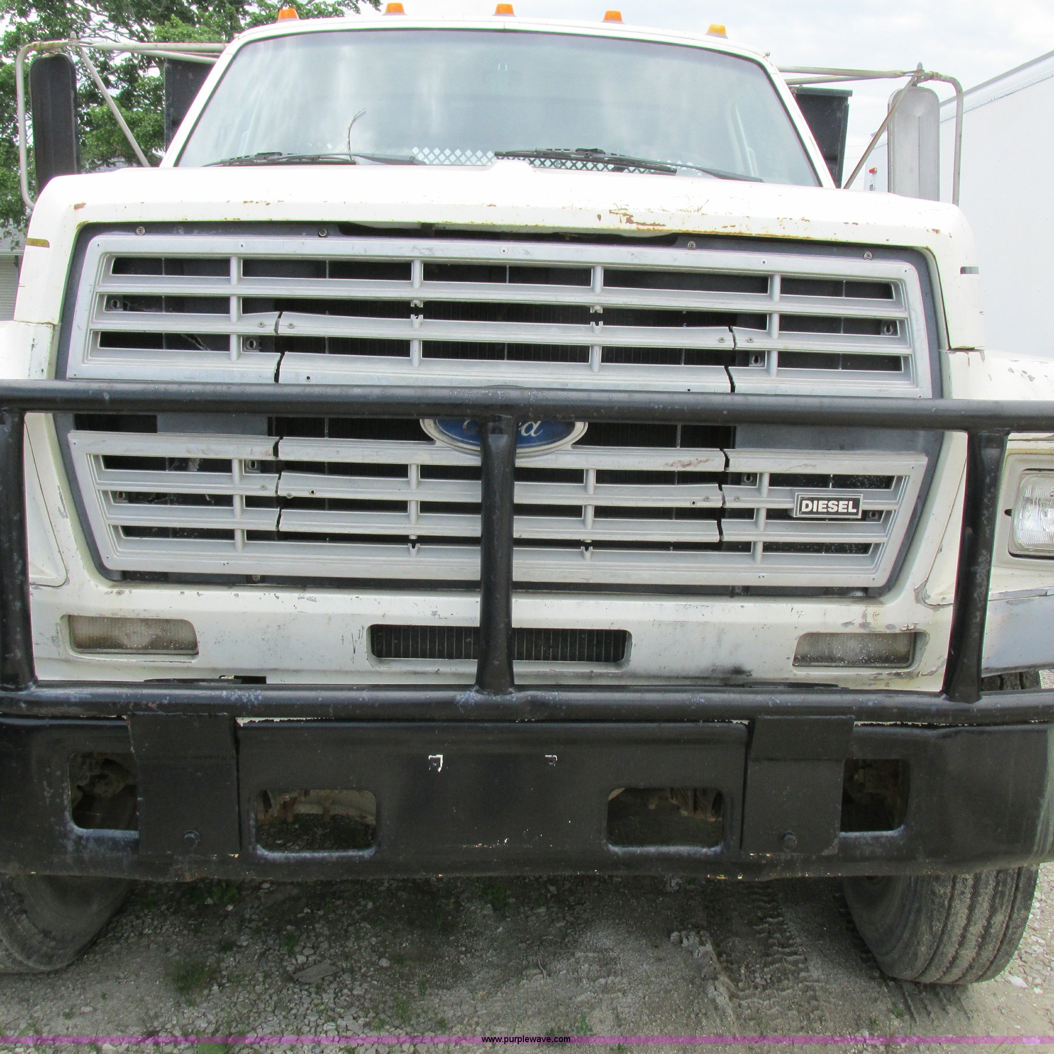 Purple Wave is selling a used Flat Bed Truck in Missouri. This item is a 1988 Ford F600 flatbed truck with the following: 66,907 miles on odometer, 2,540 hours on meter, 6.6L six cylinder diesel engine, Automatic transmission, Heat, Spring suspension seat, 16'L flatbed, Pintle hitch, Trailer wiring, Spring suspension, Hydraulic brakes, 10R22.5 tires, Interior/exterior cosmetic damage