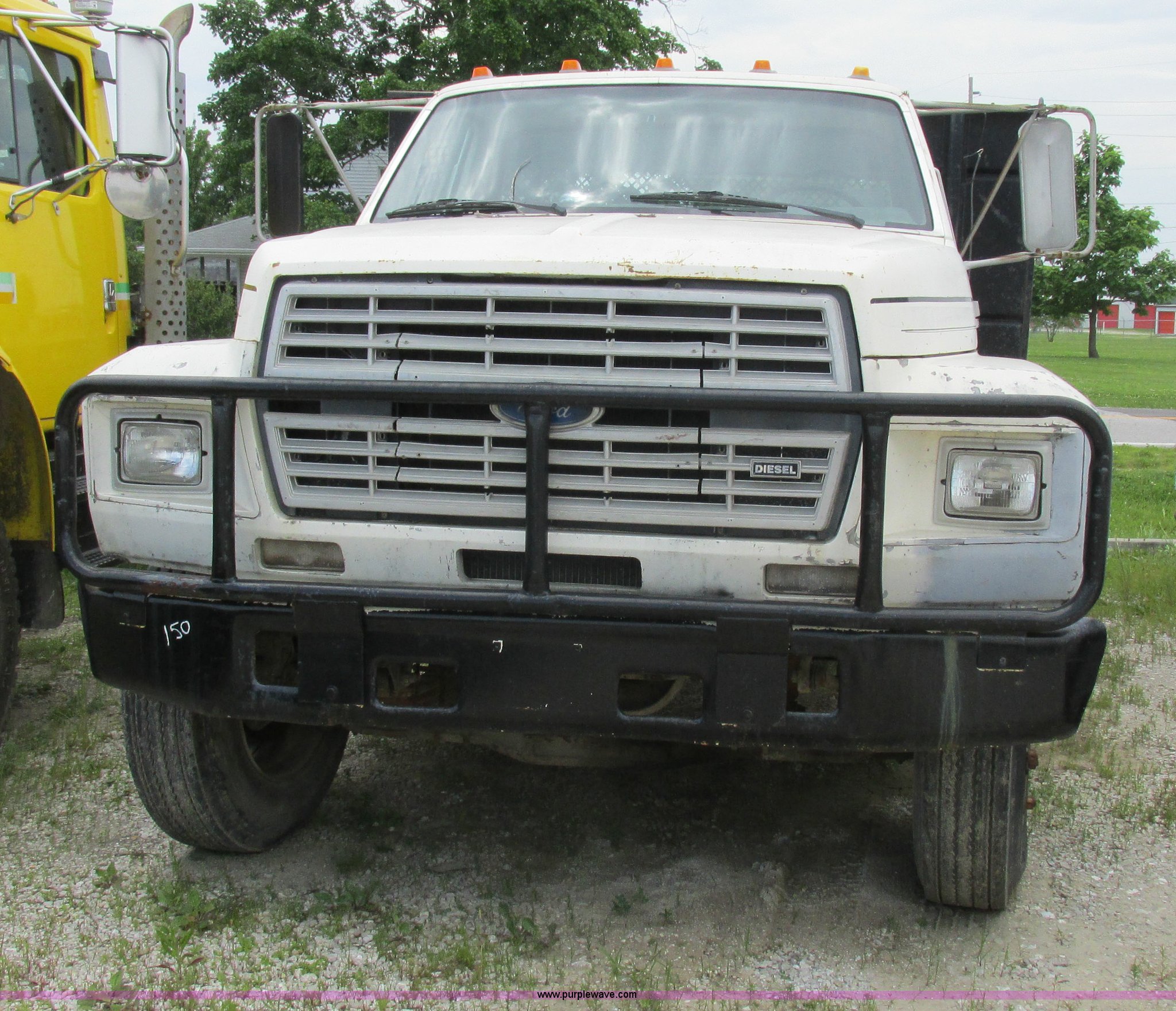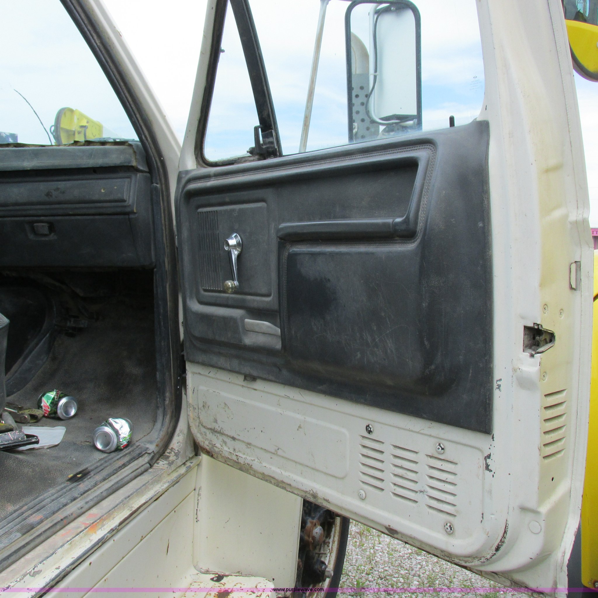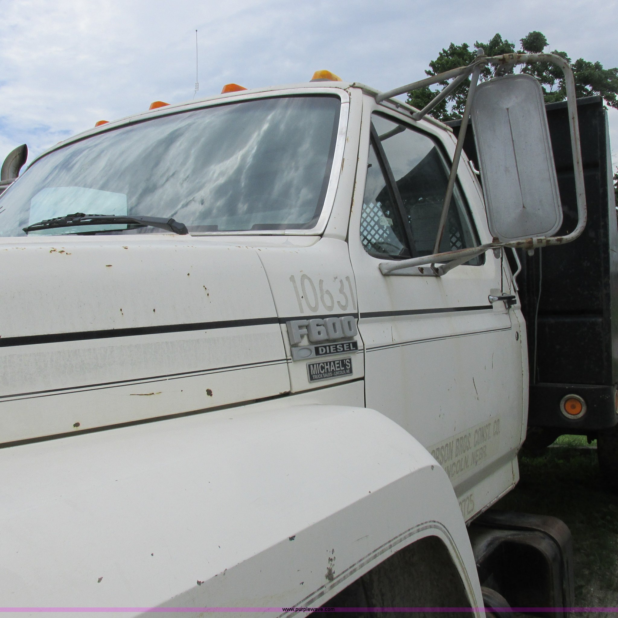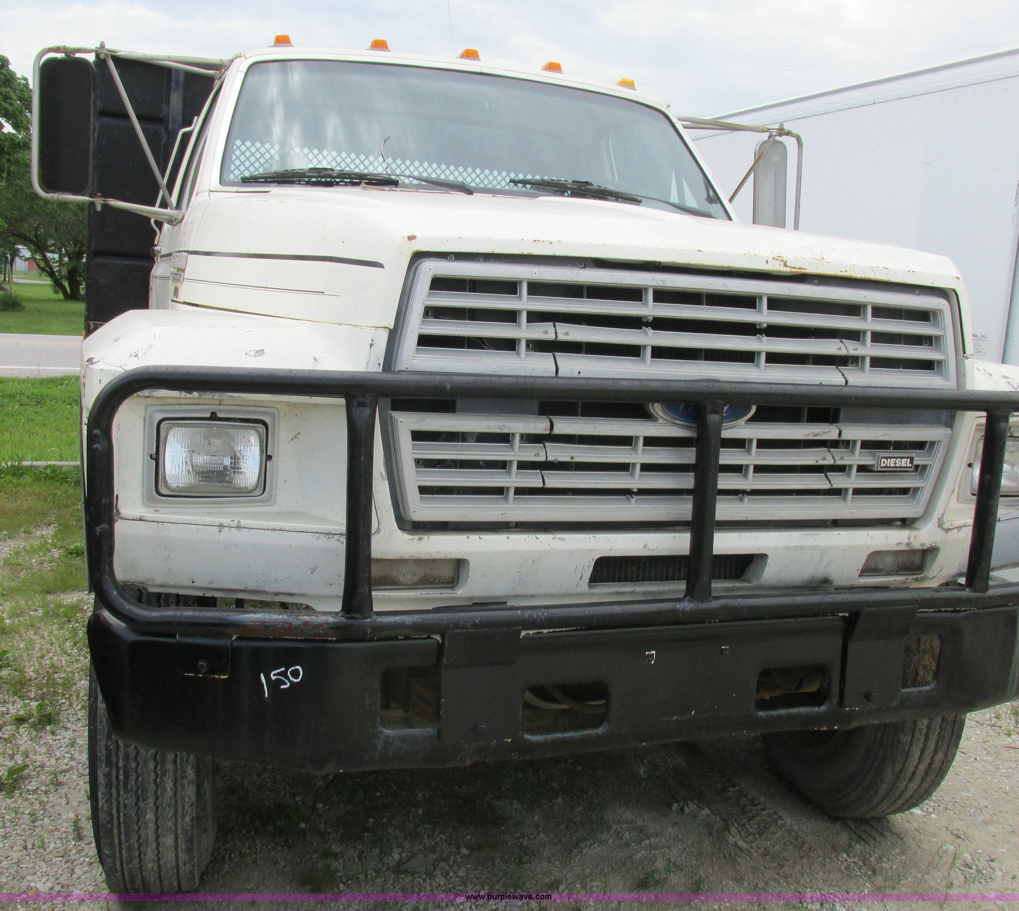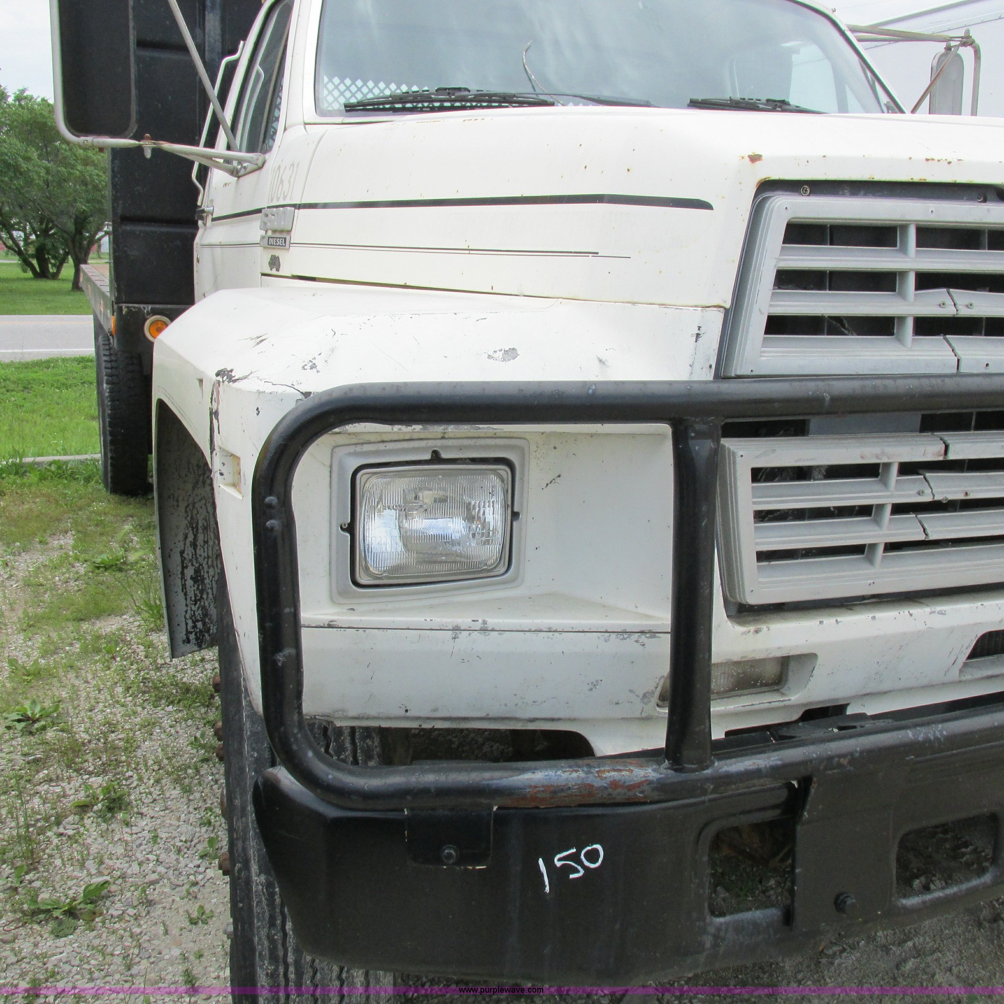 Purple Wave is selling a used Flat Bed Truck in Missouri. This item is a 1988 Ford F600 flatbed truck with the following: 66,907 miles on odometer, 2,540 hours on meter, 6.6L six cylinder diesel engine, Automatic transmission, Heat, Spring suspension seat, 16'L flatbed, Pintle hitch, Trailer wiring, Spring suspension, Hydraulic brakes, 10R22.5 tires, Interior/exterior cosmetic damage