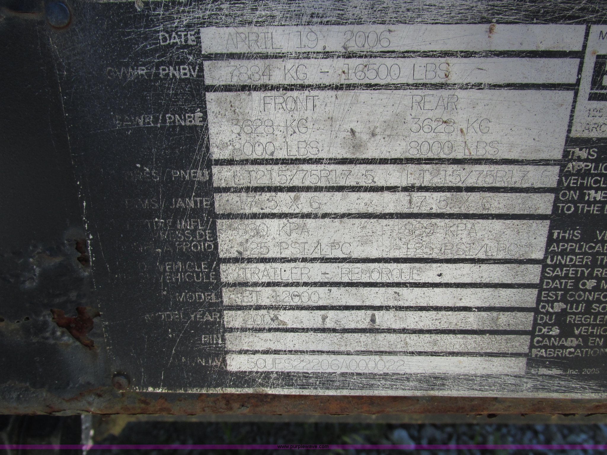 Purple Wave is selling a used Equip. Trailer in Nebraska. This item is a 2006 Biljax ET12000 hydraulic drop deck equipment trailer with the following: 14'L x 74 3/4"W I.D., 41"H sideboards I.D., 263"L x 102"W x 56"H O.D., Escalator deck, D ring tie-downs, 13" raised bed height, Adjustable pintle hitch, Tongue mounted jack stand, Break-away cable, Spring suspension, Electric brakes, Goodyear 215/75R17.5 tires, GVWR 16,500 lbs, GAWR 8,000 lbs per axle, 4,500 lbs tare weight, Transmission fluid tank cap missing, Will be replaced prior to auction