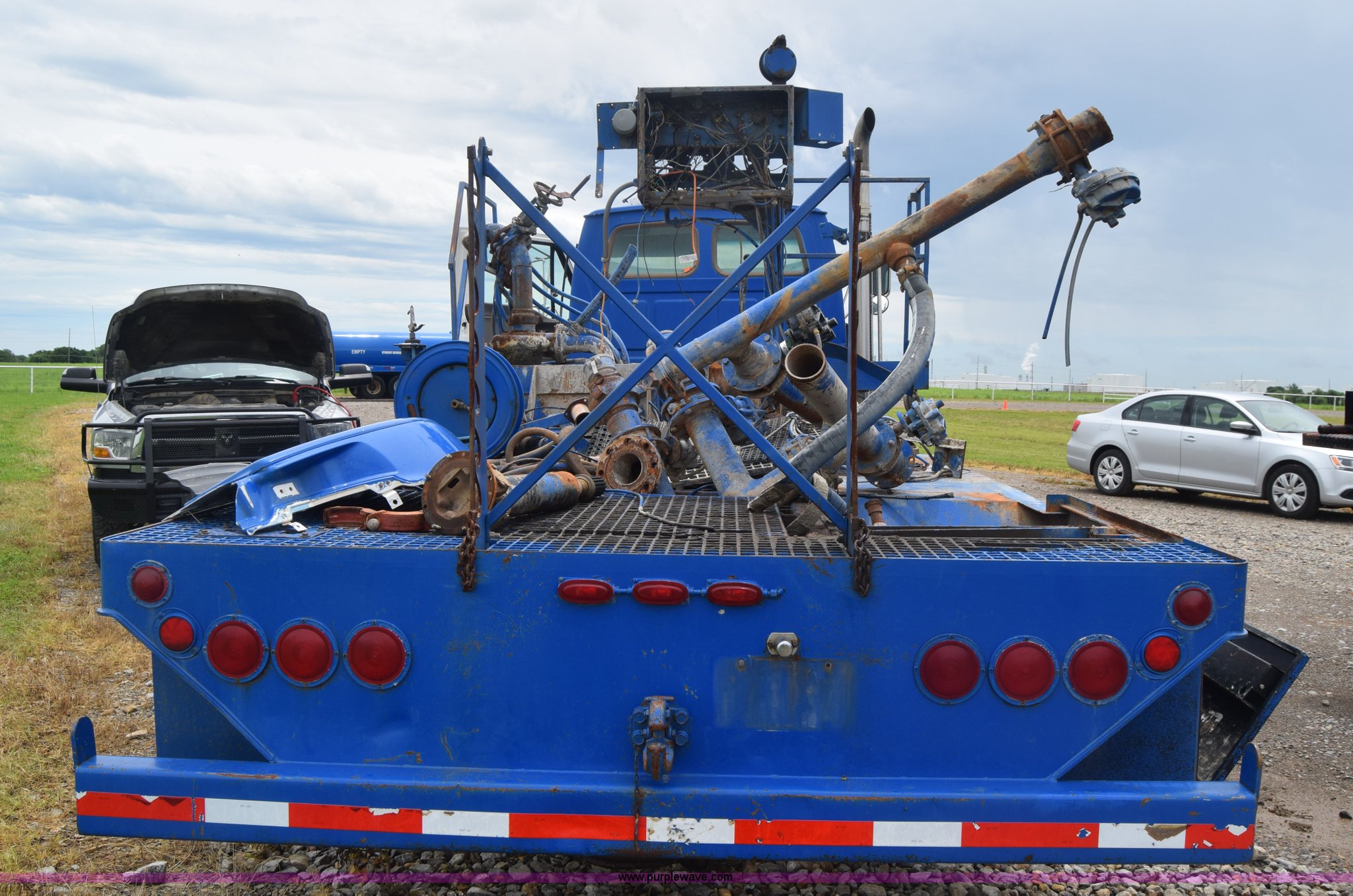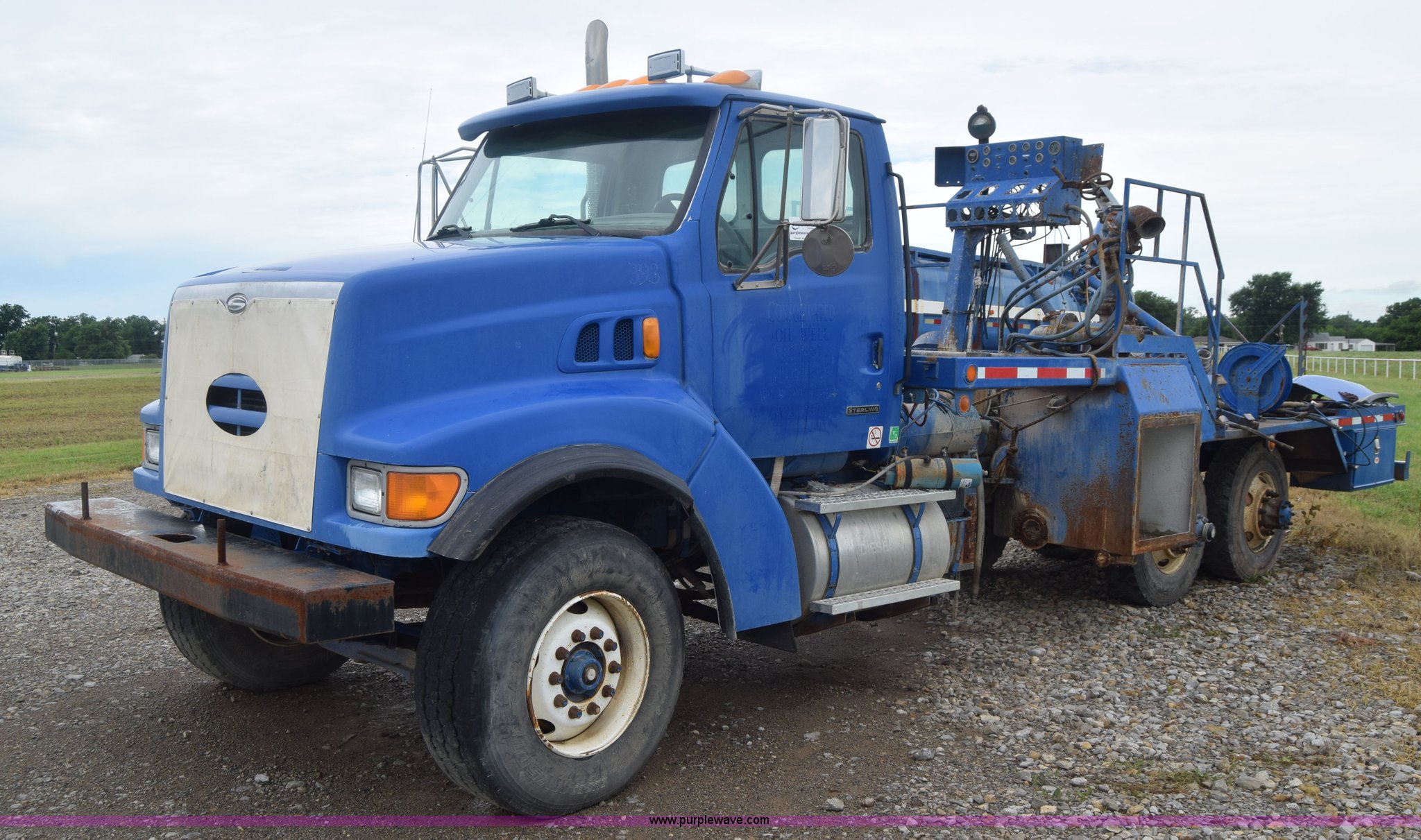 2000 Sterling L8500 pump truck. 170,760 miles on odometer, Caterpillar 3126 7.2L L6 diesel engine 300 HP, Eaton Fuller Road Ranger nine speed manual transmission, AC and heat, AM/FM, Air suspension seat, Chelsea PTO, 21'L x 8'W bed, Single exhaust stack, Dual fuel tanks, Air suspension, Yokohama 385/65R22.5 front tires, Yokohama 11R22.5 rear tires, GVWR 56,000 lbs, Non-operational unit, Unit has not been operated in more than five years, Drive shaft removed, Outside tires removed, Pump disassembled Parts missing, Unit # 393. 2FZNBJCB6YAF48643. Consolidated Oil Well Services. 2201 West South Avenue. Ponca City, OK 74601