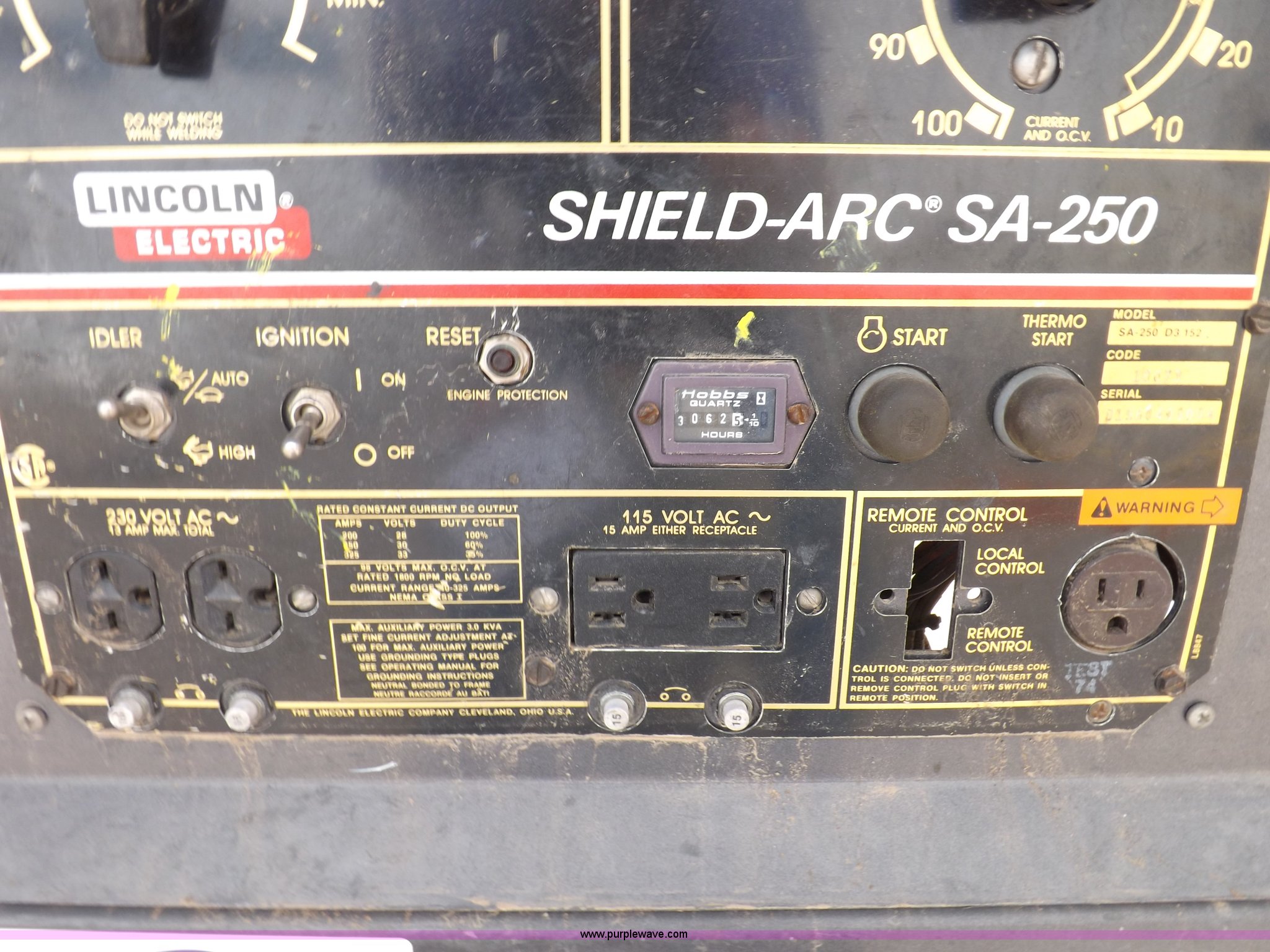 Lincoln Shield-Arc SA-250 welder. 3,062 hours on meter, Perkins three cylinder diesel engine, 250 amp weld, 115/230V, 3 kVA auxiliary power, Lifting eye, Battery, side panels, and leads are not included, Serial D1960409004. View equipment video. Smyth Oil and Gas Services. 2398 W. Road 10. Ulysses, KS 67880