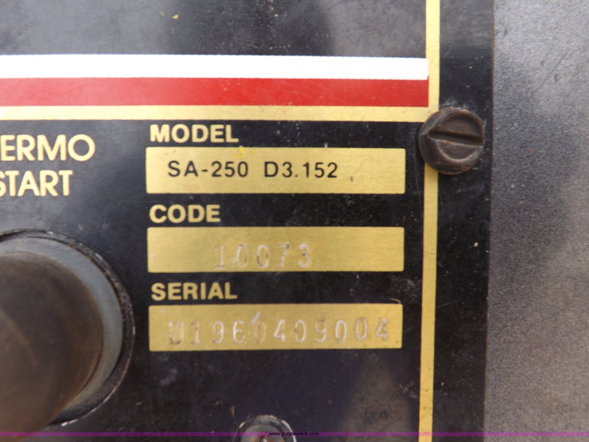 Purple Wave is selling a used Welder (Manual) in Kansas. This item is a Lincoln Shield-Arc SA-250 welder with the following: 3,062 hours on meter, Perkins three cylinder diesel engine, 250 amp weld, 115/230V, 3 kVA auxiliary power, Lifting eye, Battery, side panels, and leads are not included, Serial D1960409004