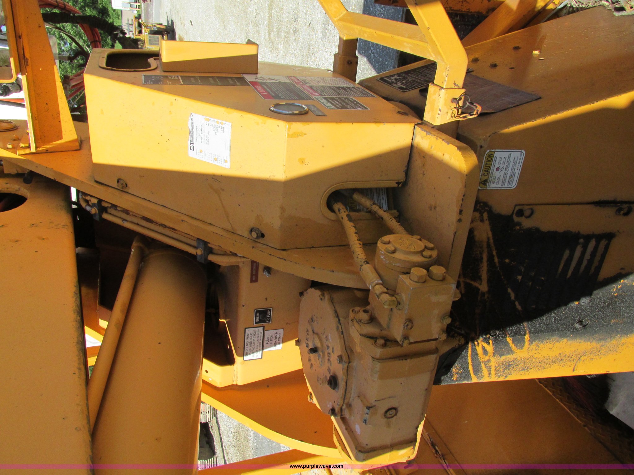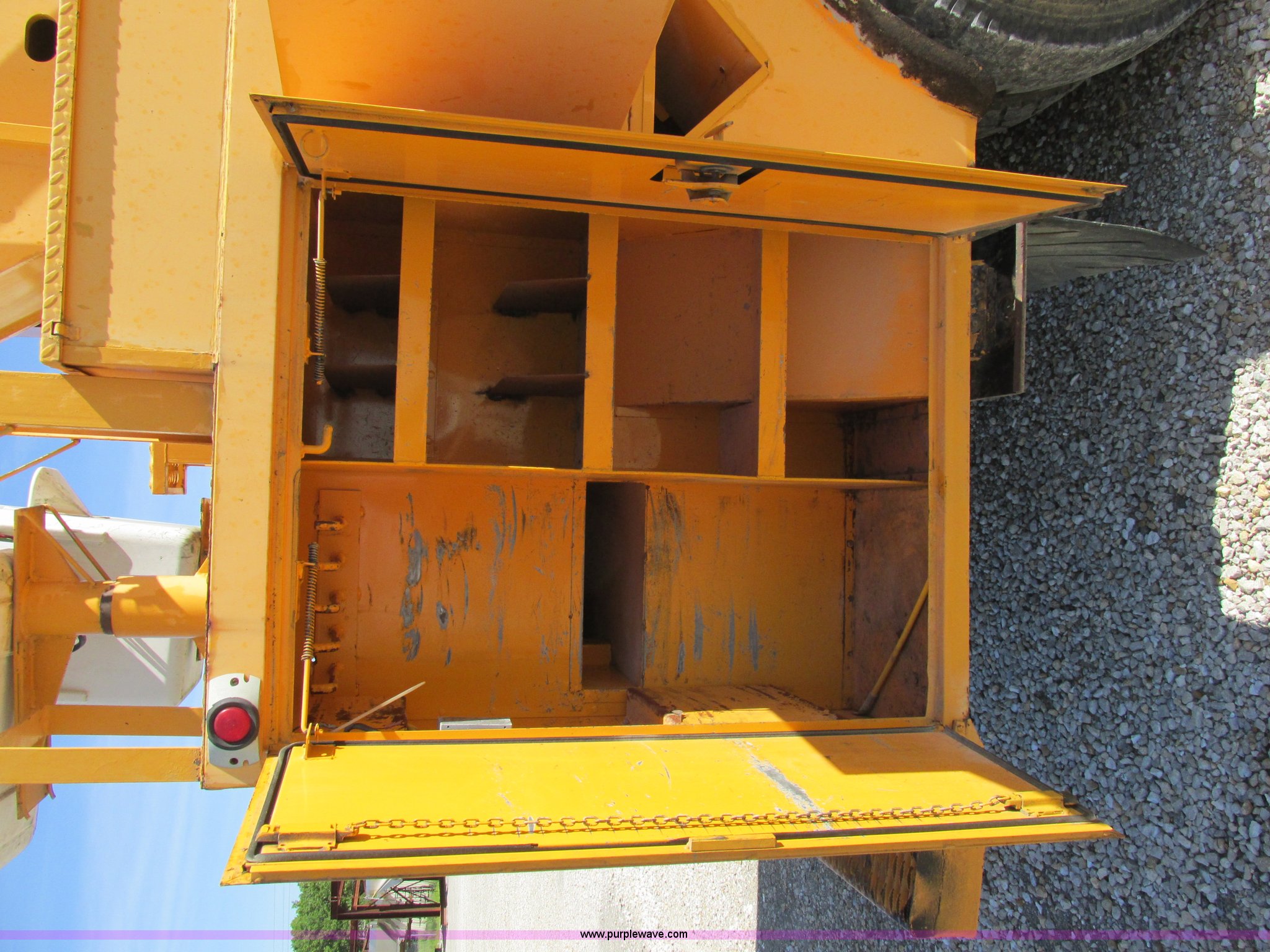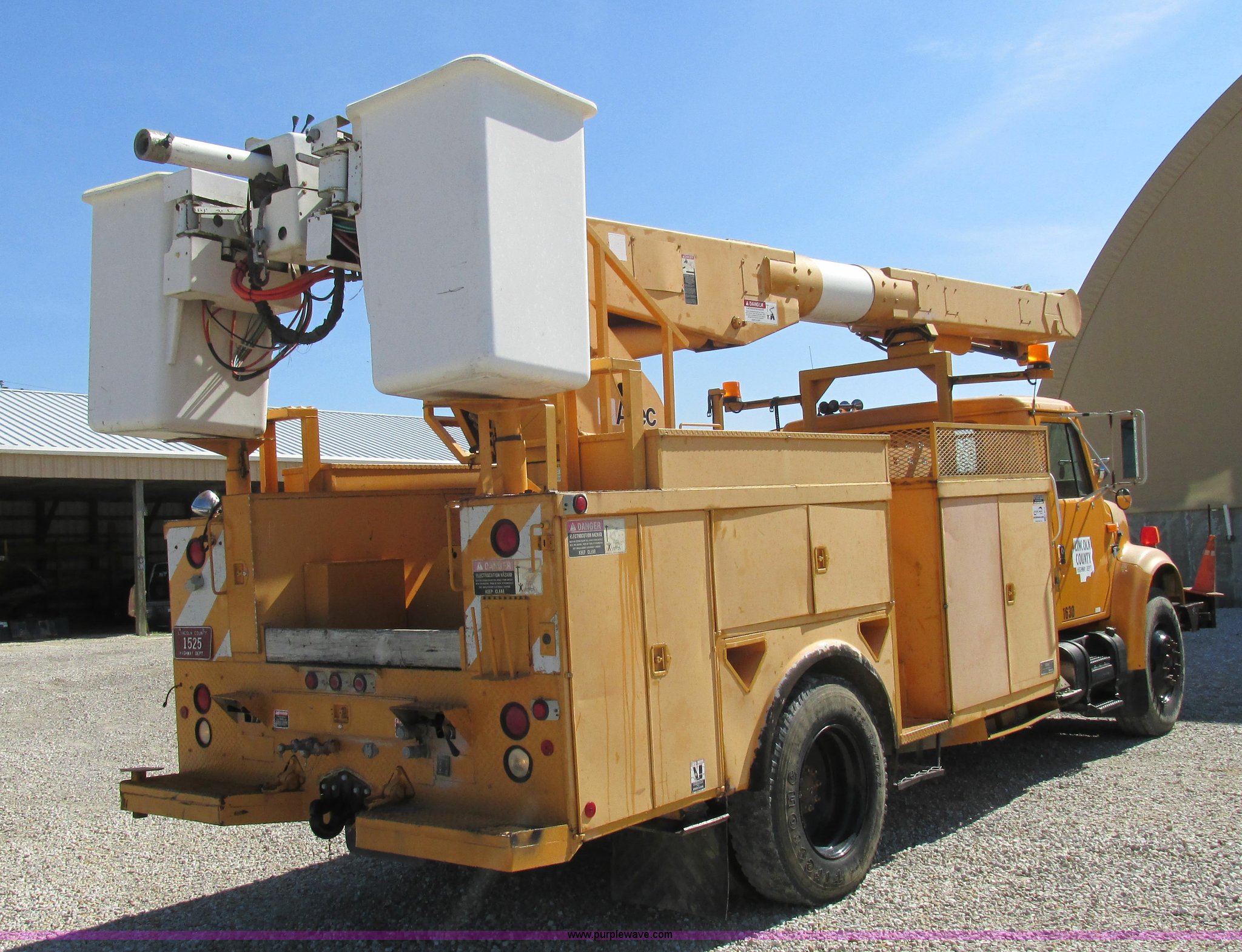 Purple Wave is selling a used Bucket Truck in Missouri. This item is a 1993 International 4900 bucket truck with the following: 115,910 miles on odometer, 13,568 hours on meter, International DT466 7.6L L6 diesel engine, Automatic transmission, Two speed rear end, Heat, PTO, Single under body exhaust, Dual fuel tanks, 35 and 45 gallon capacities, 1993 Altec double basket bucket bed, Serial 3763773, Bucket model AMU0H, Serial 0393-R2FN, 52' maximum platform height, Side entry service bed, Rear and mid-mount hydraulic outriggers, Shelving, Slide-out drawers, Cable winch, Spring suspension, Air brakes, 11R22.5 tires