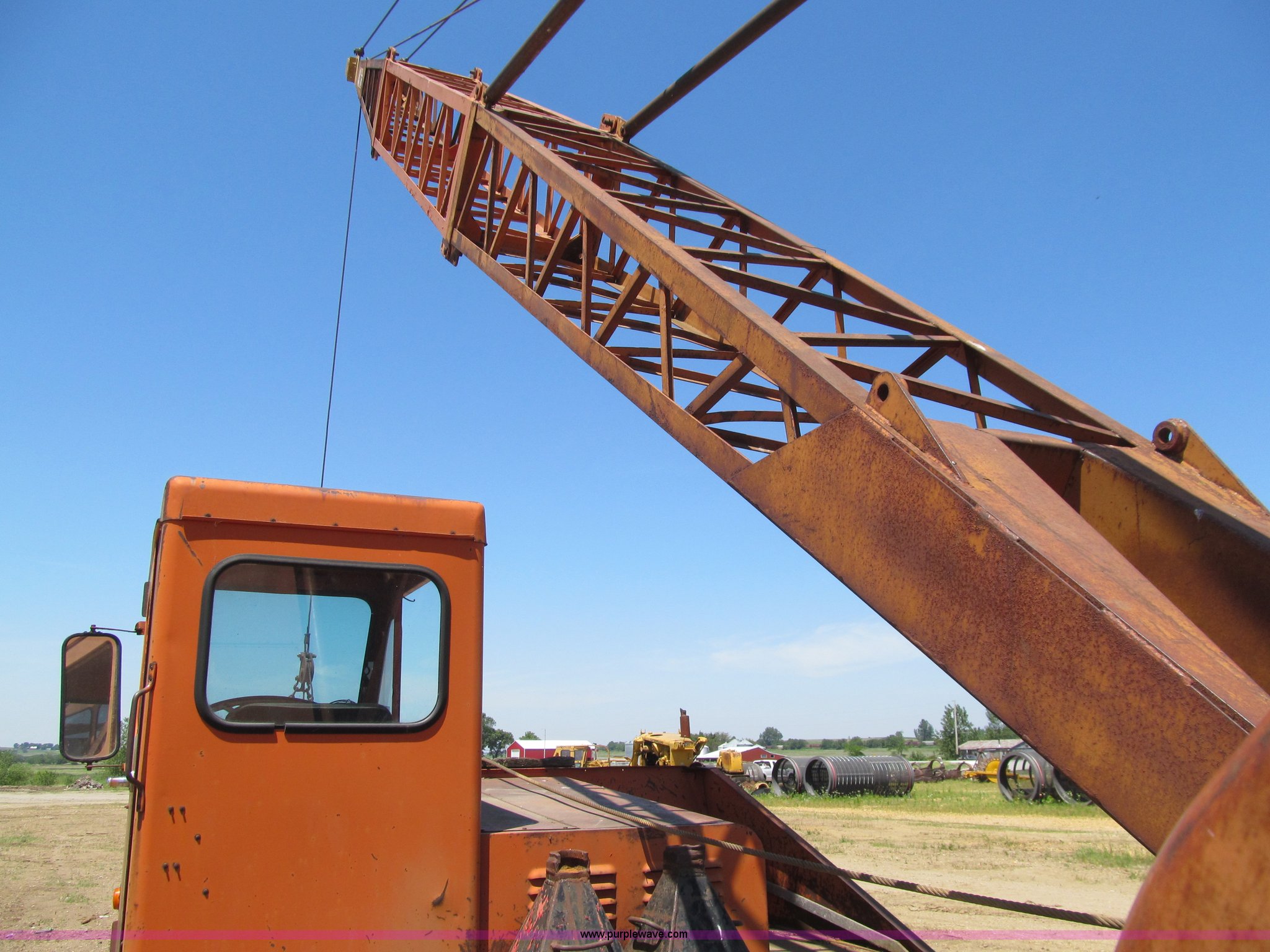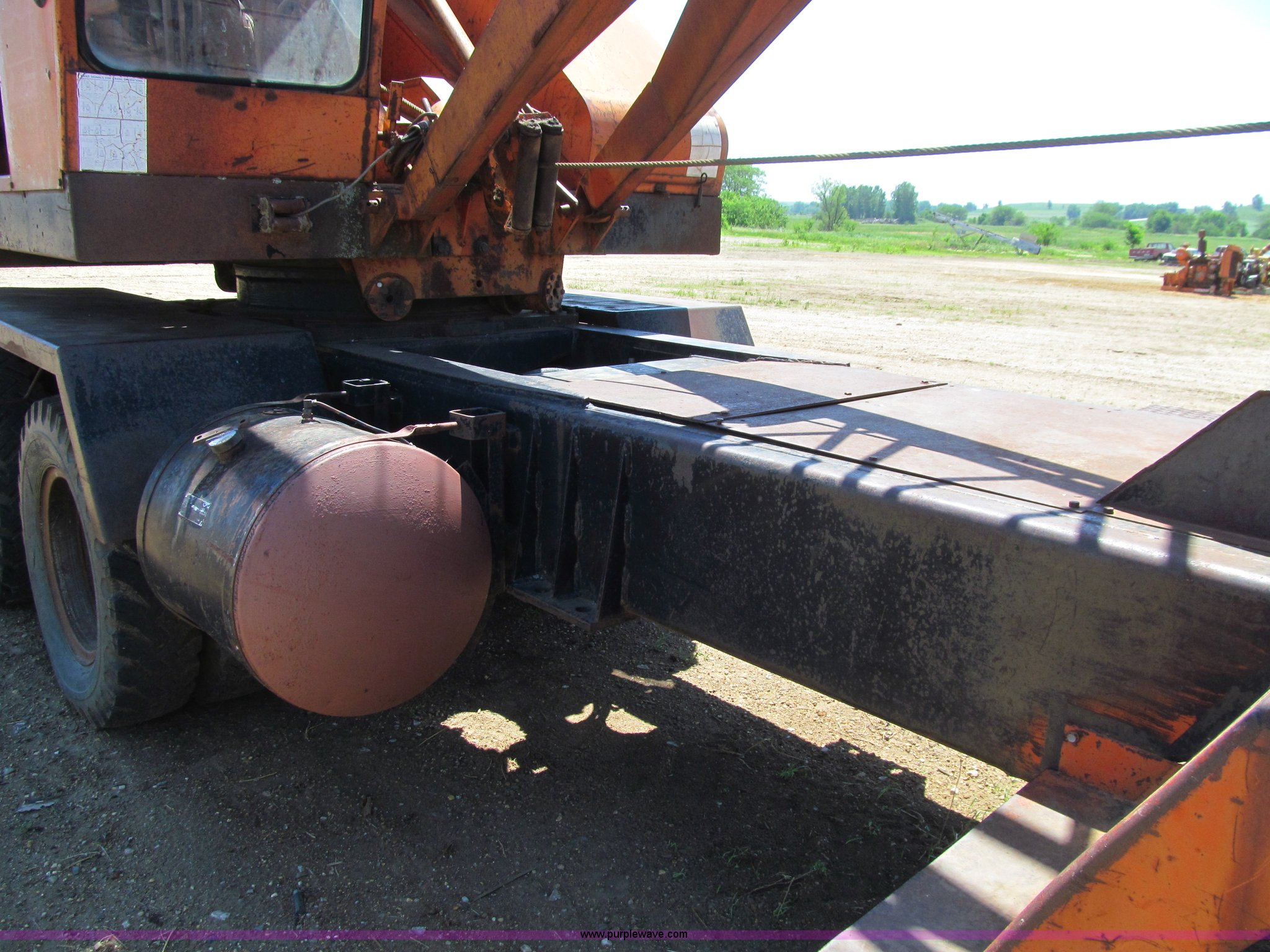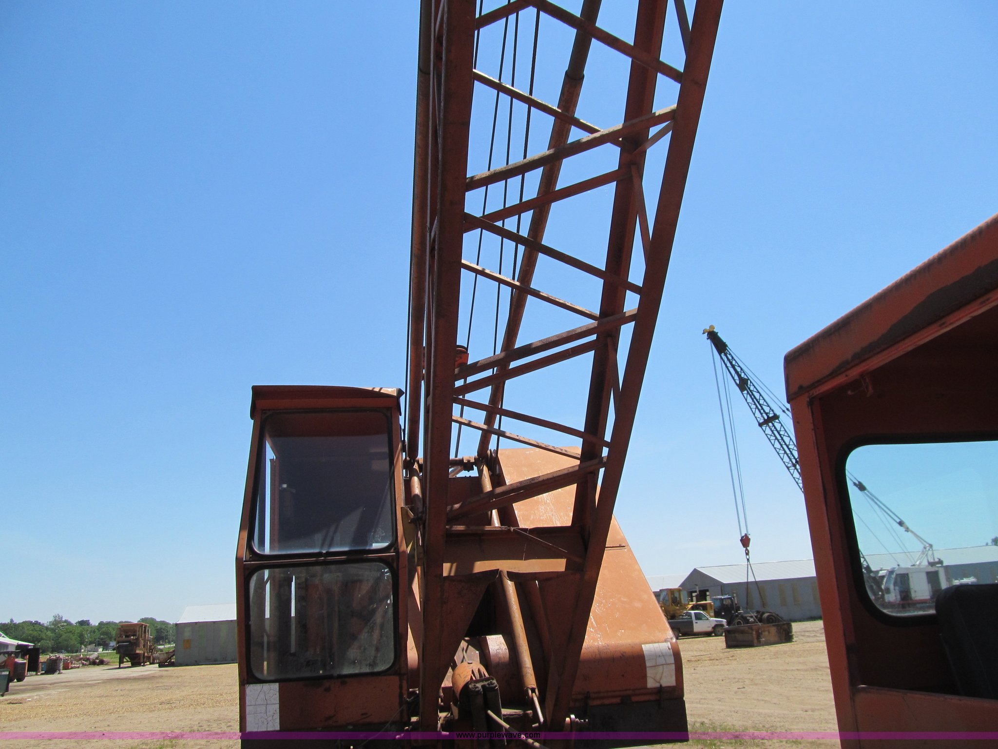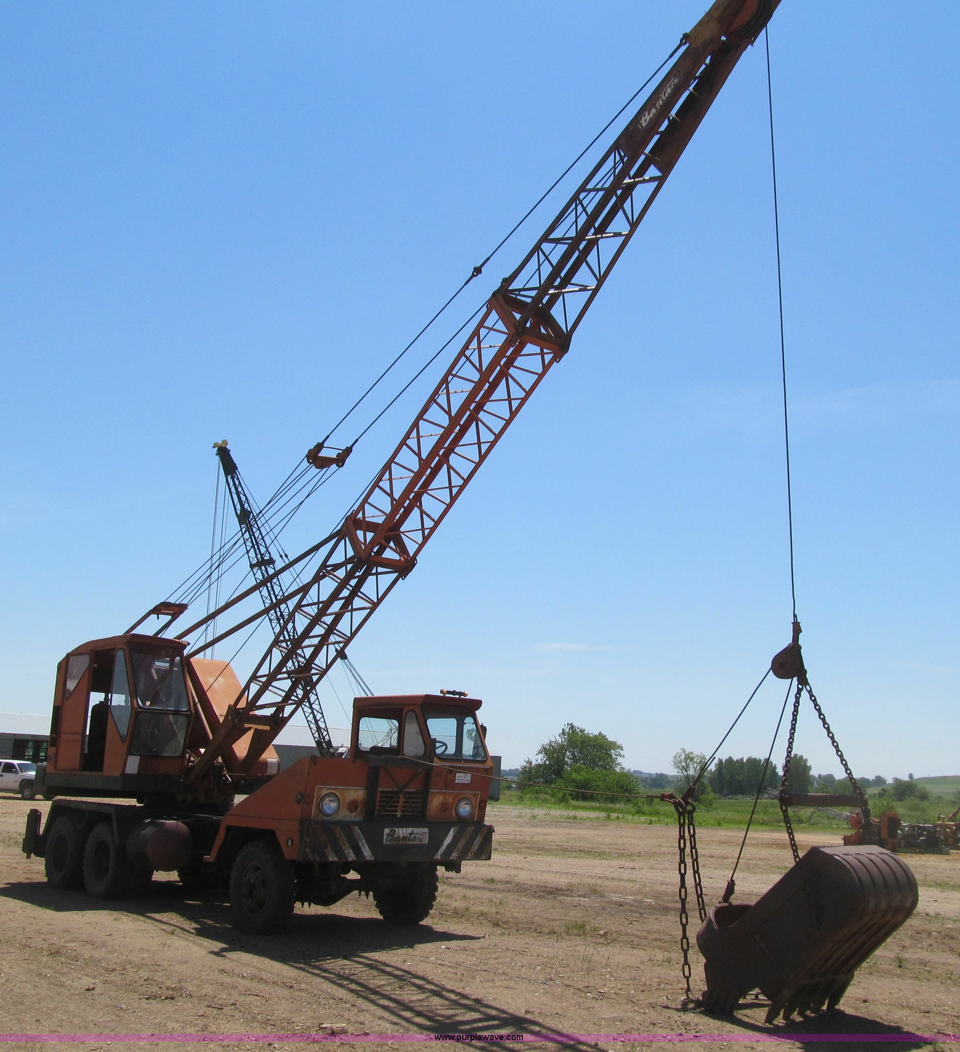 Purple Wave is selling a used Truck Crane in Iowa. This item is a Bantam T350 truck crane with the following: 9,554 miles on odometer, Chrysler gas engine, Manual transmission, 5F-2R gears, Rear hydraulic outriggers, 8.25 x 20 tires, Detroit Diesel diesel crane engine, Approximately 45'boom, Channel lattice, Fairlead, 34"W drag line bucket, (6) teeth, One tire has cords showing, Front axle drive line removed, Serial 12131