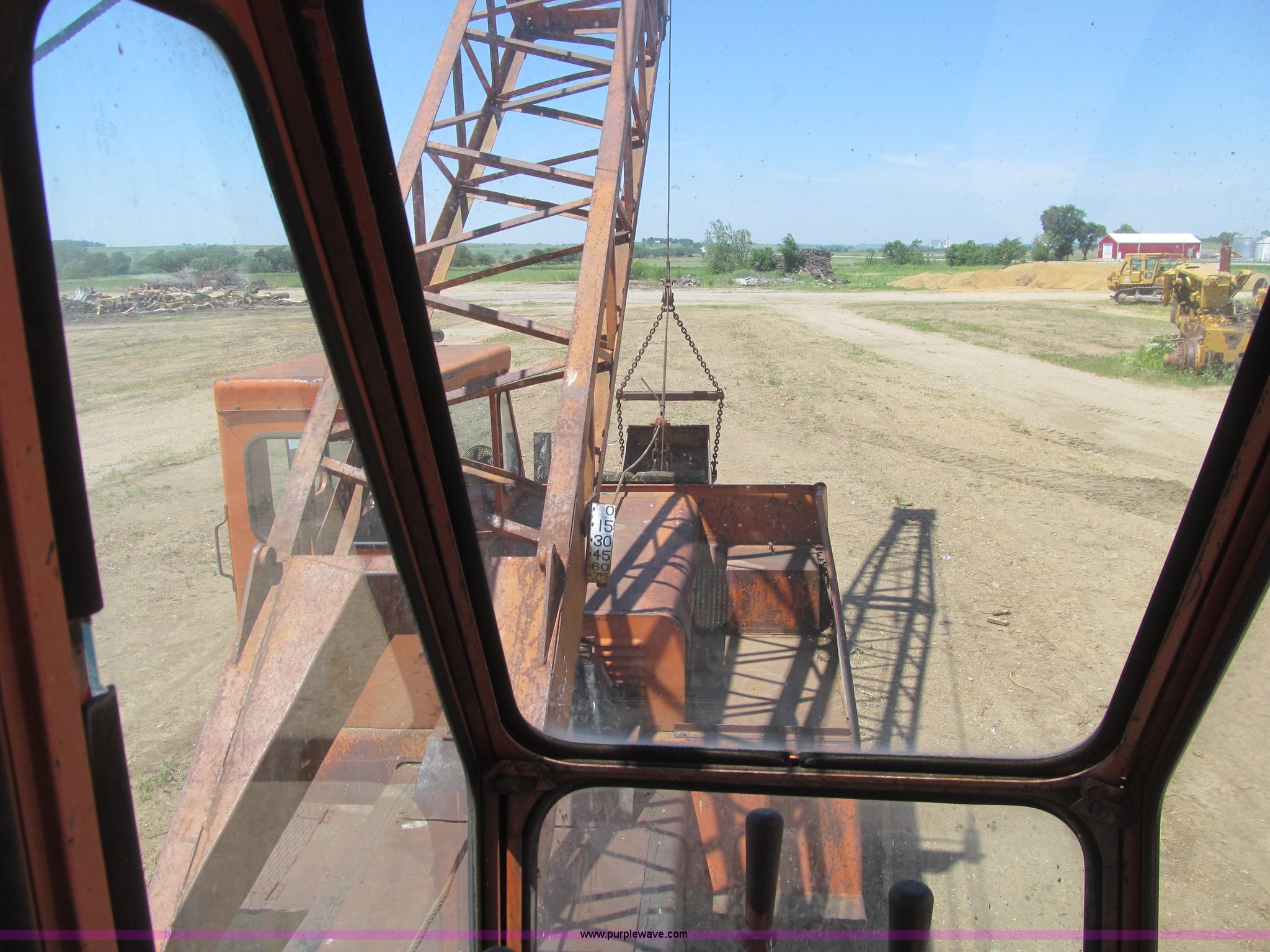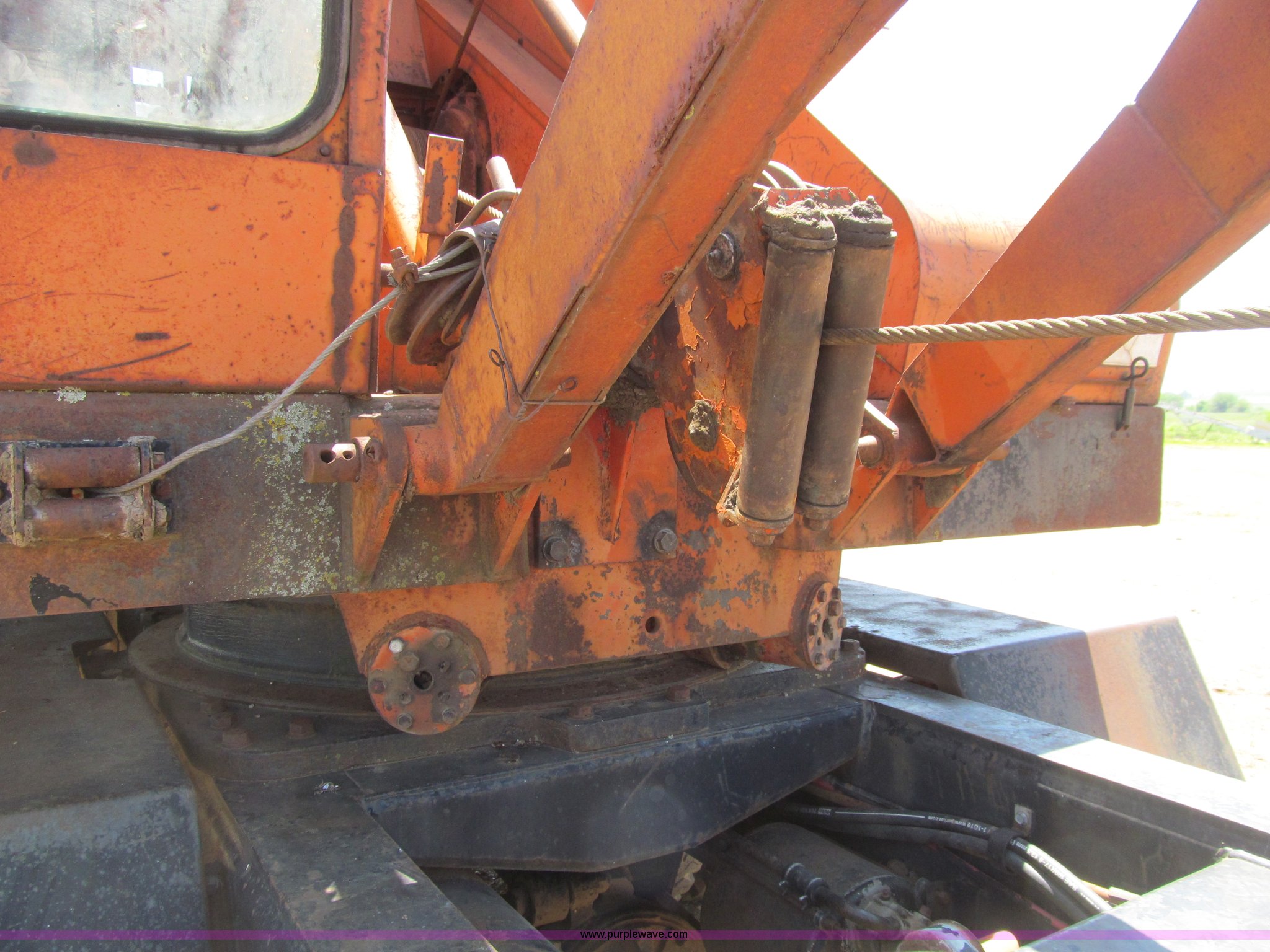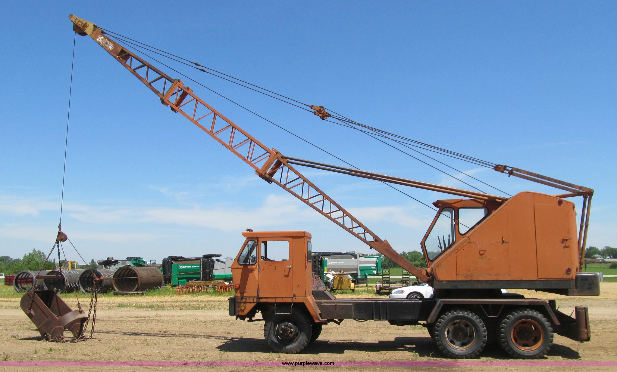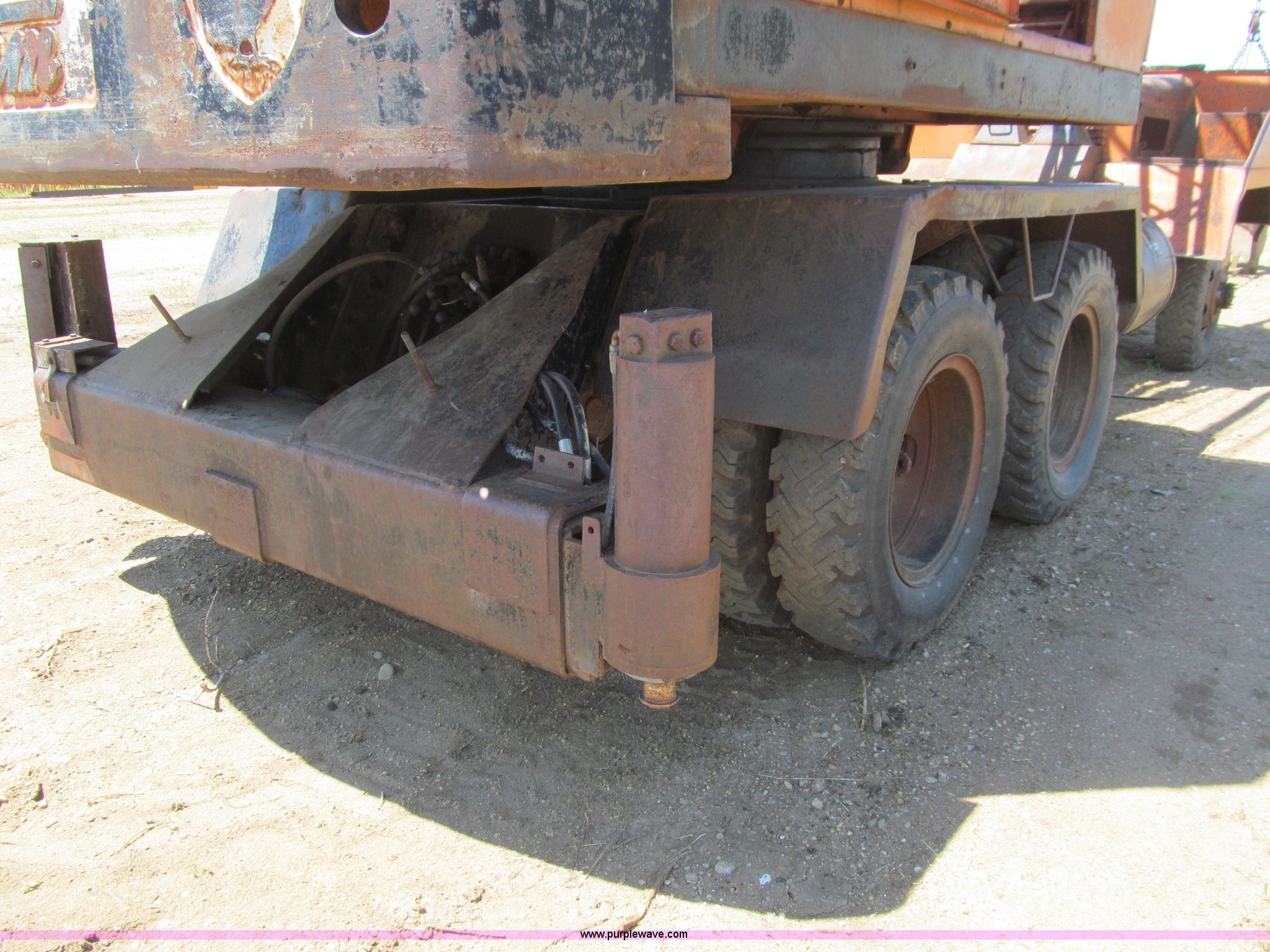 Purple Wave is selling a used Truck Crane in Iowa. This item is a Bantam T350 truck crane with the following: 9,554 miles on odometer, Chrysler gas engine, Manual transmission, 5F-2R gears, Rear hydraulic outriggers, 8.25 x 20 tires, Detroit Diesel diesel crane engine, Approximately 45'boom, Channel lattice, Fairlead, 34"W drag line bucket, (6) teeth, One tire has cords showing, Front axle drive line removed, Serial 12131