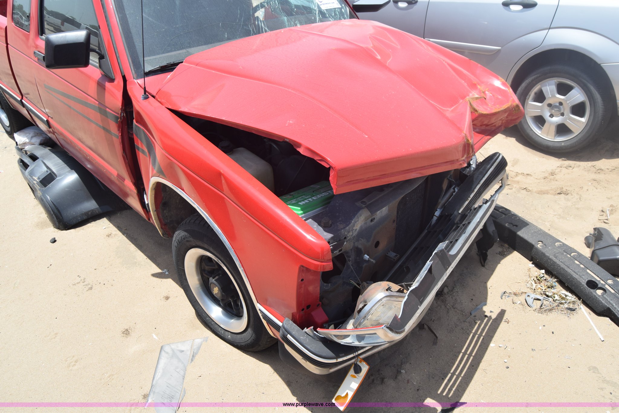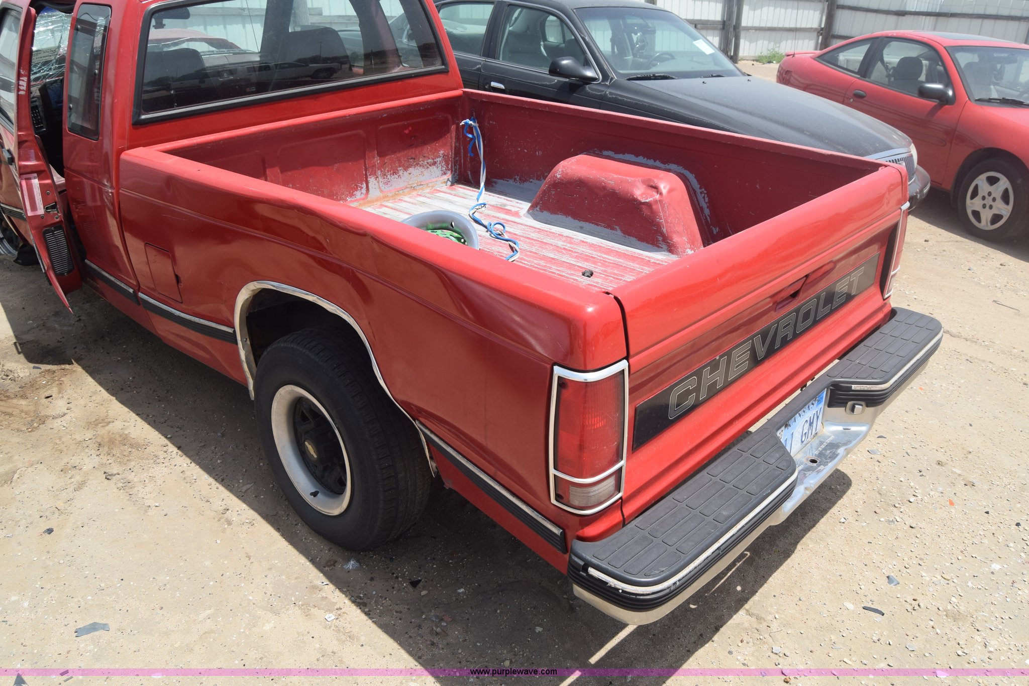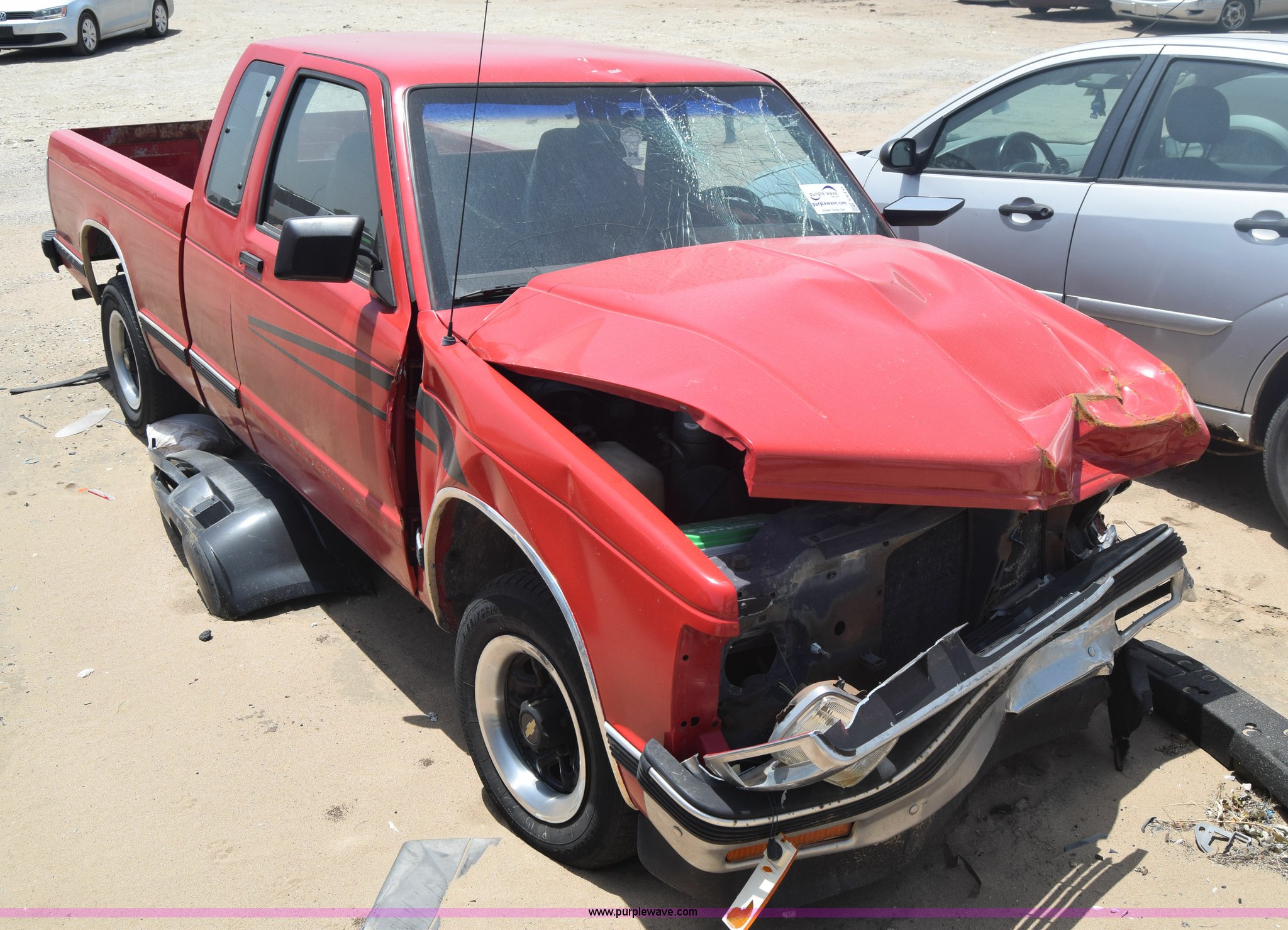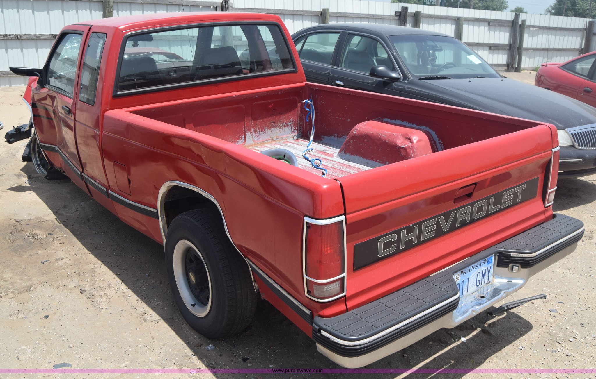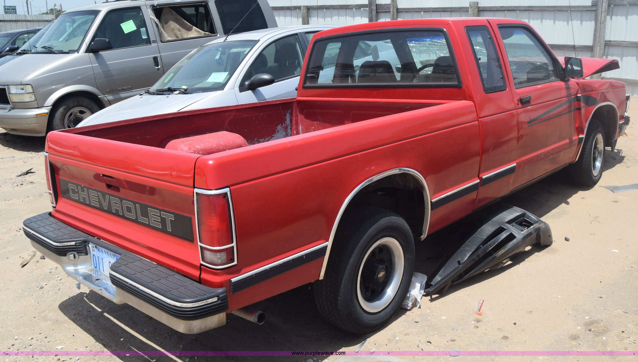 Purple Wave is selling a used Compact Pickup or Van in Kansas. This item is a 1991 Chevrolet S10 Ext. Cab pickup truck with the following: 159,601 miles on odometer, 4.3L V6 OHV 12V gas engine, Automatic transmission, AC and heat, Tilt, AM/FM, Manual windows and locks, Cloth interior, 195/70R14 tires, Interior/exterior cosmetic damage, Dents, Scratches, Front end damage, Cracked windshield, One tire damage, Driver's door will not open, Case# 15C020587