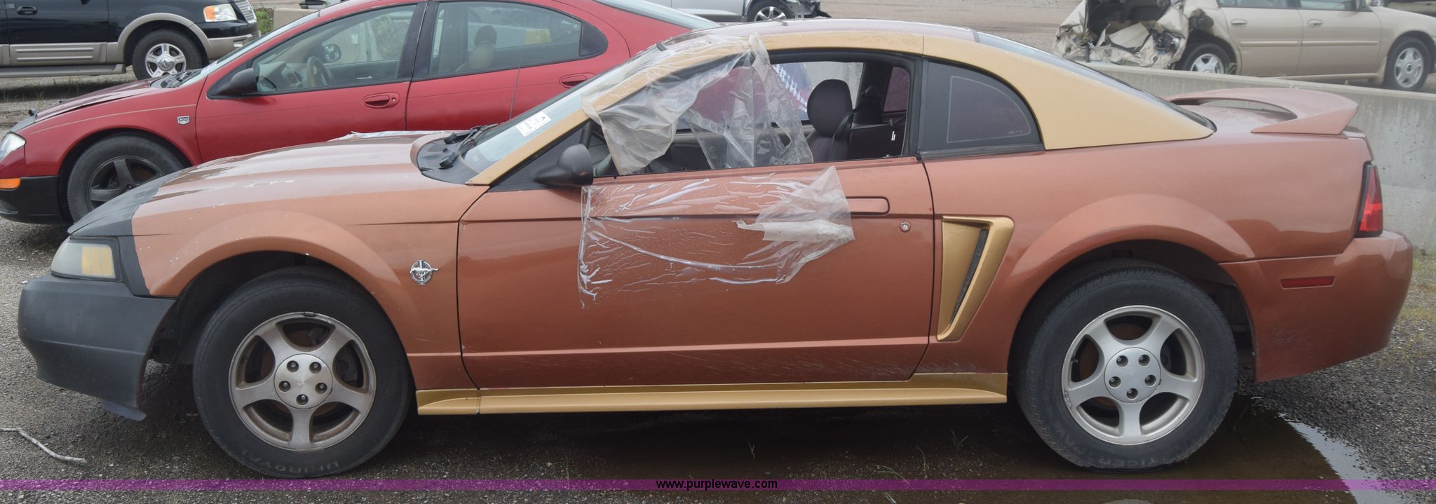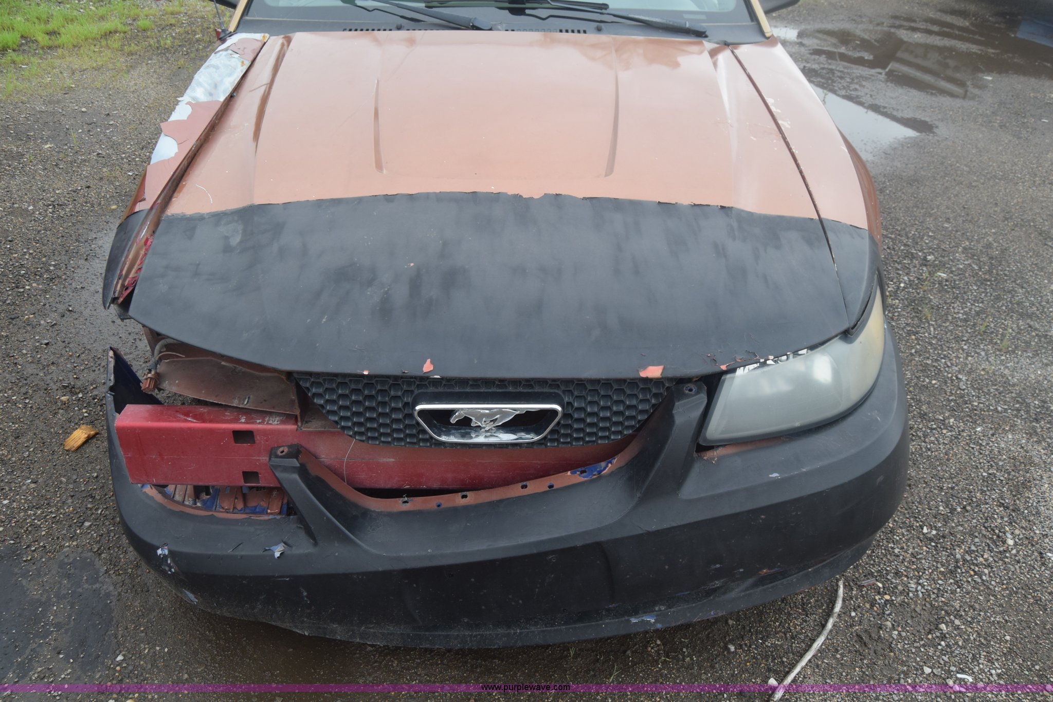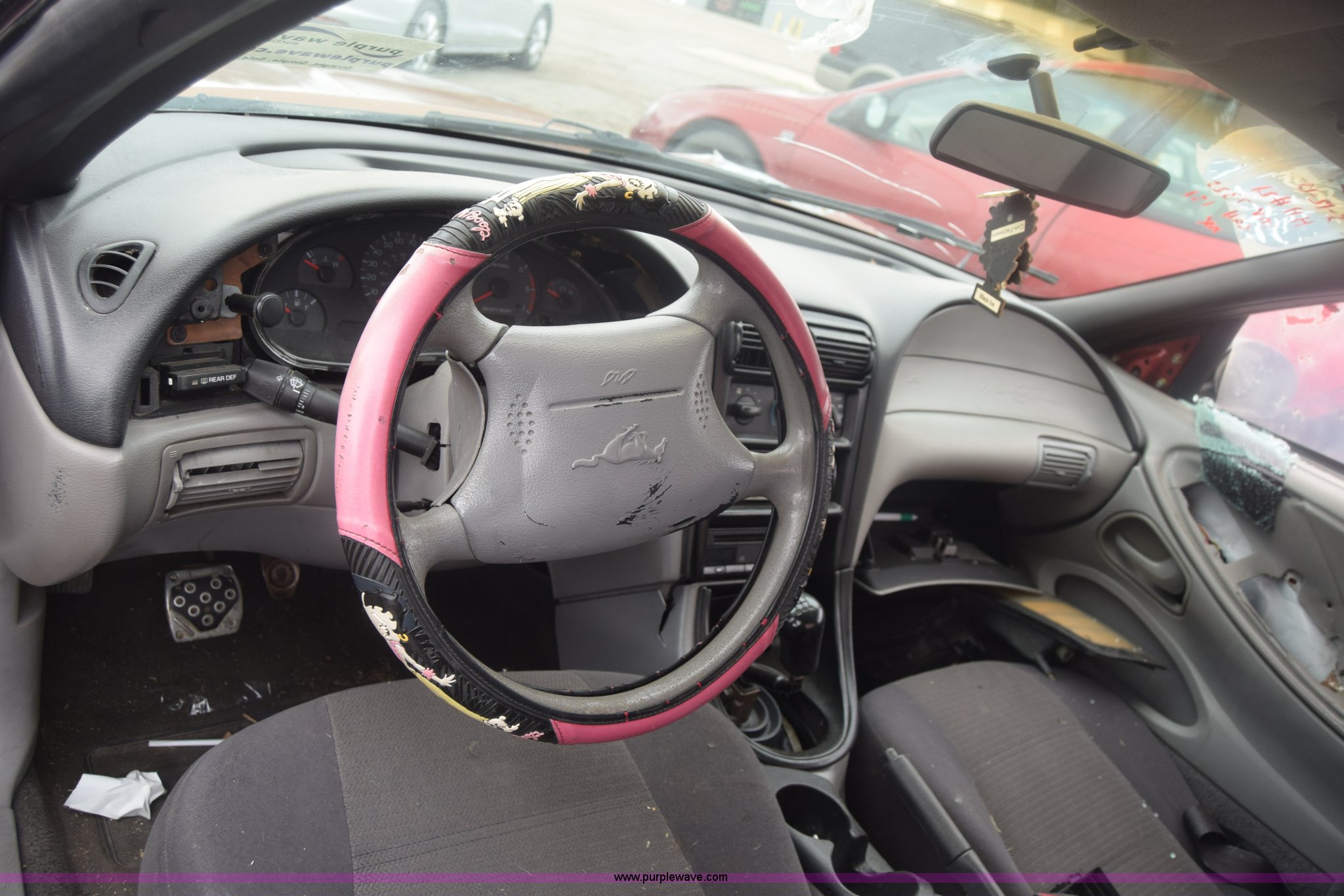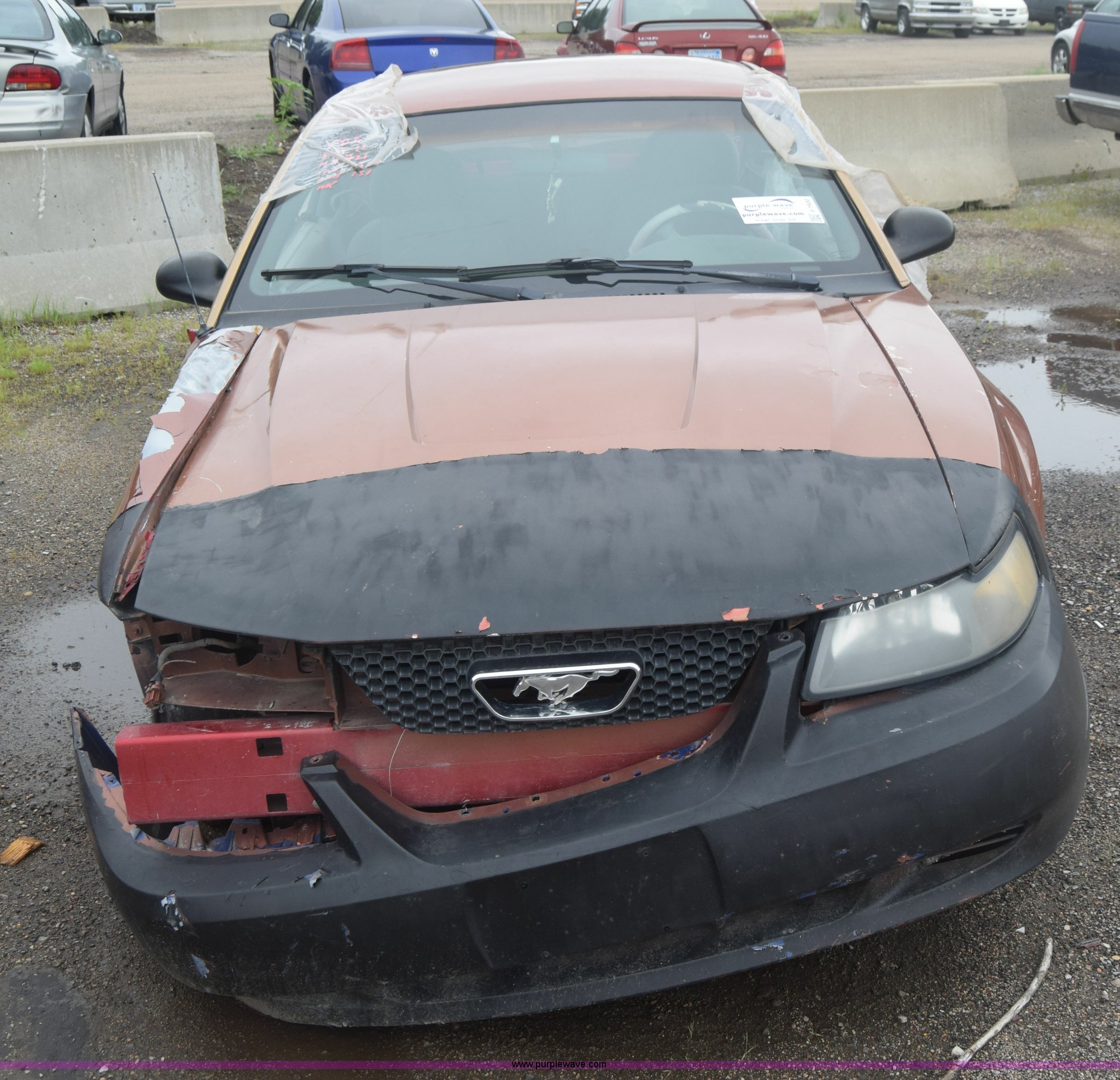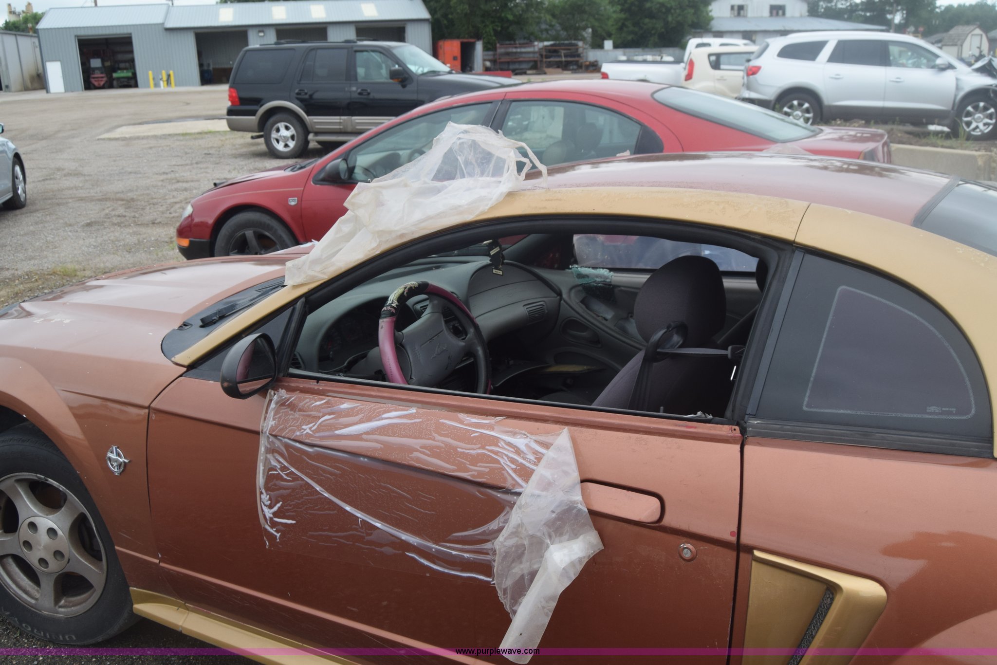 Purple Wave is selling a used Passenger Vehicle in Kansas. This item is a 1999 Ford Mustang with the following: Unknown miles on odometer, 3.8L V6 OHV 12V gas engine, Five speed manual transmission, AC and heat, Tilt, Power windows, locks, and mirrors, Cloth interior, 225/60R16 tires, Substantial body damage, Front end damage, Passenger side damaged, Interior/exterior cosmetic damage, Stereo face plate missing, Seat torn, One tire flat, One tire off wheel, Case# 15C029992