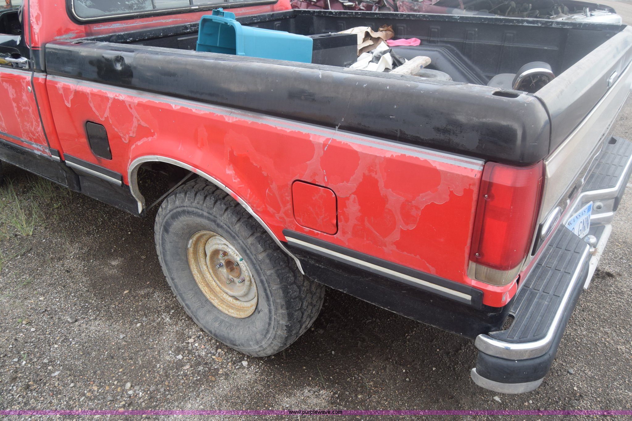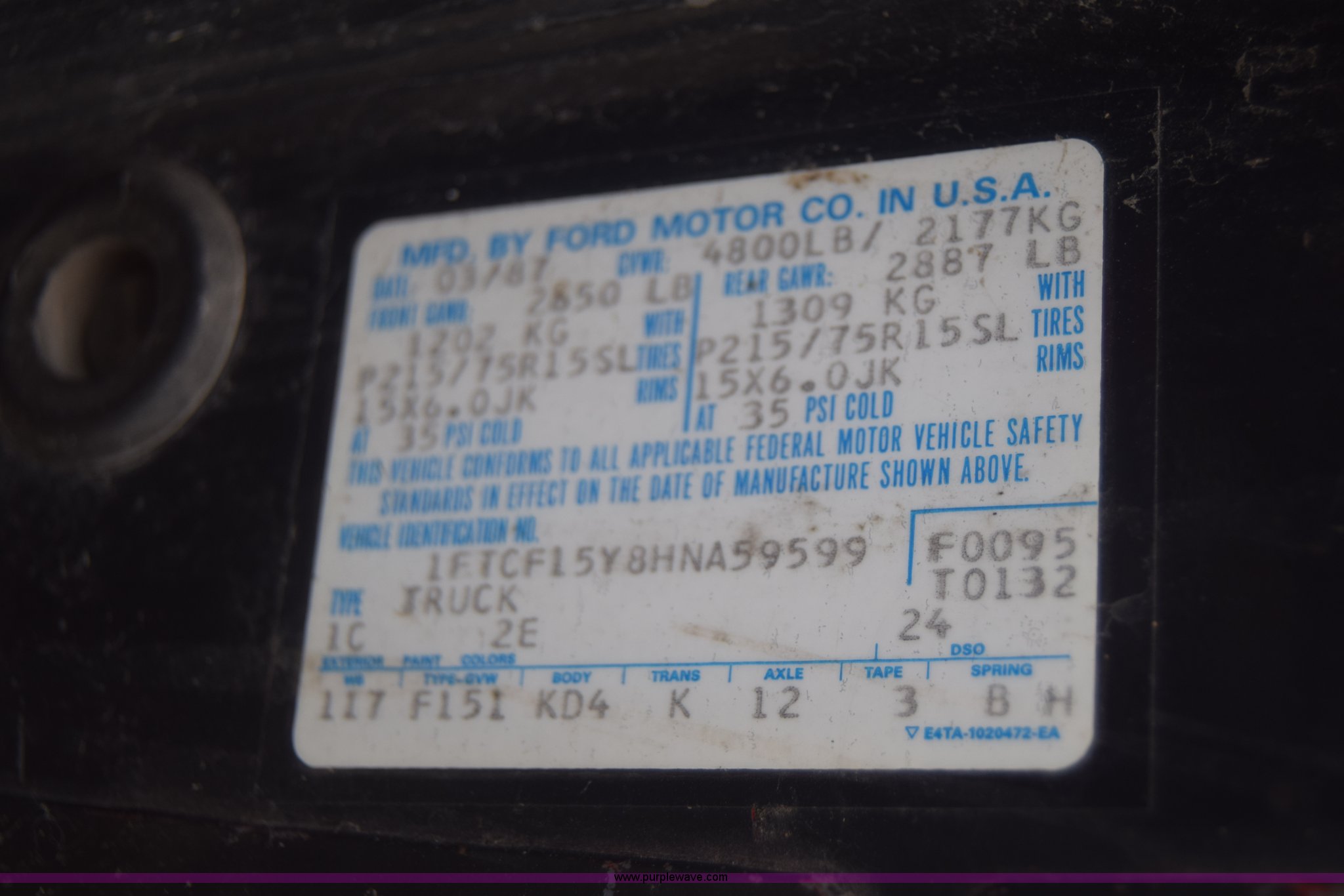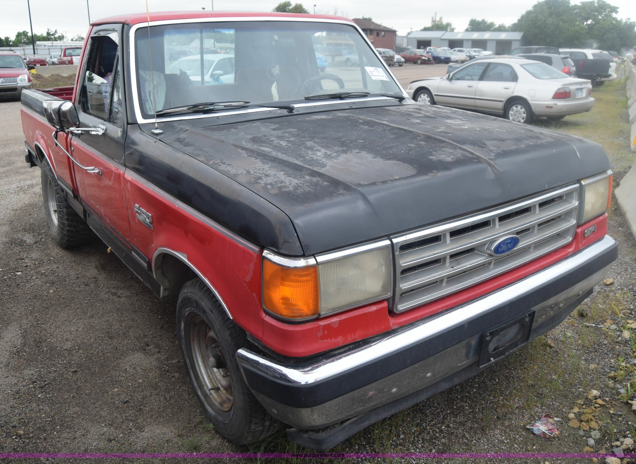 Purple Wave is selling a used 1/2 Ton Pickup or Van in Kansas. This item is a 1987 Ford F150 pickup truck with the following: 9,680 miles on odometer, Actual mileage unknown, 4.9L L6 OHV 12V gas engine, Automatic transmission, AC and heat, Cruise, Power windows and locks, Cloth interior, Receiver hitch, 33 x 10.50R15LT tires, Interior/exterior cosmetic damage, Dents and scratches, Paint faded, Seat torn, Stereo missing, Mirror damaged, Power windows and lock controls damaged, Case# 15C029665