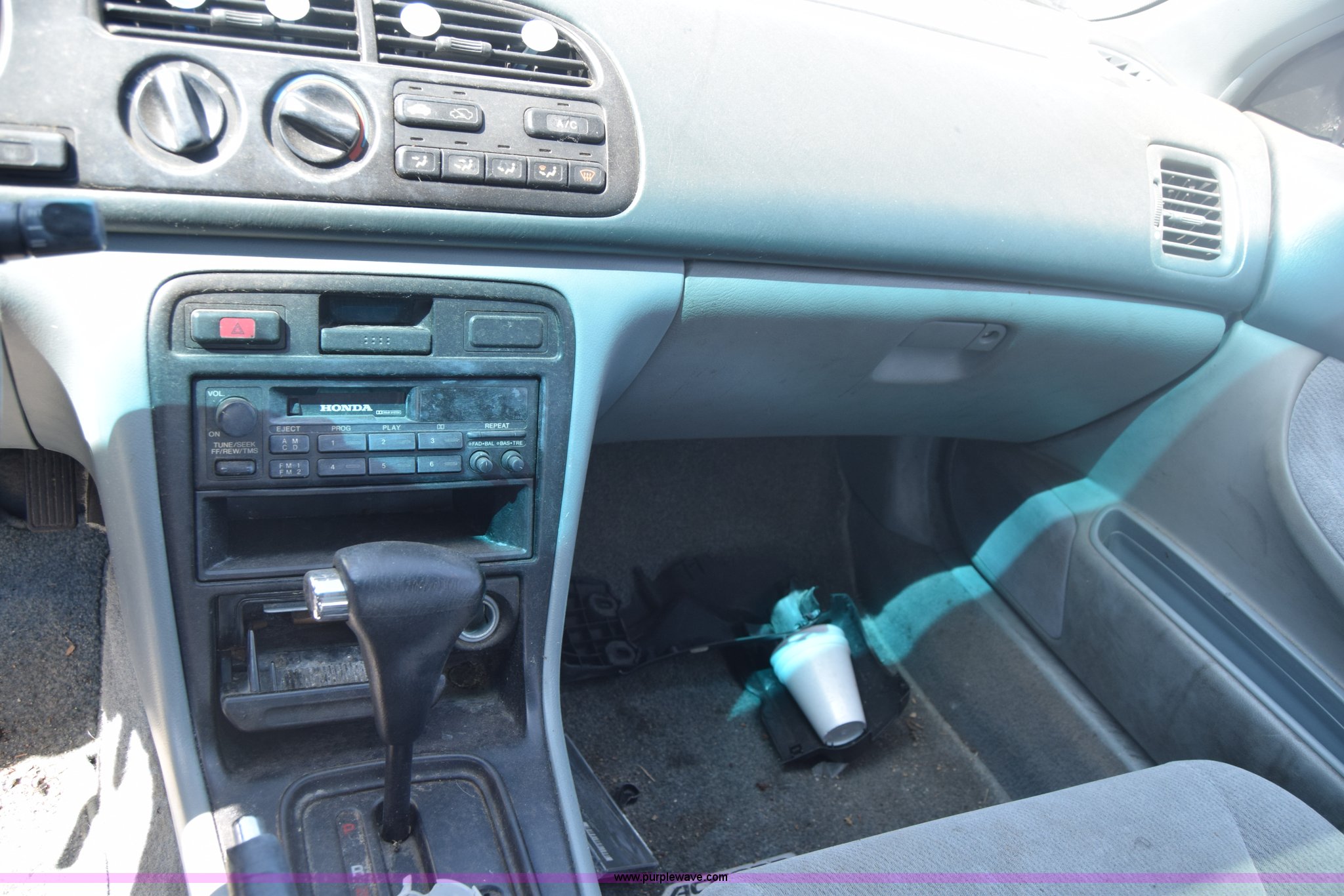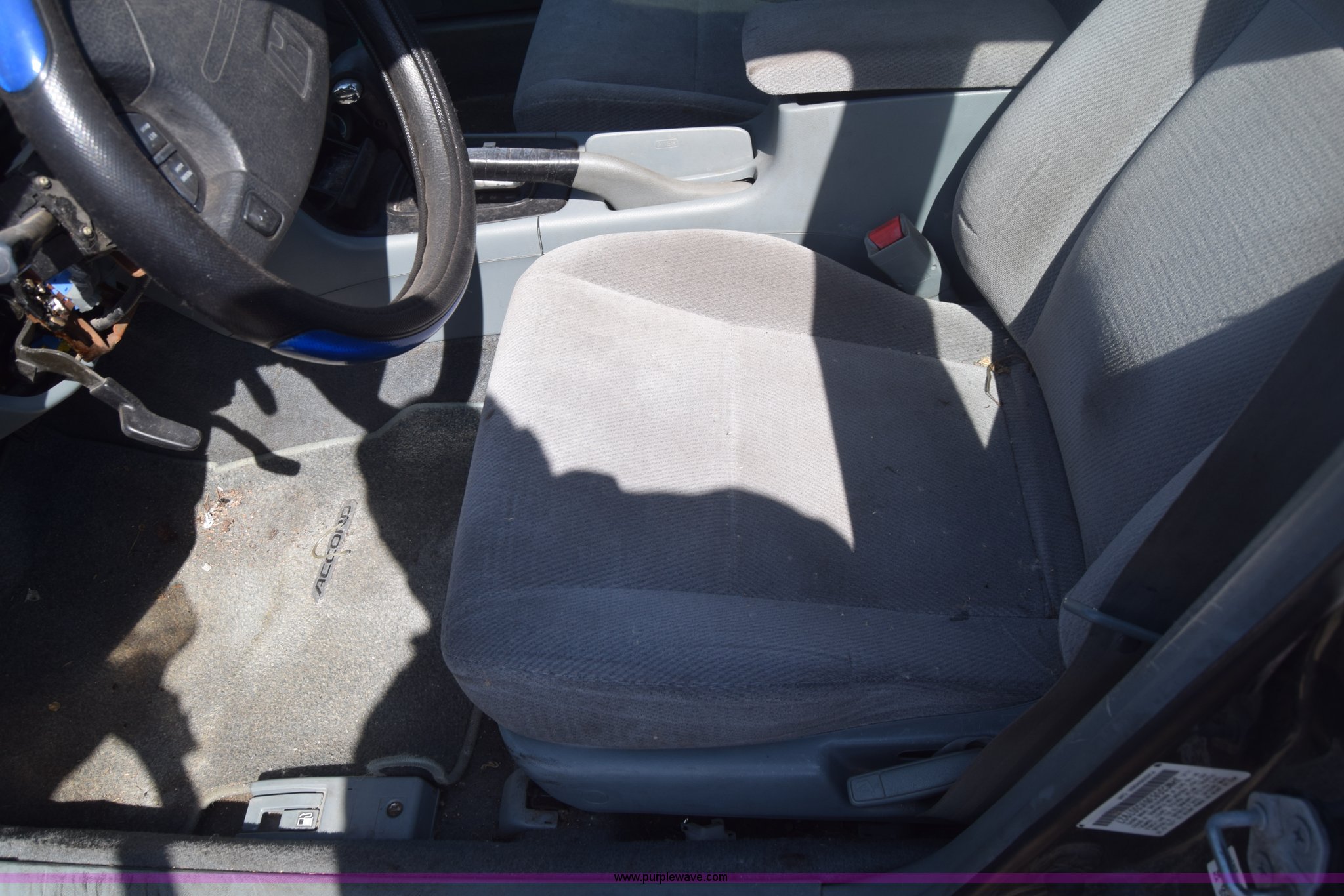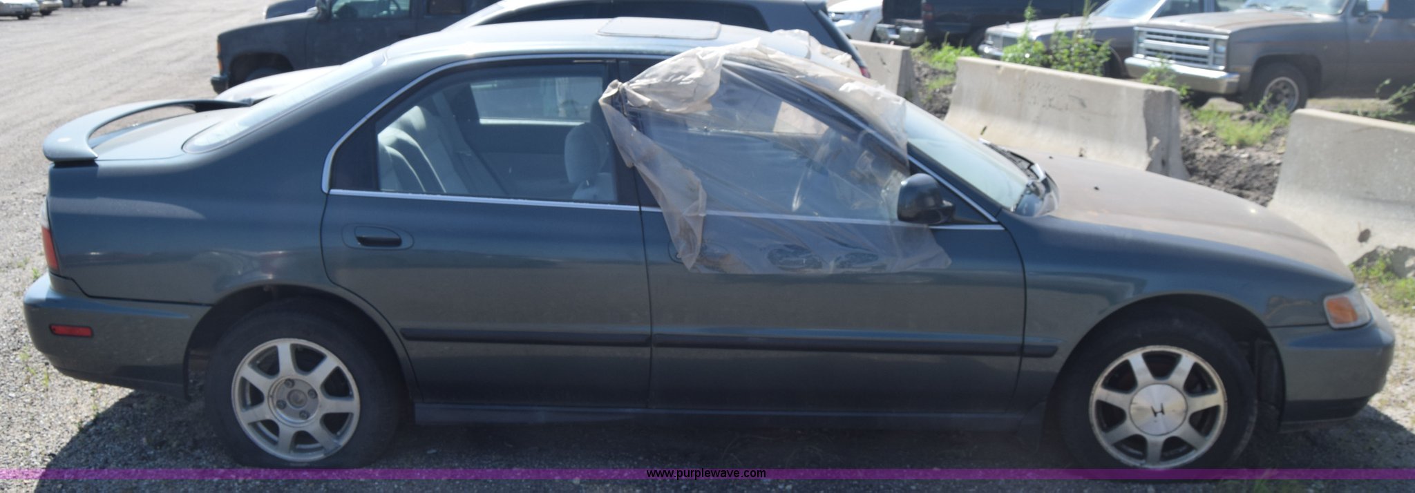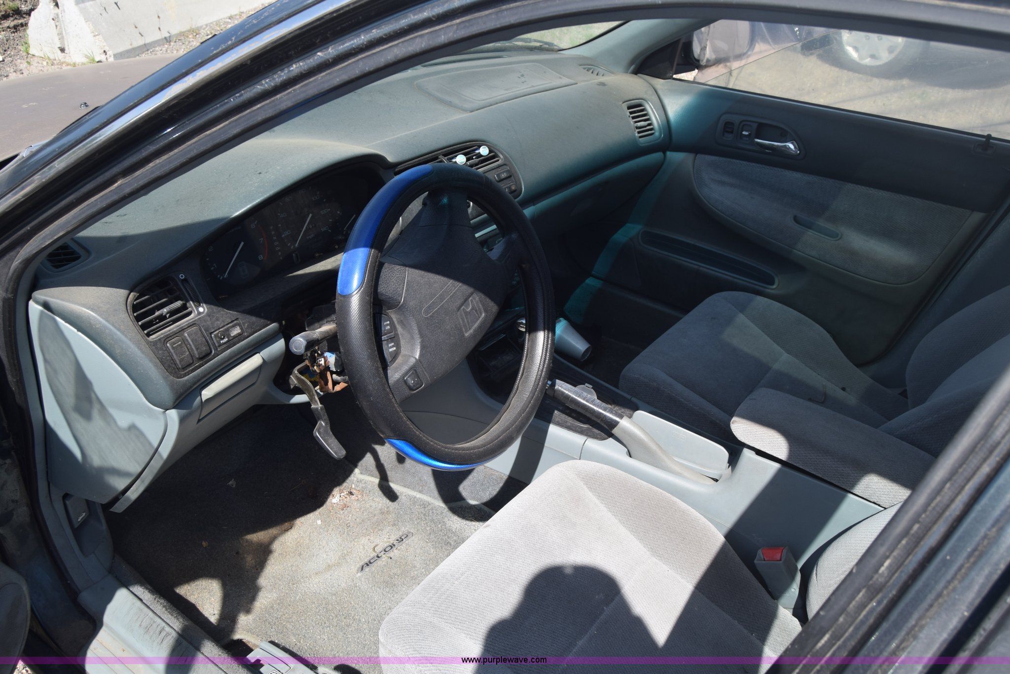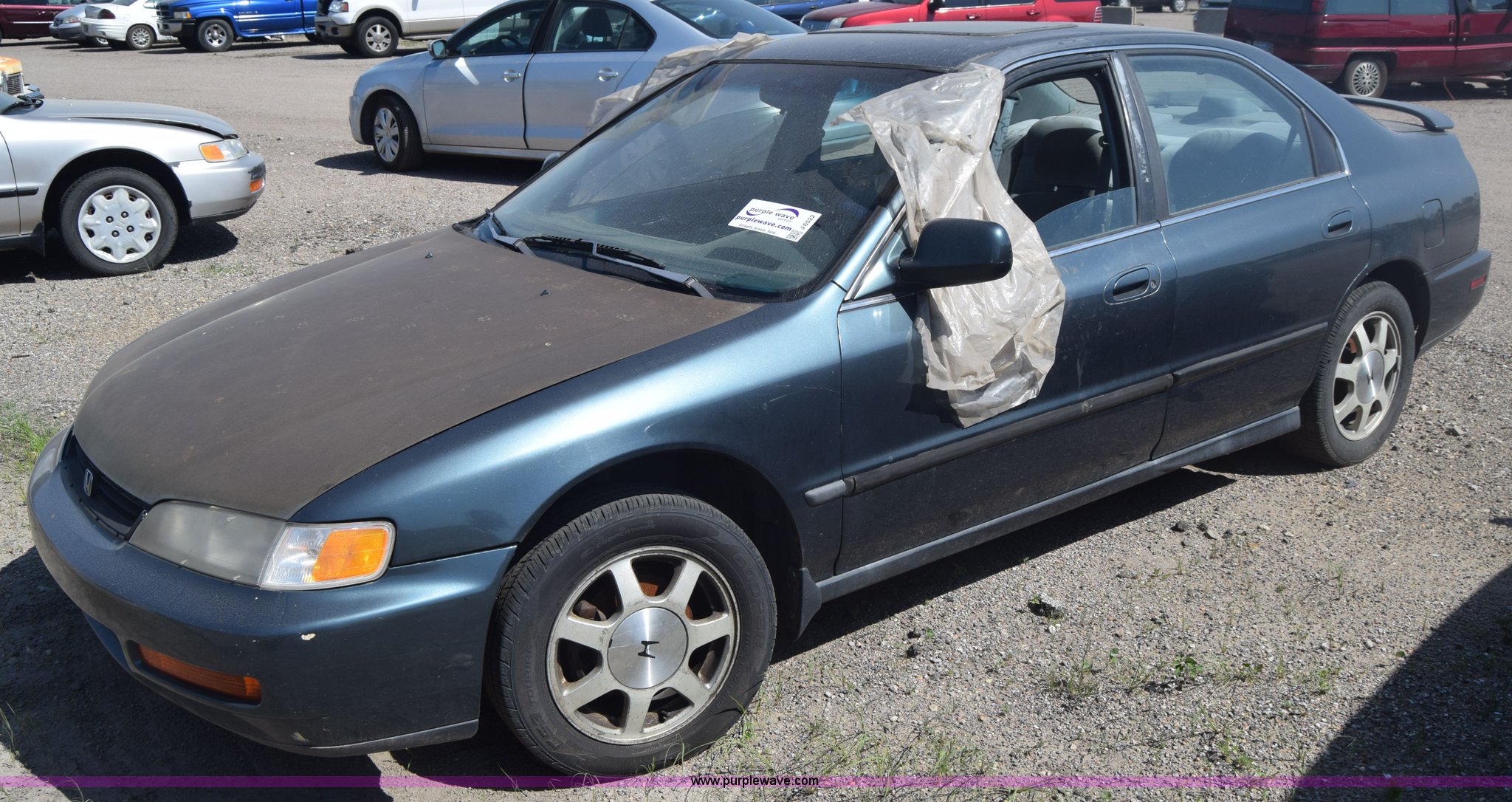 Purple Wave is selling a used Passenger Vehicle in Kansas. This item is a 1997 Honda Accord LX with the following: 199,797 miles on odometer, 2.2L L4 SOHC 16V gas engine, Automatic transmission, AC and heat, Tilt, Cruise, AM/FM/cassette, Power windows, locks, and mirrors, Cloth interior, 195/60R15 tires, Interior/exterior cosmetic damage, Dents and scratches, Paint faded, One tire flat, Window broken, Steering console disassembled, Case# 15C505660