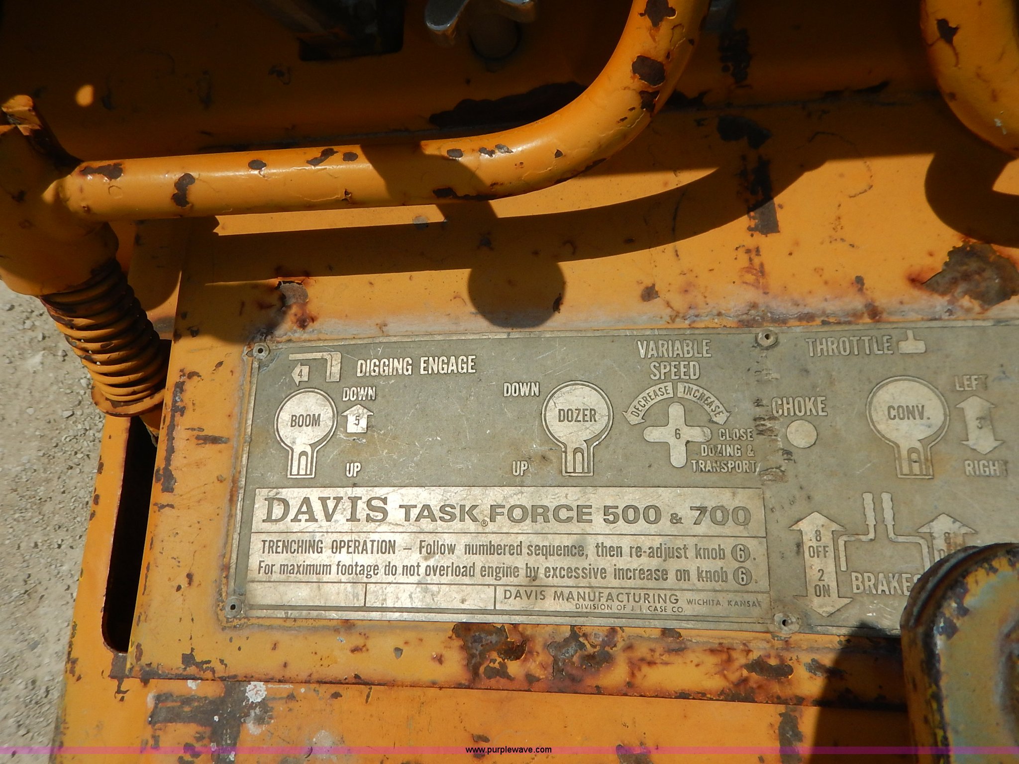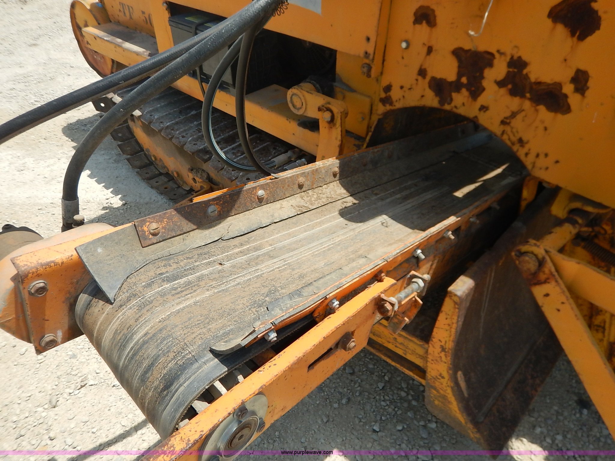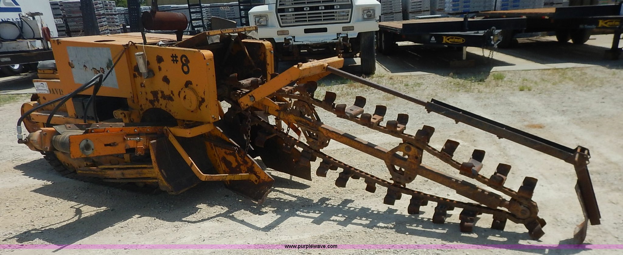 Purple Wave is selling a used Trencher or Rock Saw in Kansas. This item is a Davis TF500 trencher with the following: 604 hours on meter, Kohler Command gas engine, 25 HP, Variable speed transmission, Creep, Vinyl seat, Boom, dozer, and conveyor throttle controls, 55"L x 10"W side conveyor, 8'L x 10"W trencher, 52"W back fill blade, Weld-on blade, Rear weights, 10"W steel track pads, Recently replaced engine