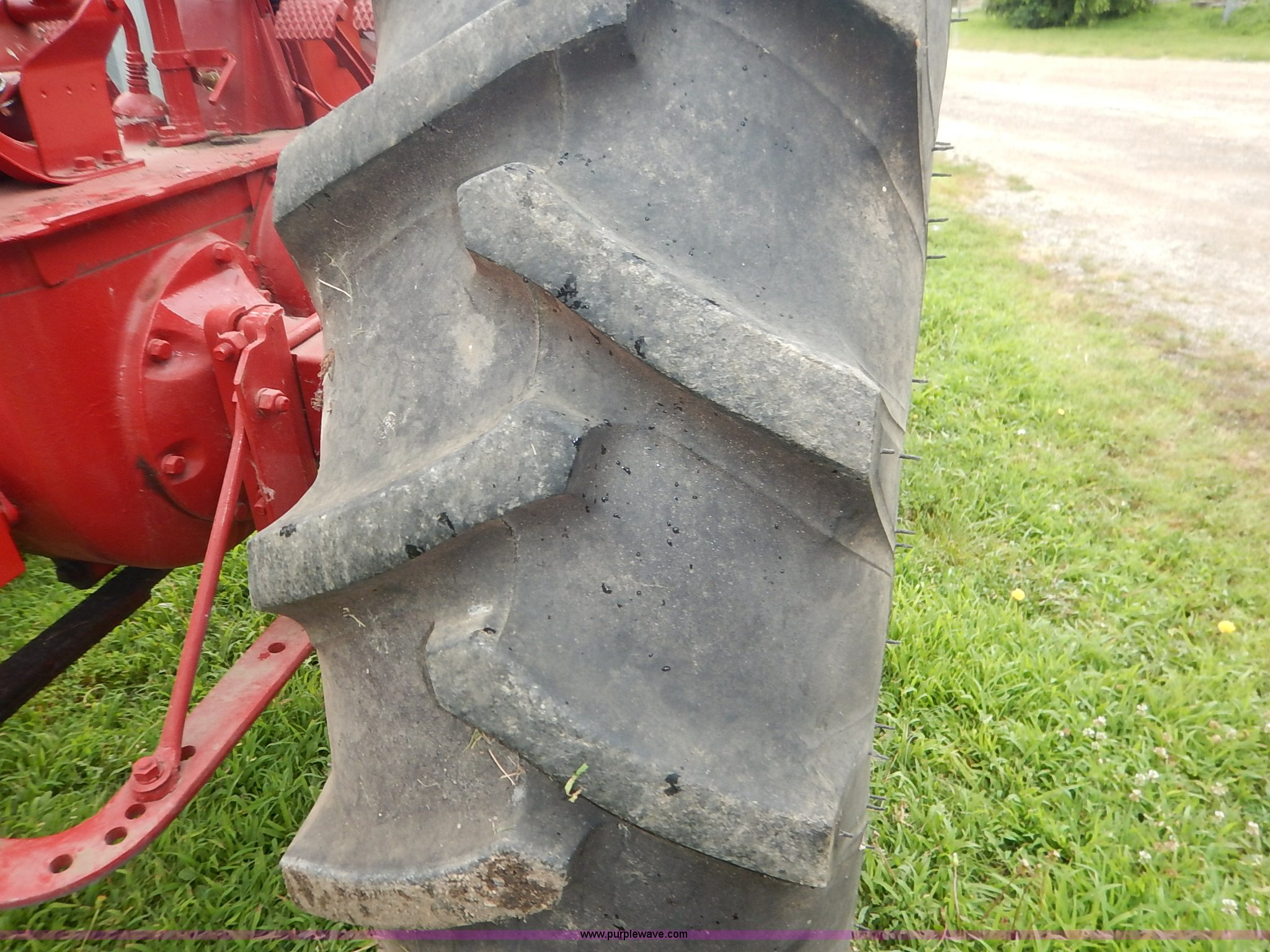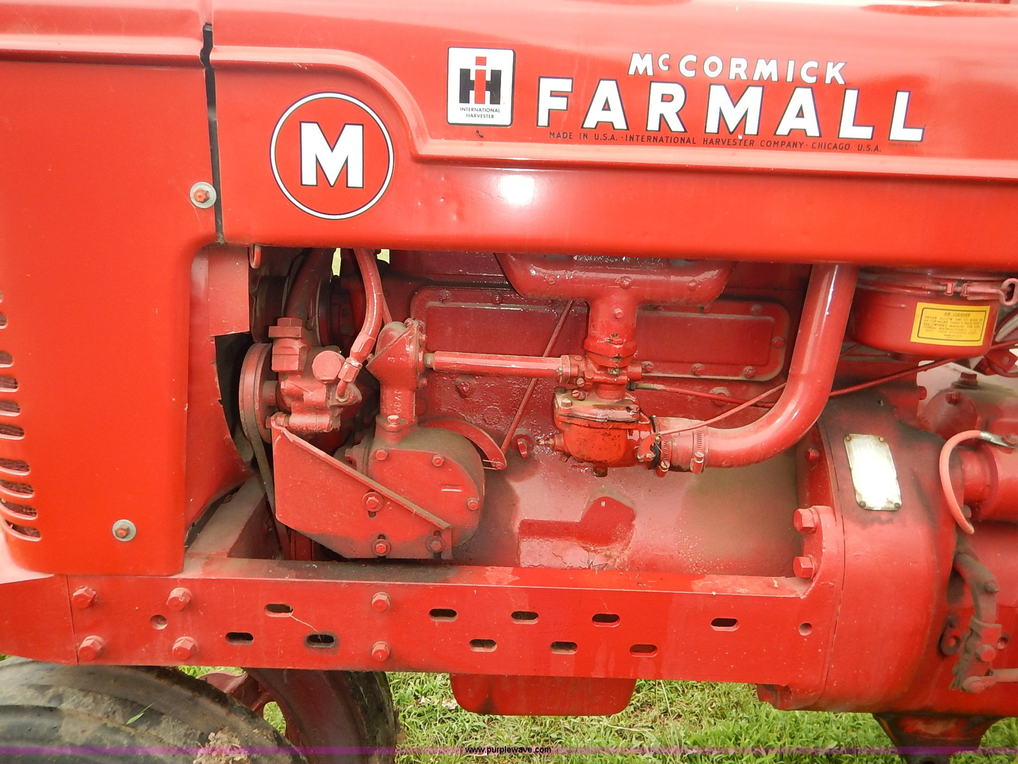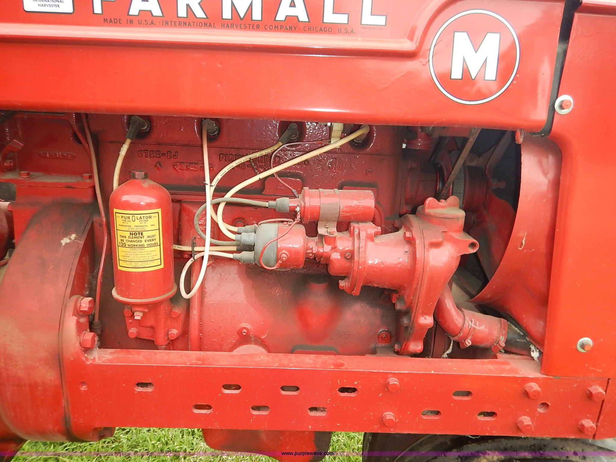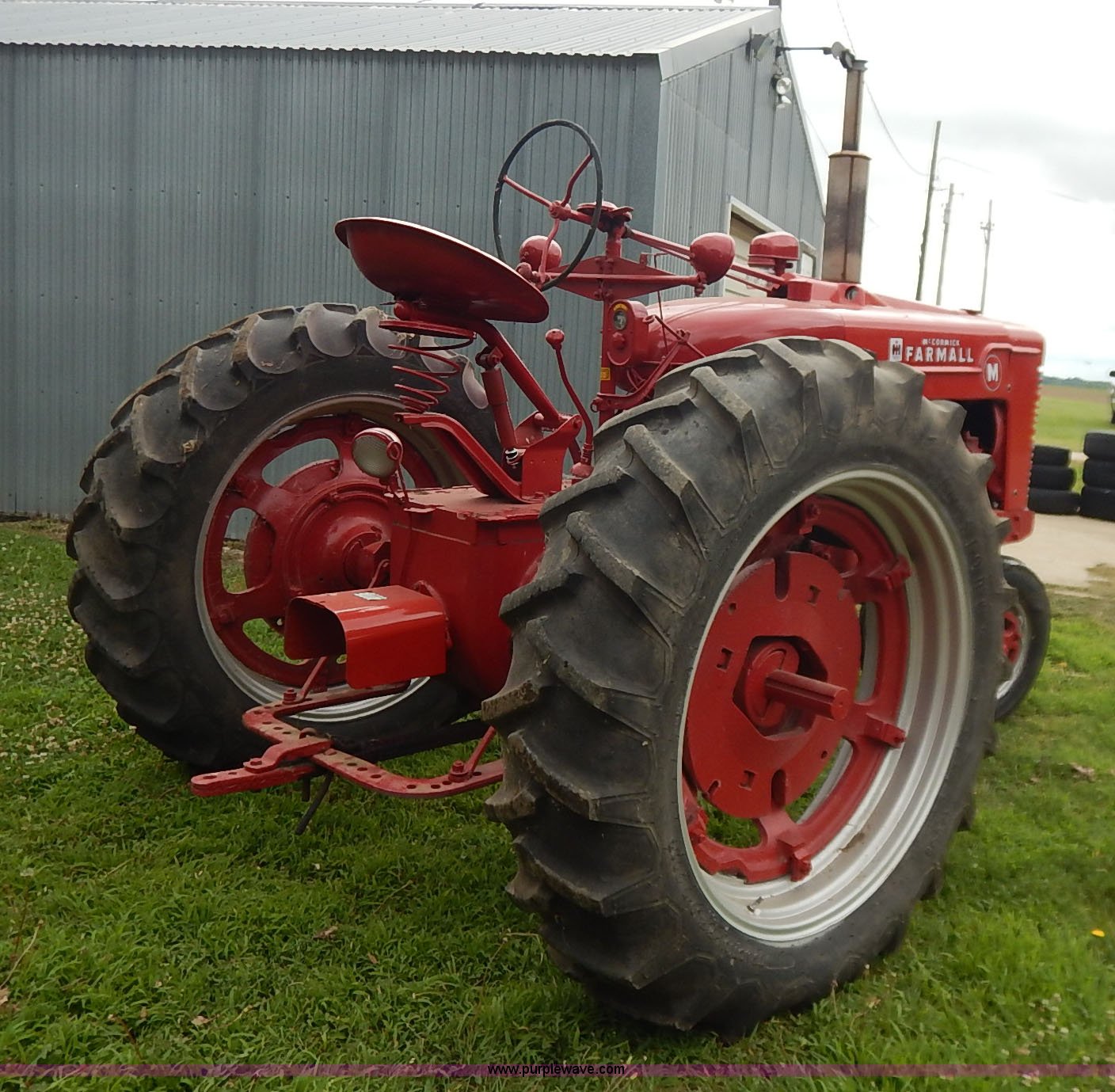 Purple Wave is selling a used Tractor in Kansas. This item is a 1950 Farmall M tractor with the following: International C248 4.1L four cylinder gas engine, 25 HP, Engine overhauled 10 hours ago, Manual transmission, 5F-1R gears, Grinder belt flywheel, 540 PTO, Draw bar, Rear wheel weights, Co-op 6.00-16 front tires, Co-op 12.6-33 rear tires, Recently replaced 12V battery, Carburetor has been rebuilt, One owner, Serial FBK223466X1