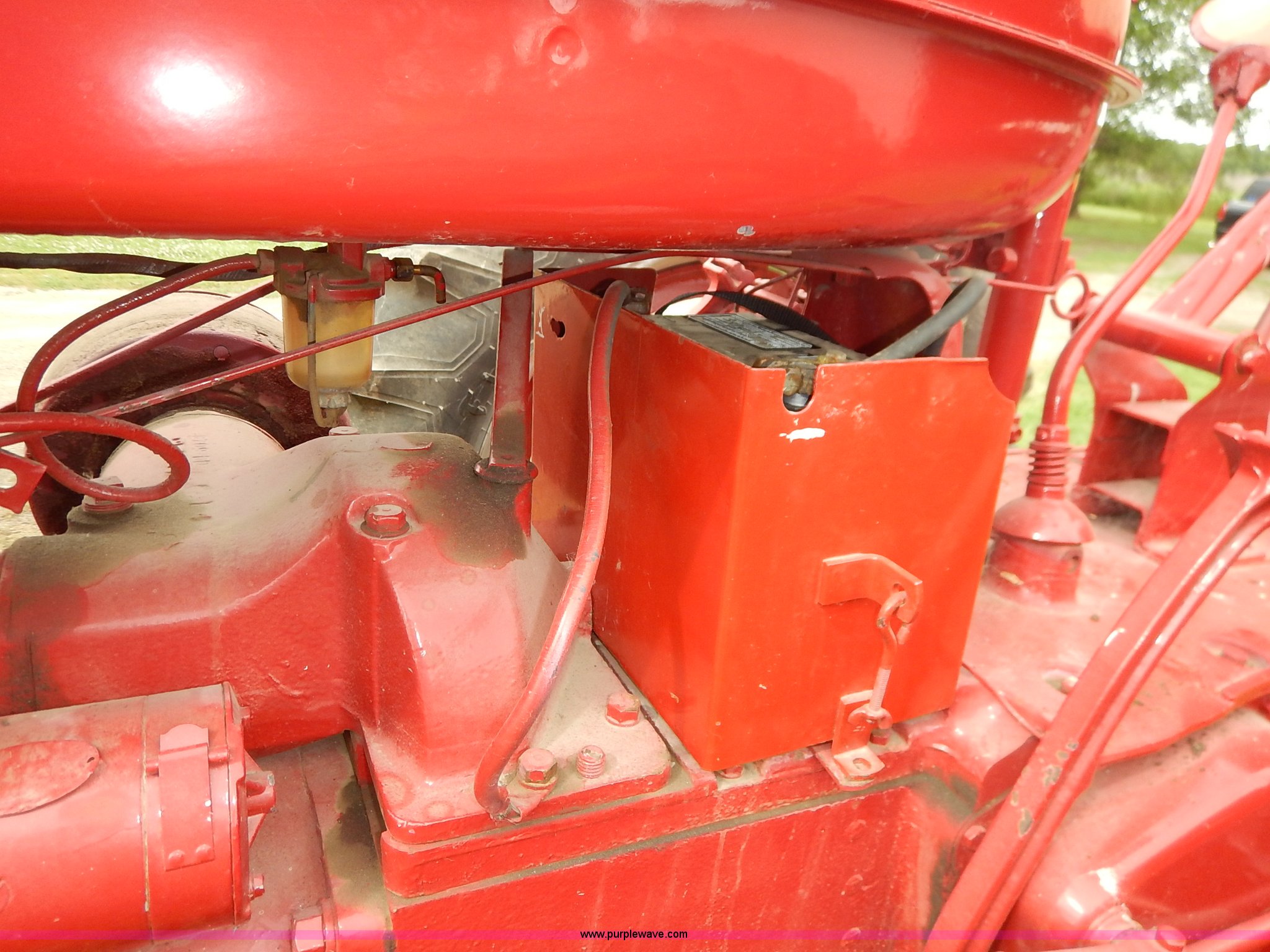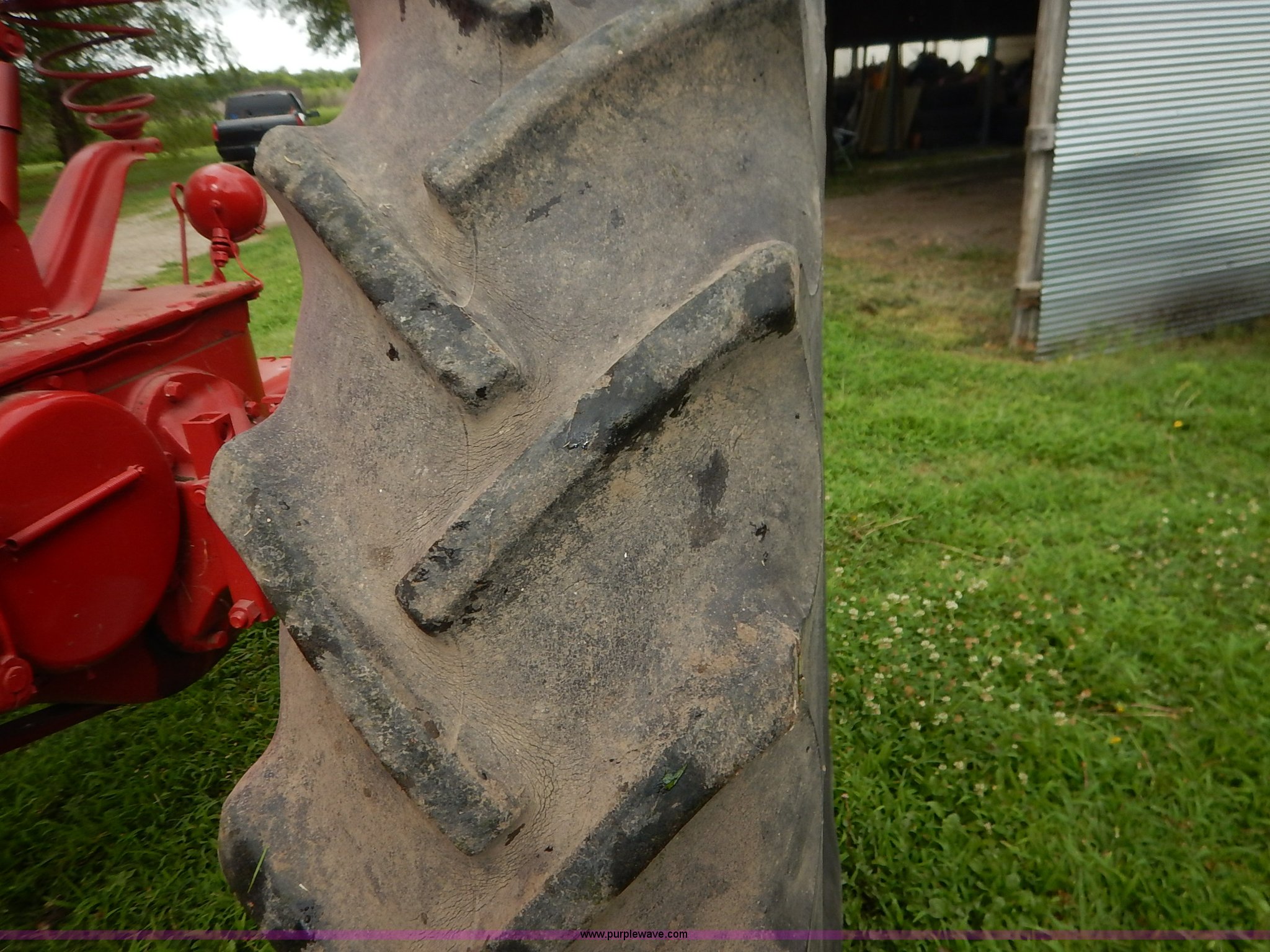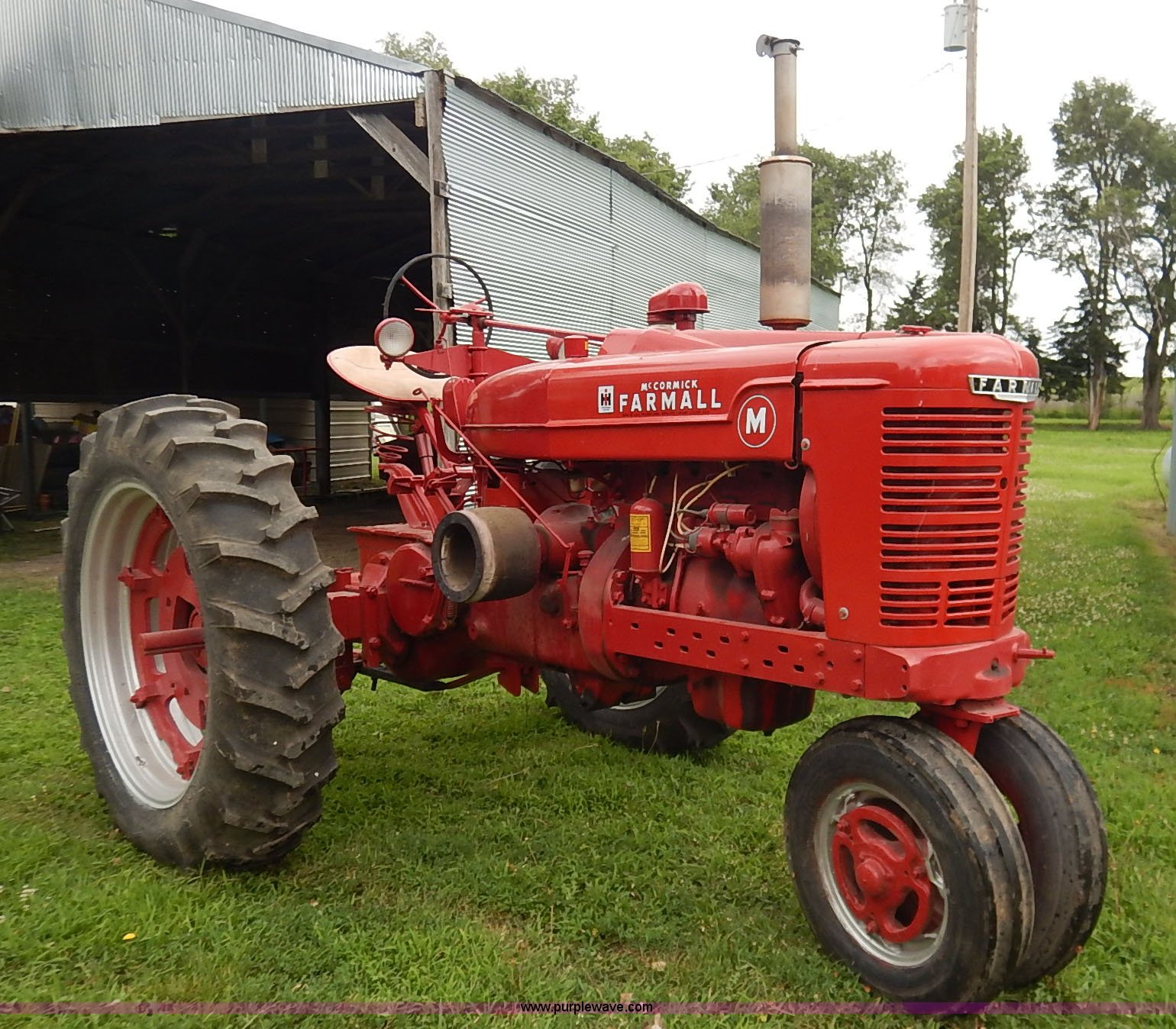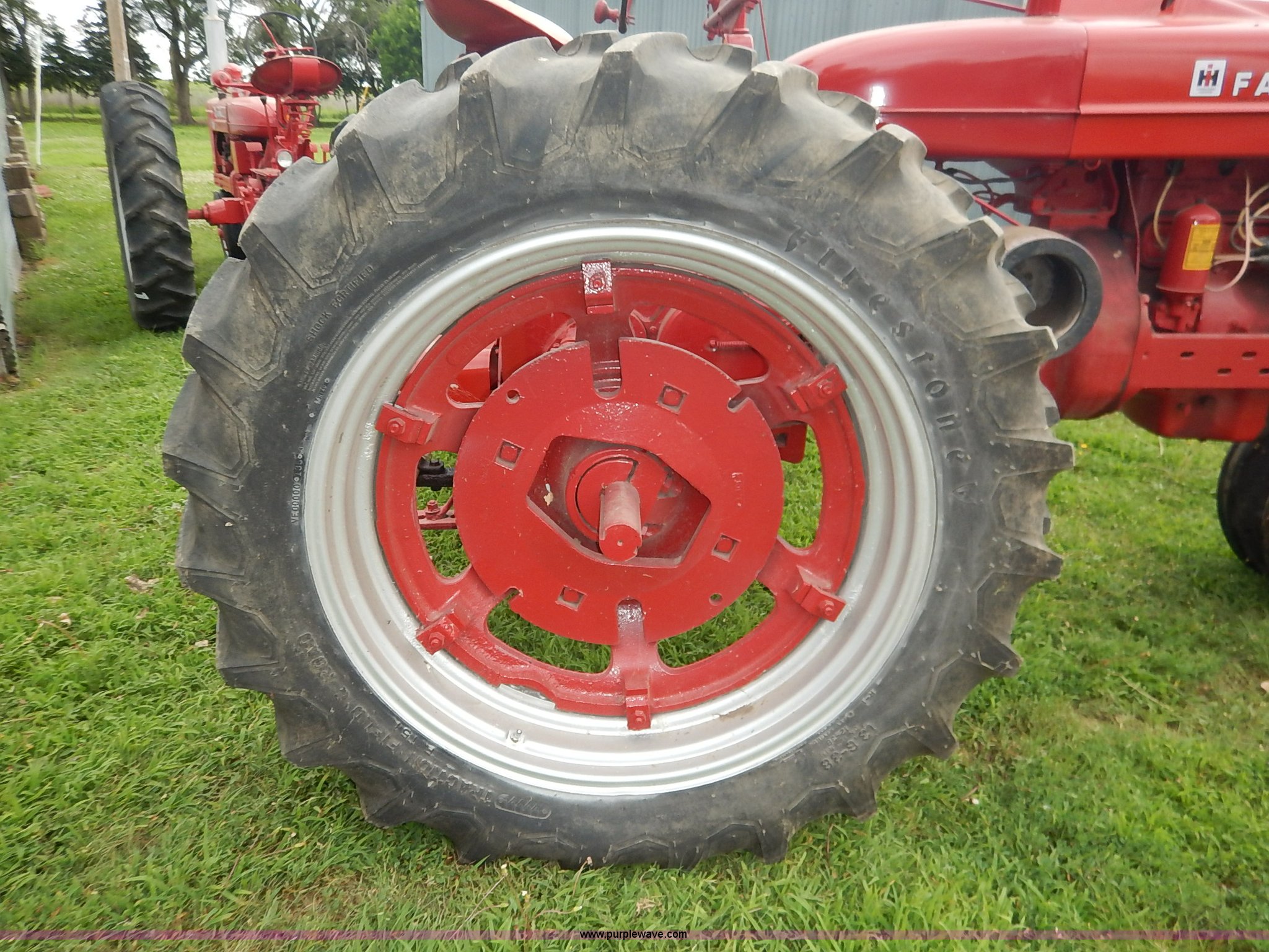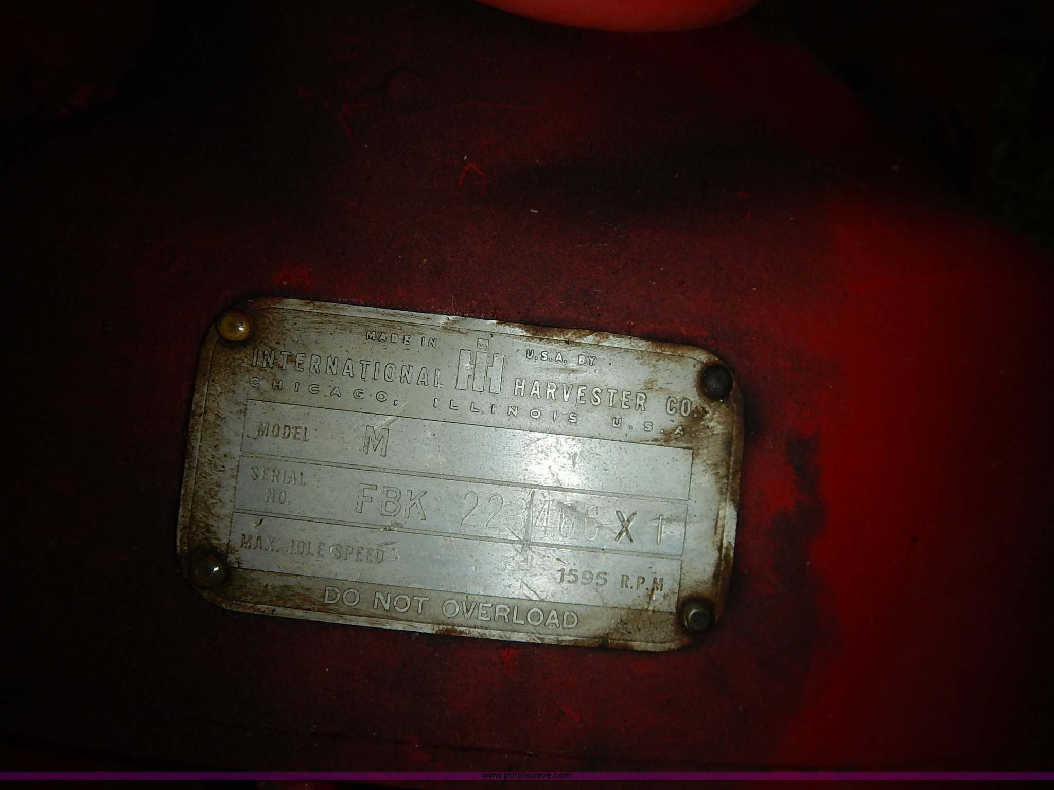 Purple Wave is selling a used Tractor in Kansas. This item is a 1950 Farmall M tractor with the following: International C248 4.1L four cylinder gas engine, 25 HP, Engine overhauled 10 hours ago, Manual transmission, 5F-1R gears, Grinder belt flywheel, 540 PTO, Draw bar, Rear wheel weights, Co-op 6.00-16 front tires, Co-op 12.6-33 rear tires, Recently replaced 12V battery, Carburetor has been rebuilt, One owner, Serial FBK223466X1