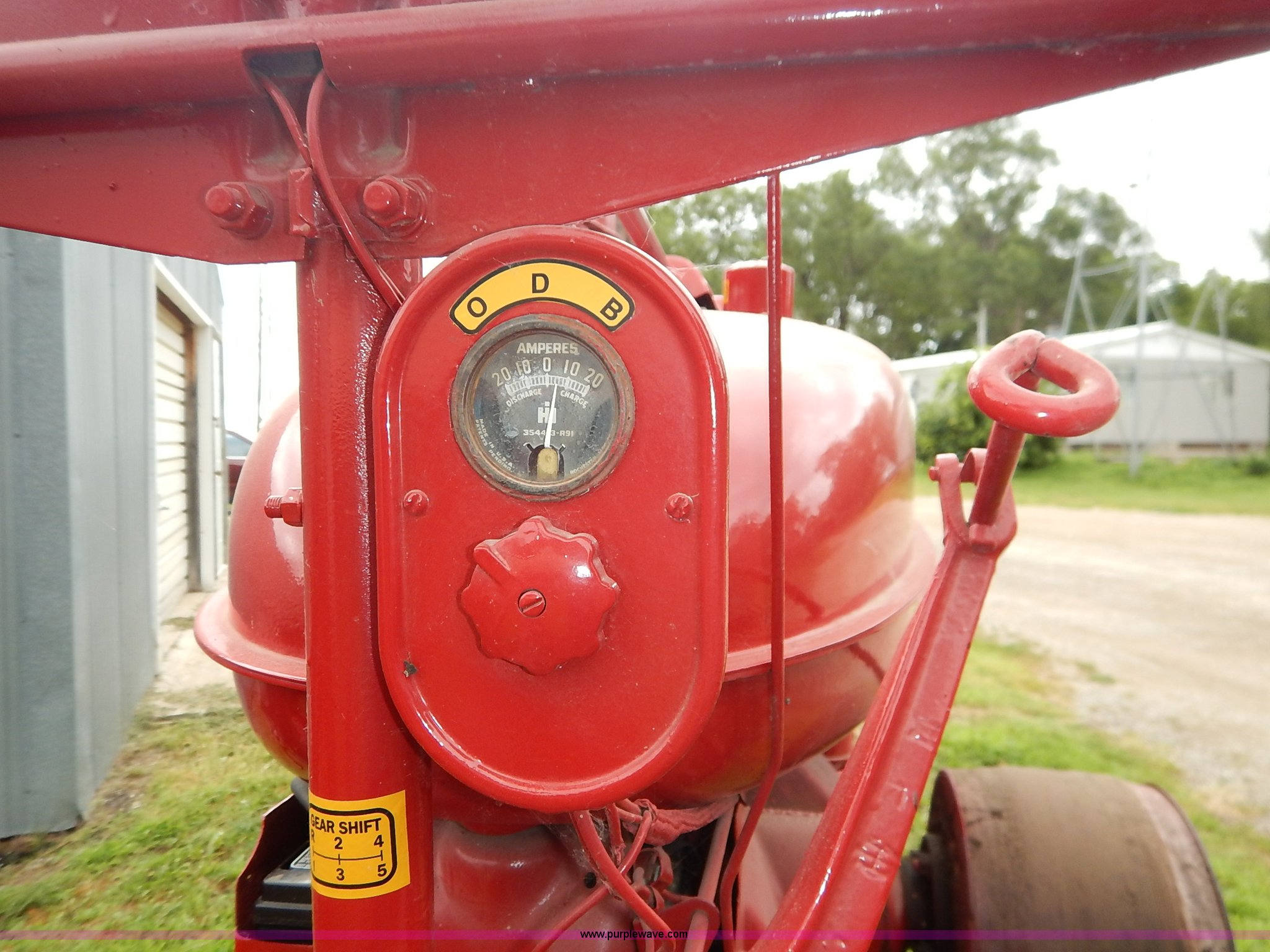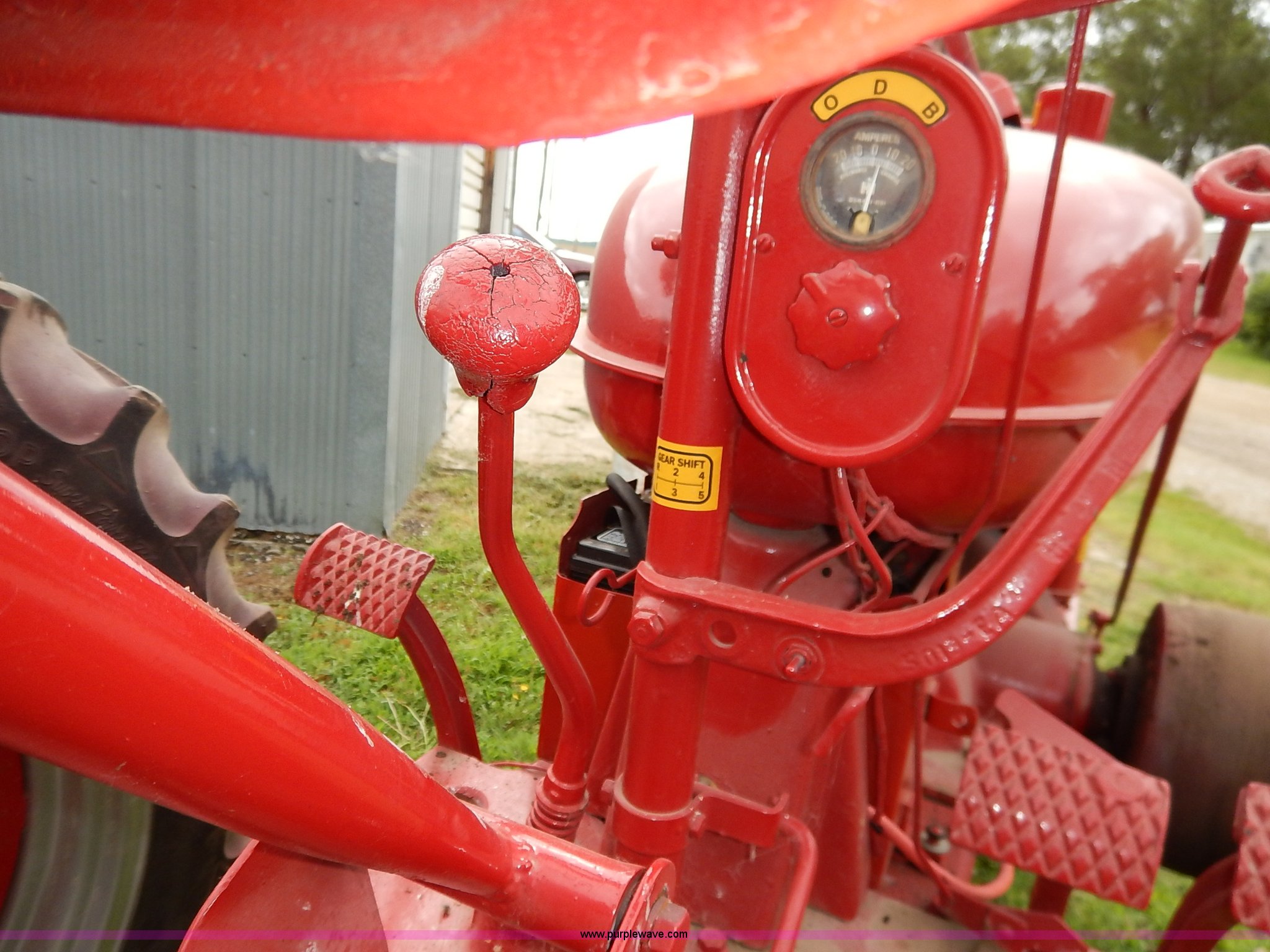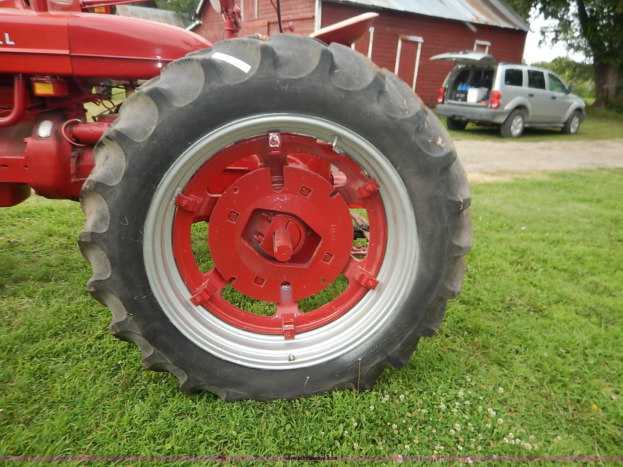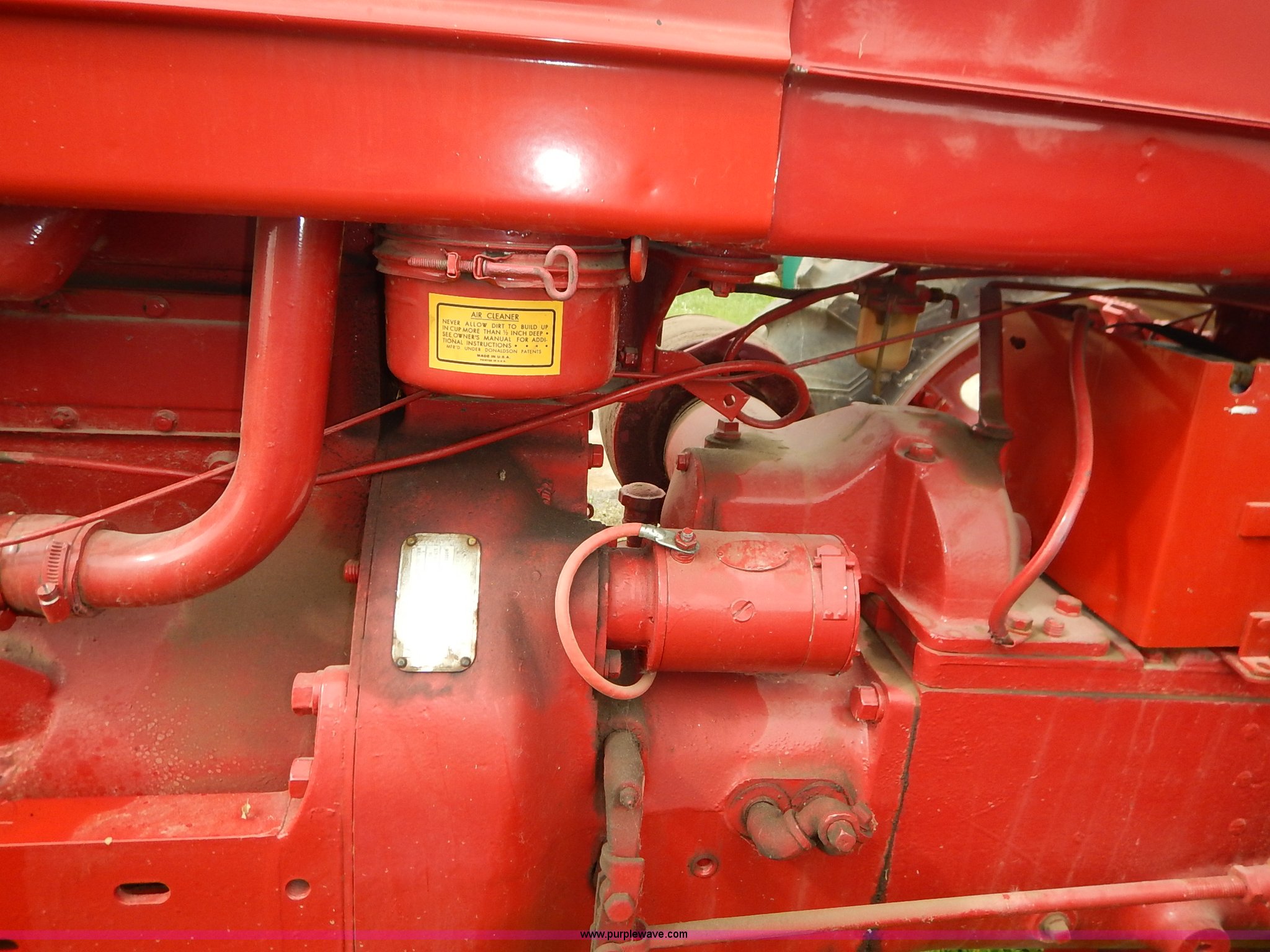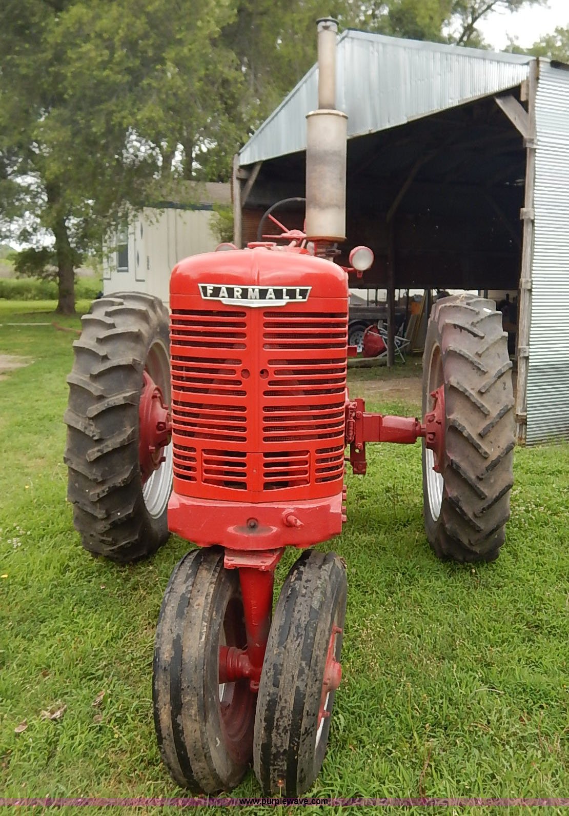 Purple Wave is selling a used Tractor in Kansas. This item is a 1950 Farmall M tractor with the following: International C248 4.1L four cylinder gas engine, 25 HP, Engine overhauled 10 hours ago, Manual transmission, 5F-1R gears, Grinder belt flywheel, 540 PTO, Draw bar, Rear wheel weights, Co-op 6.00-16 front tires, Co-op 12.6-33 rear tires, Recently replaced 12V battery, Carburetor has been rebuilt, One owner, Serial FBK223466X1