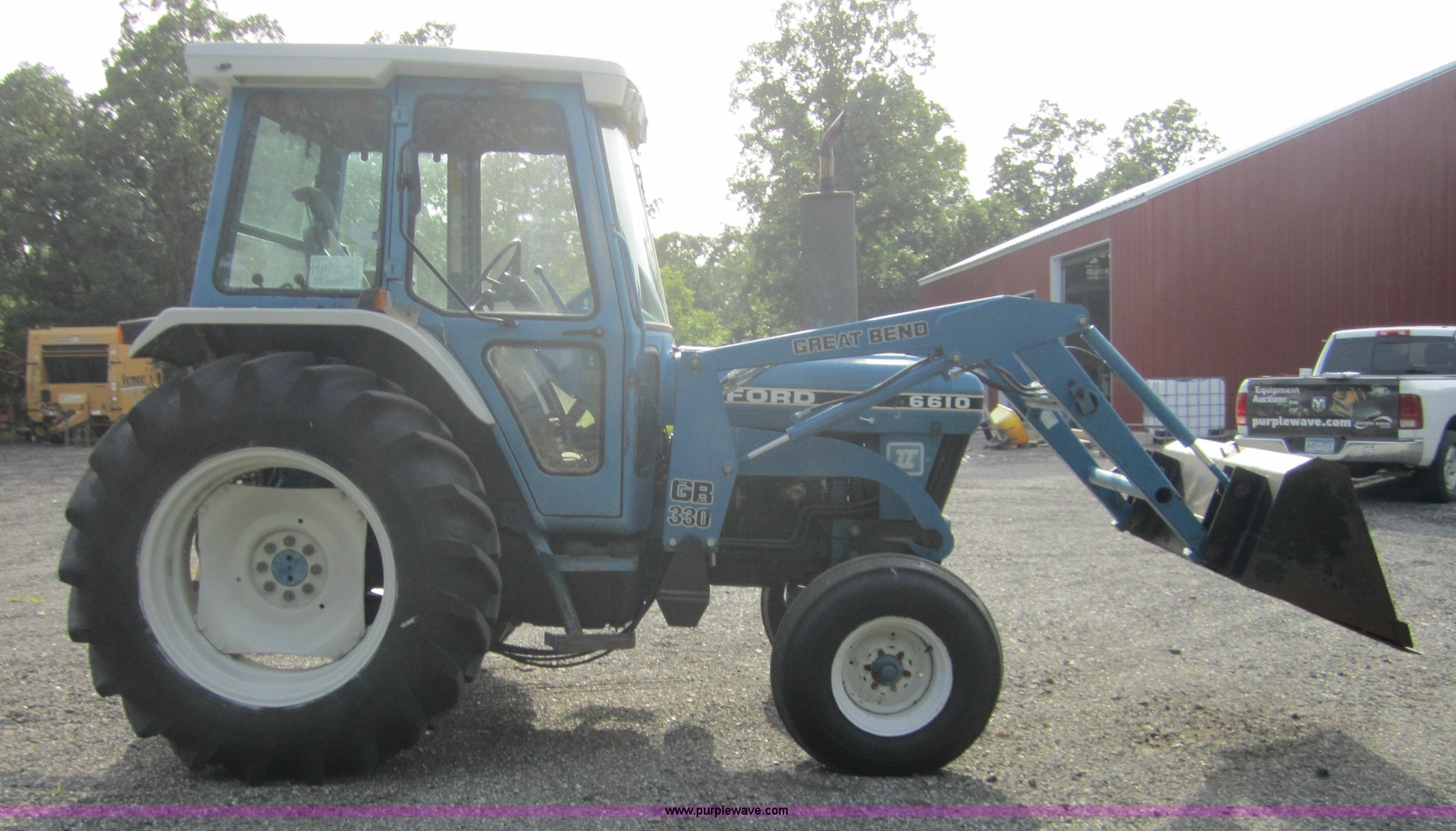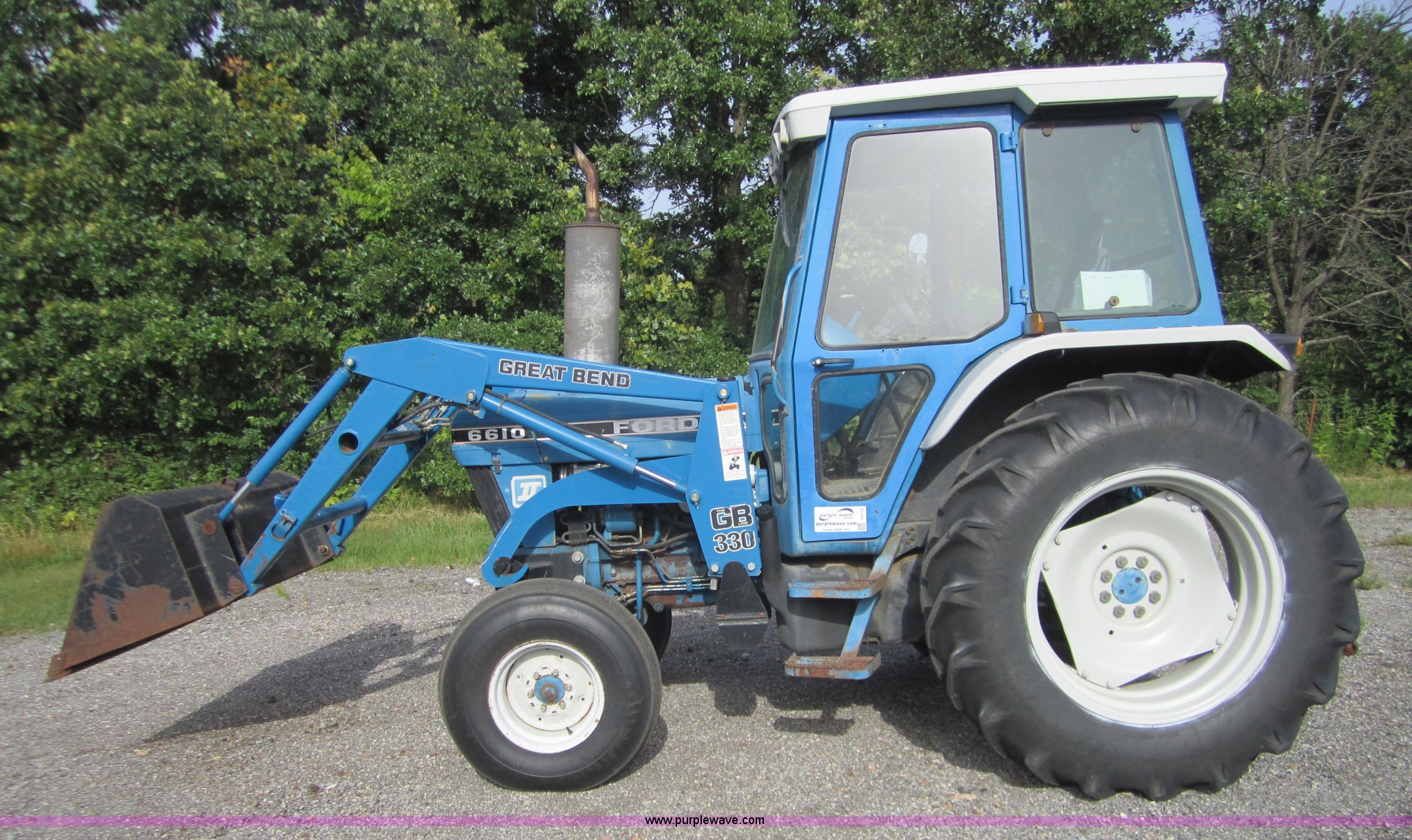 Purple Wave is selling a used Tractor in Oklahoma. This item is a 1988 Ford 6610 Series II tractor with the following: 4,895 hours on meter, Hours may vary, still in use, Dual range transmission, 8F-4R gears, Differential lock, AC and heat, Suspension seat, AM/FM/cassette, Great Bend 330 loader, 5'W bucket, Two-lever control, Three point, Seven pin outlet, 540/1000 PTO, (3) rear hydraulic remote sets, 10.00-16 front tires, 16.9/14-34 rear tires, Bale monitor not included, Serial BA98737