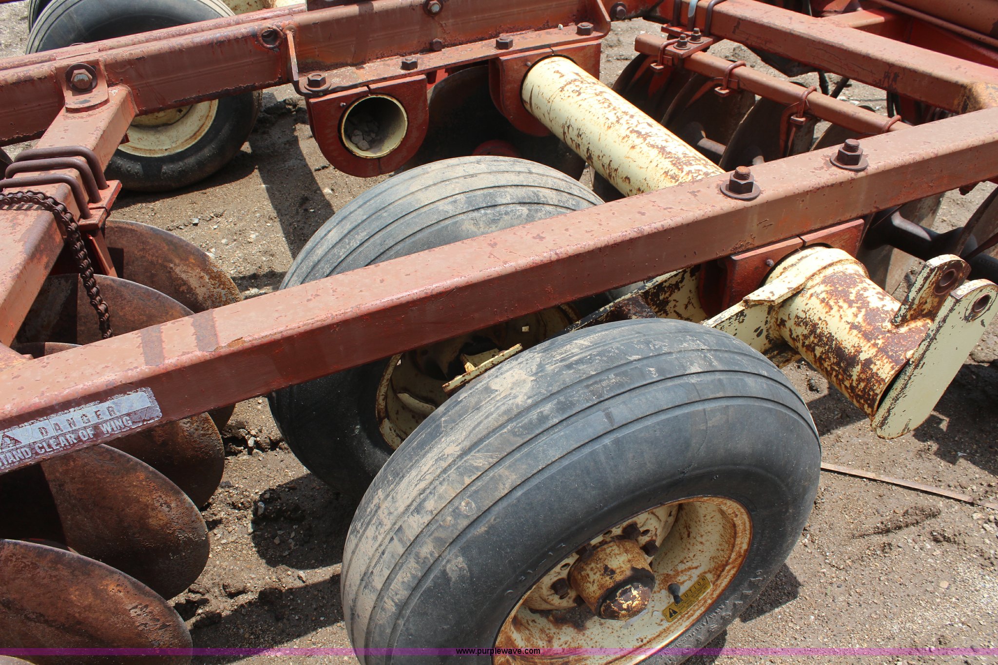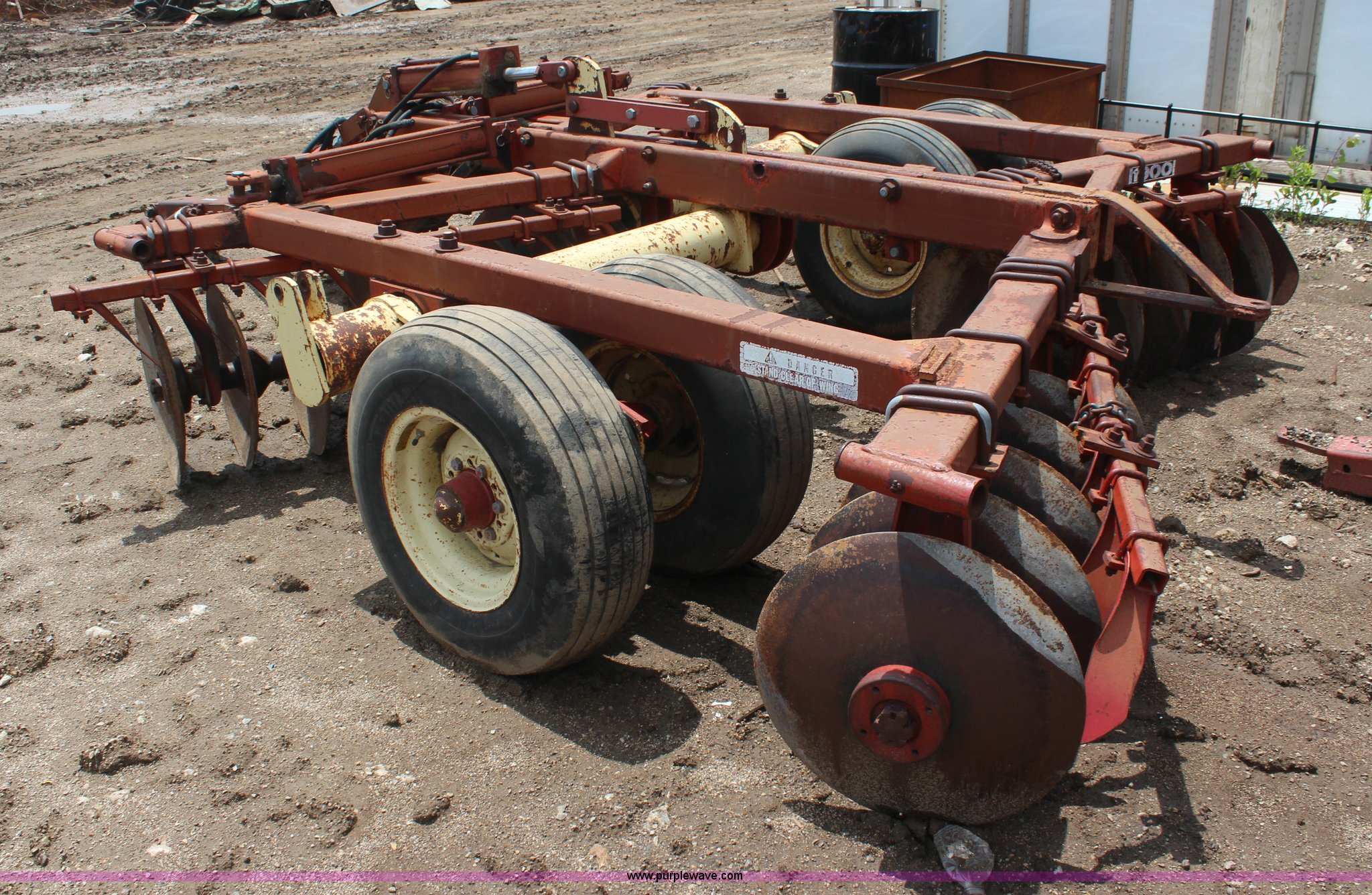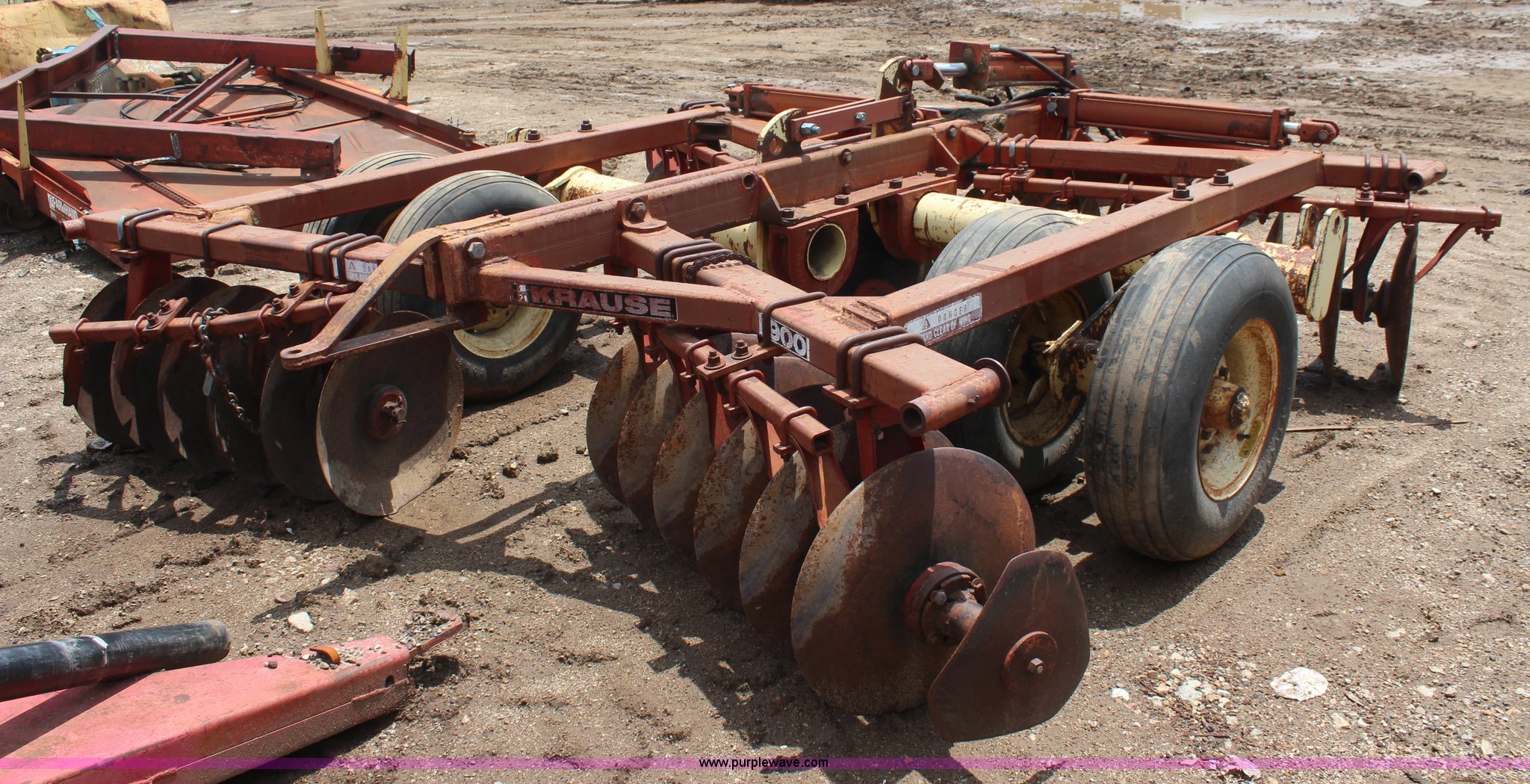 Purple Wave is selling a used Disk in Kansas. This item is a Krause disk with the following: 9'W, Center section, Hydraulic lift, 9.5L-15 tires