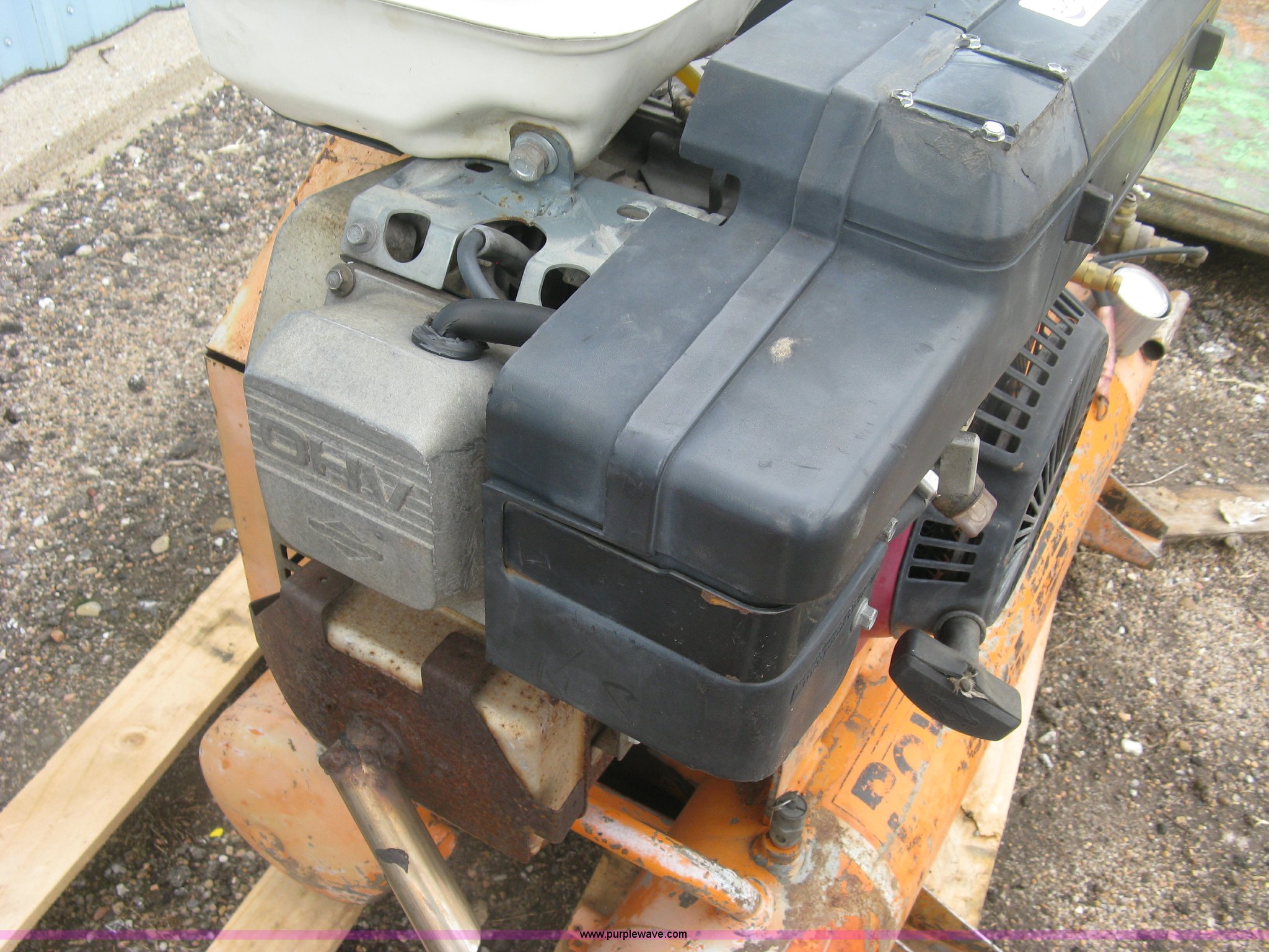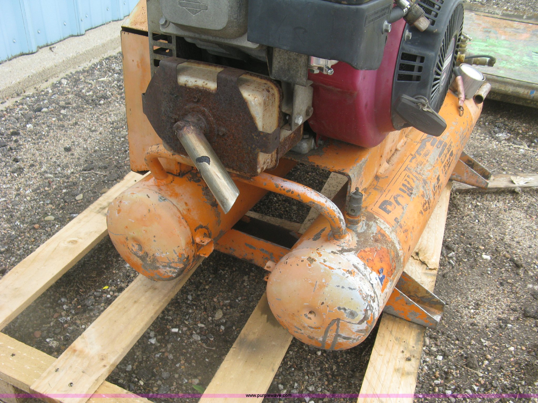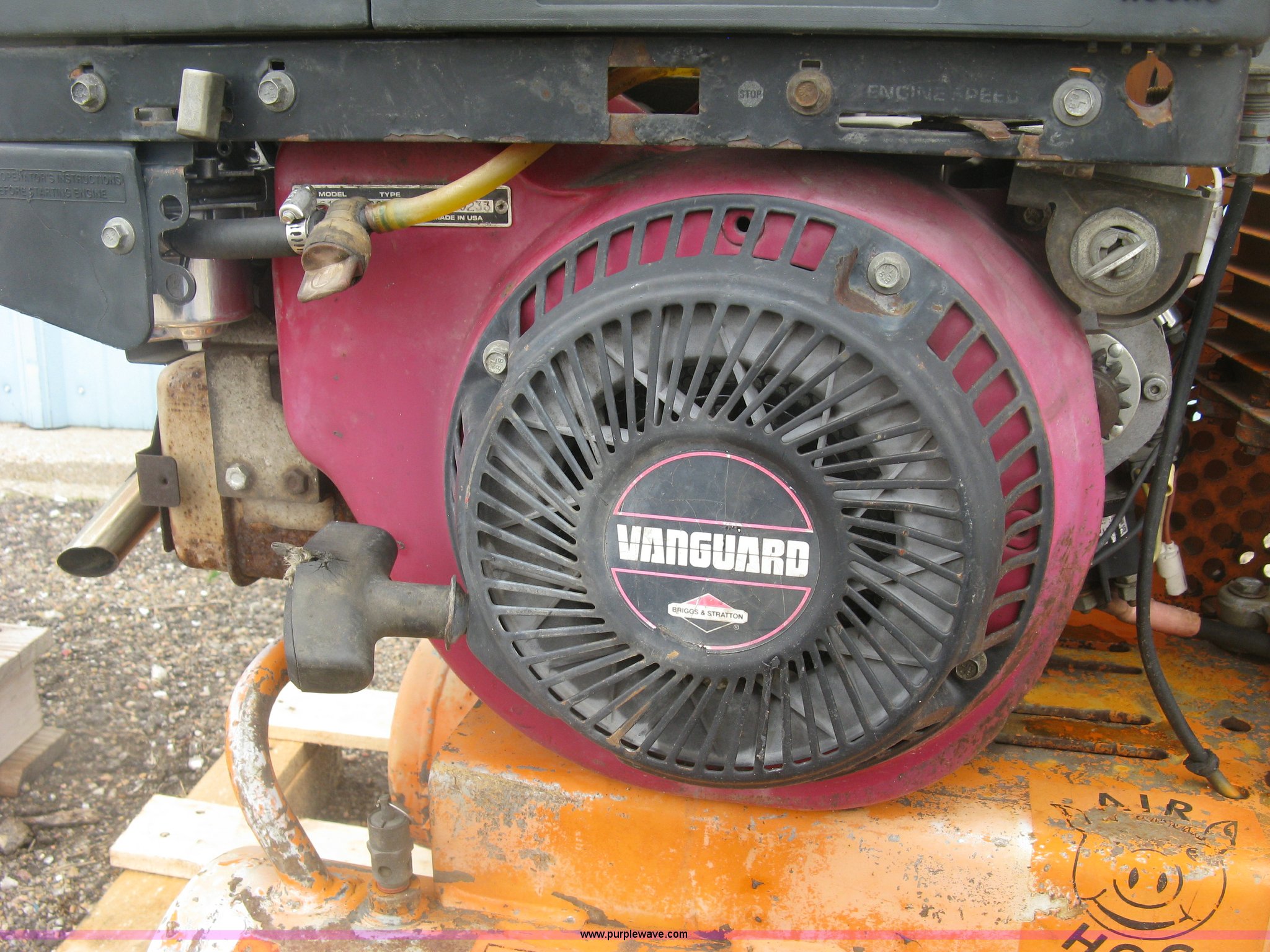 Purple Wave is selling a used Air Compressor in Kansas. This item is a Air Hog twin cylinder air compressor with the following: Vanguard 161437 gas engine, One tank leaks