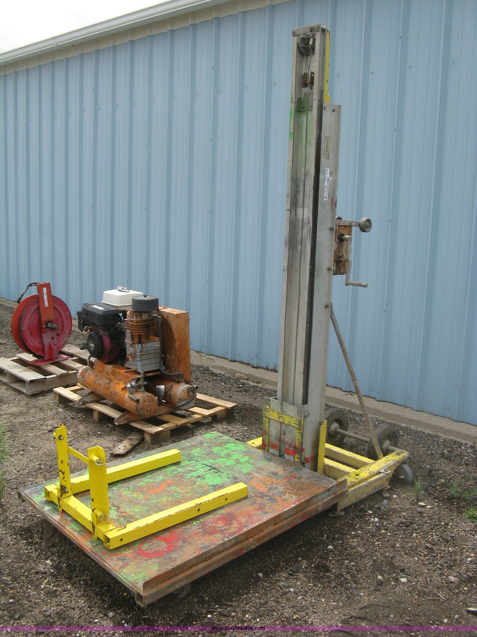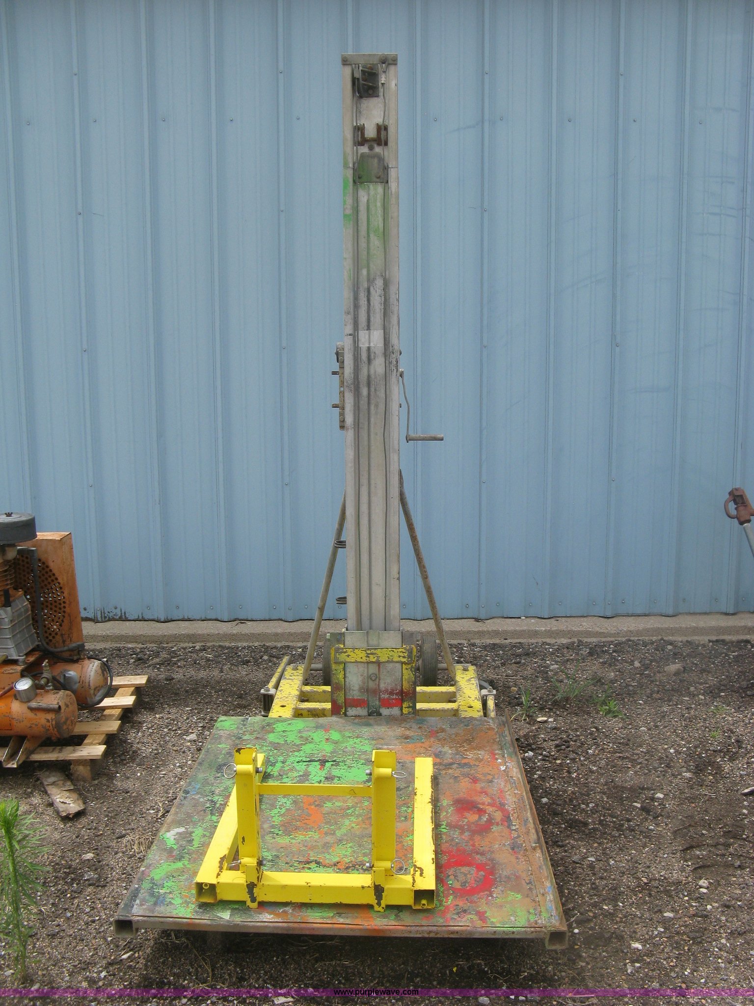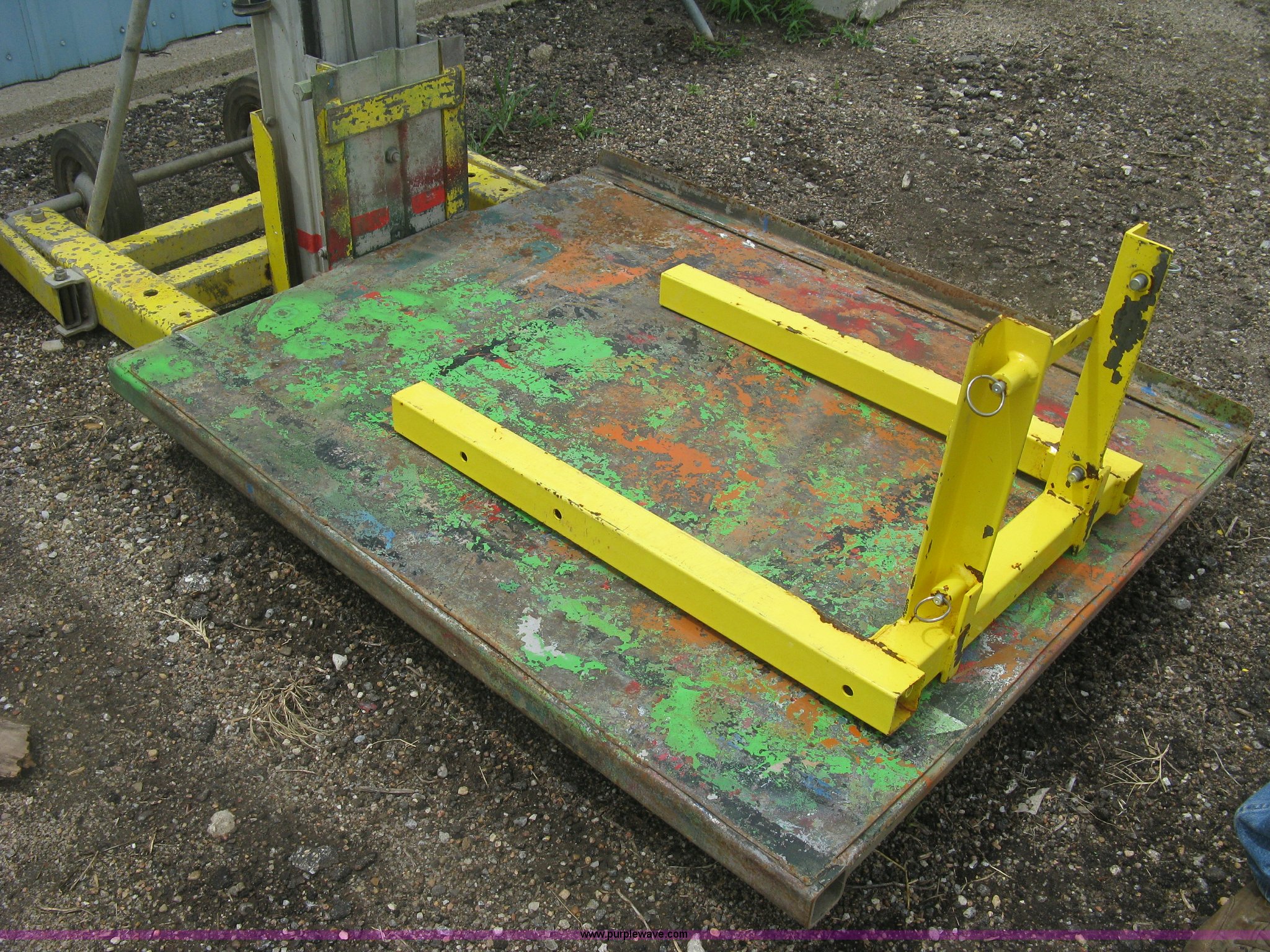 Purple Wave is selling a used Tools in Kansas. This item is a Sumner 760/18 manual platform/forklift with the following: 750 lbs capacity, Manual cable winch lift, 37" x 46" custom platform, 25"L bolt-on forks, Serial 1594