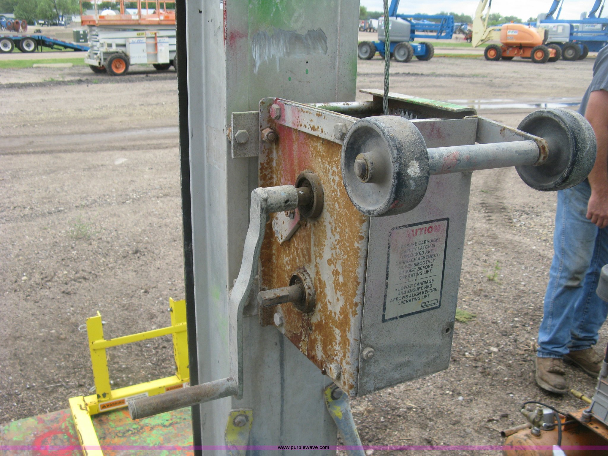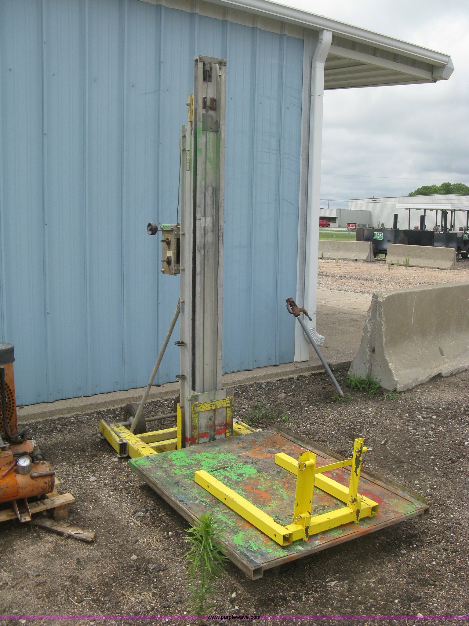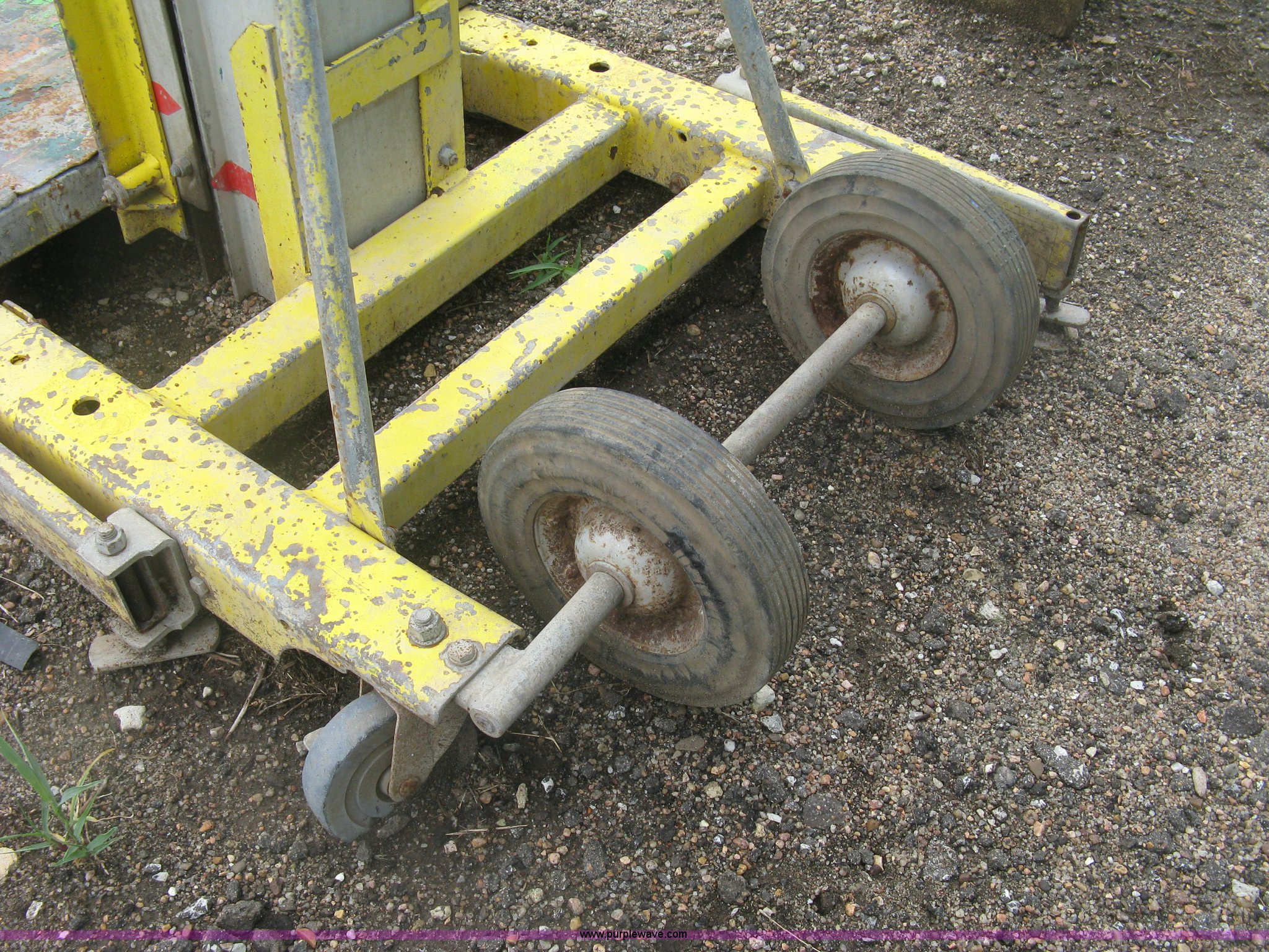 Purple Wave is selling a used Tools in Kansas. This item is a Sumner 760/18 manual platform/forklift with the following: 750 lbs capacity, Manual cable winch lift, 37" x 46" custom platform, 25"L bolt-on forks, Serial 1594