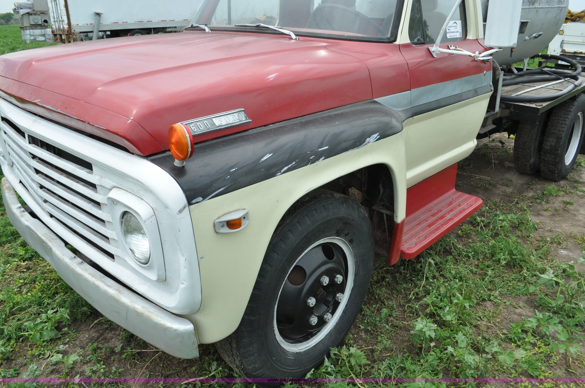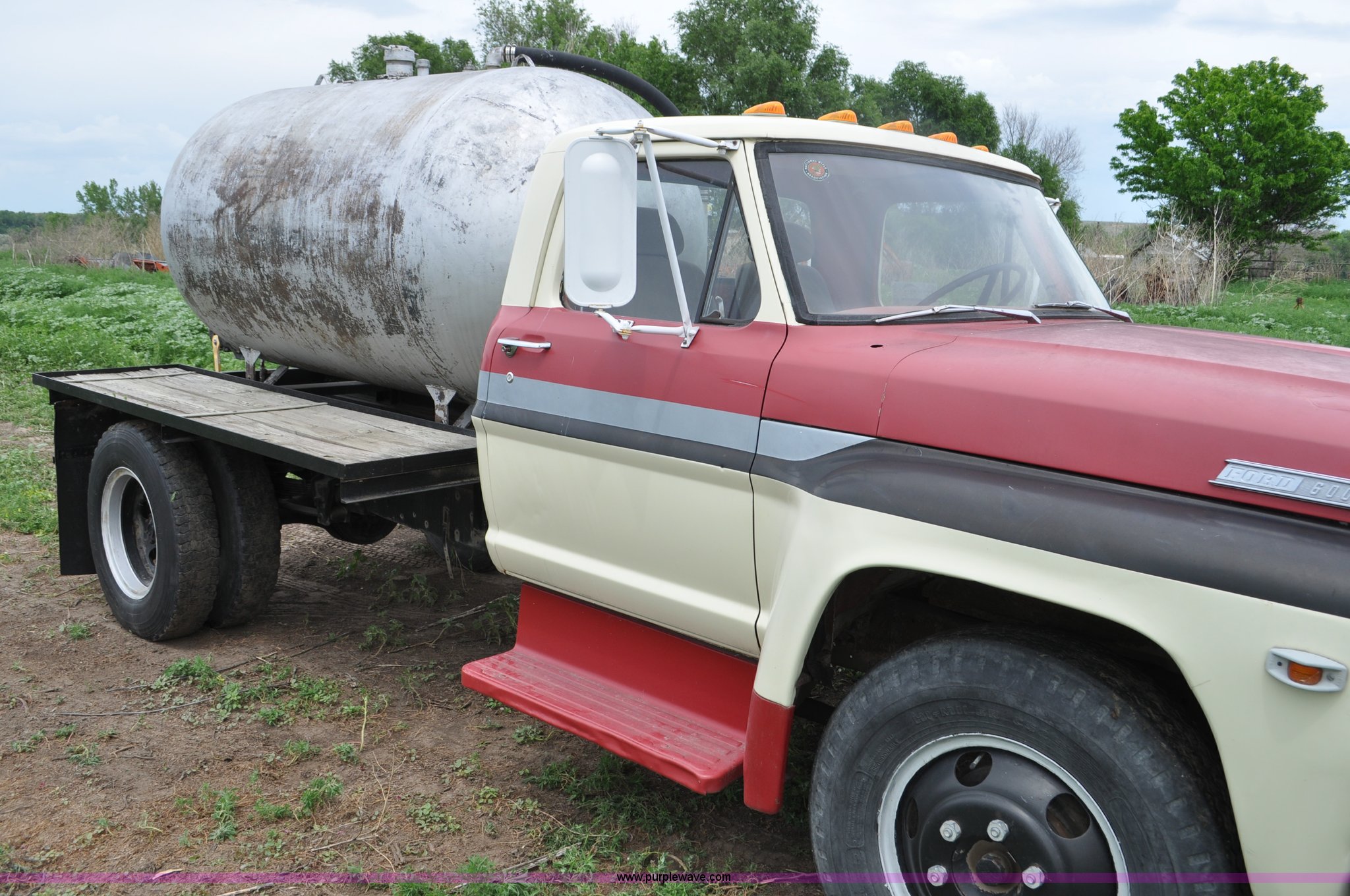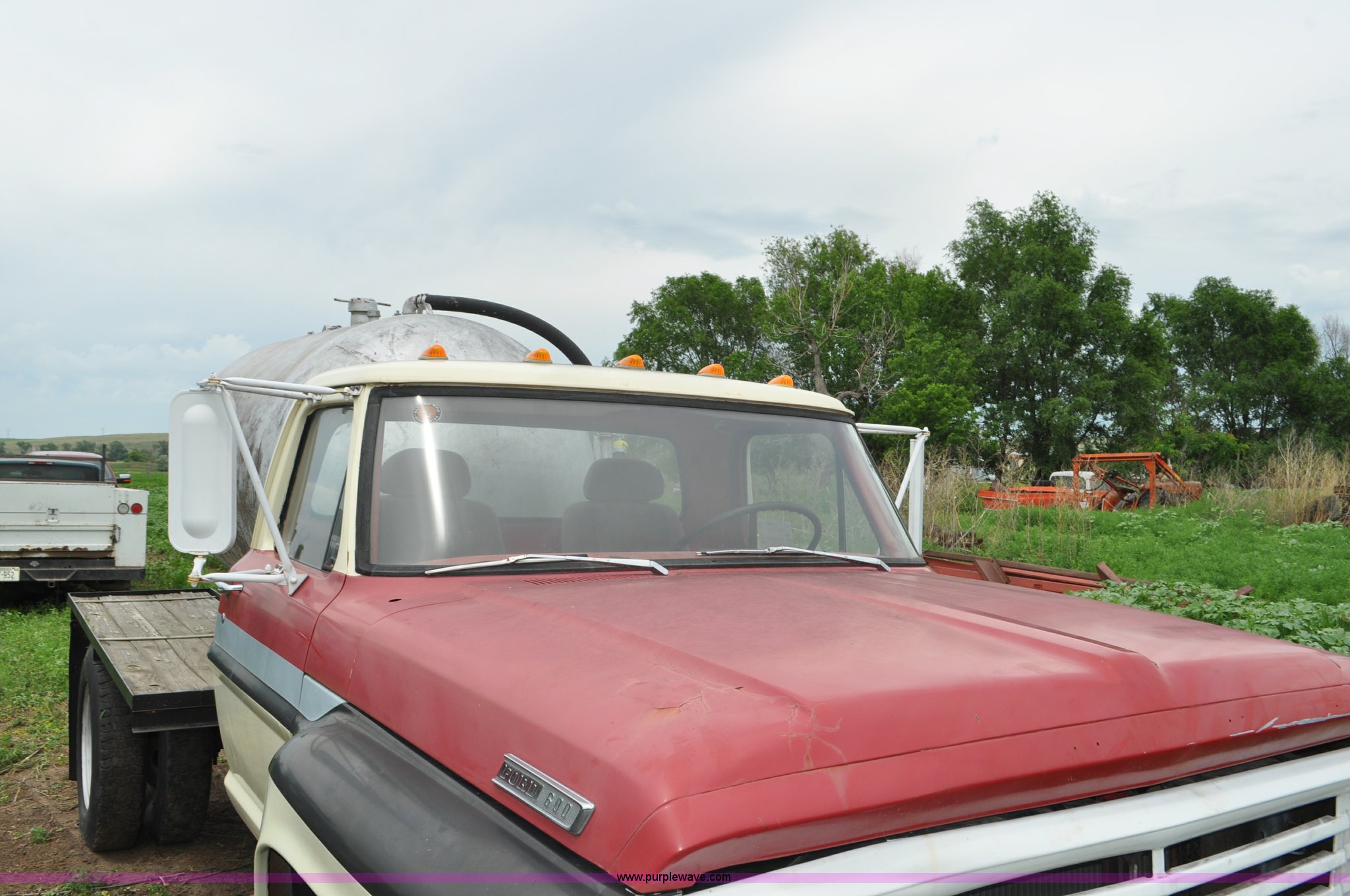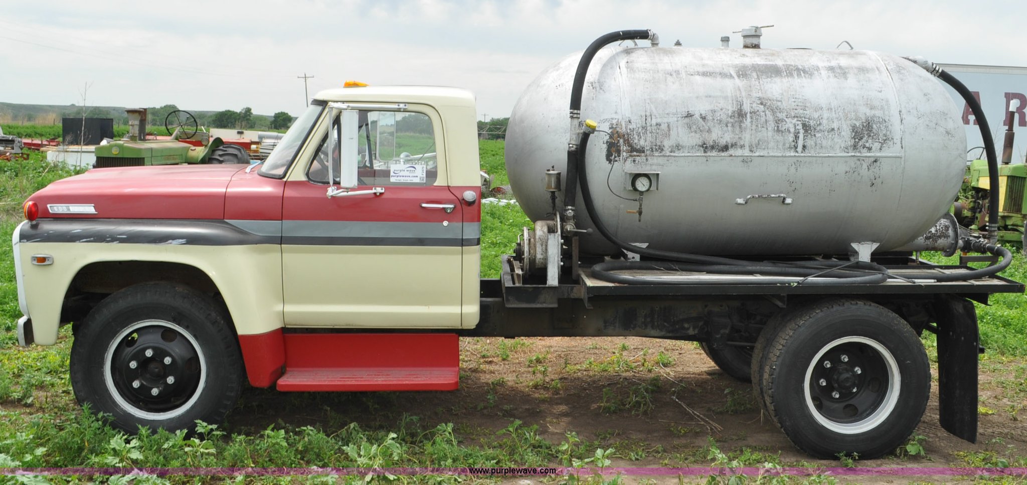 Purple Wave is selling a used Tank Truck or Water Truck in Nebraska. This item is a 1968 Ford F600 tank truck with the following: 66,302 miles on odometer, Ford 330 330 C.I.D. eight cylinder gas engine, Four speed manual transmission, Two speed rear end, Heat, 29" x 103" fender/storage panels, 1,000 gallon used oil tank, Approx. 200 gallon of oil in tank, Clay Equipment Corp. pump, Model MTA210, Pressure/vacuum, PTO driven, Serial 73G644, Spring suspension, Hydraulic brakes, 156" wheelbase, Goodyear 9.00x20 front tires, Goodyear 8.25x20 rear tires, Seat replaced with buckets seats, Interior/exterior cosmetic damage