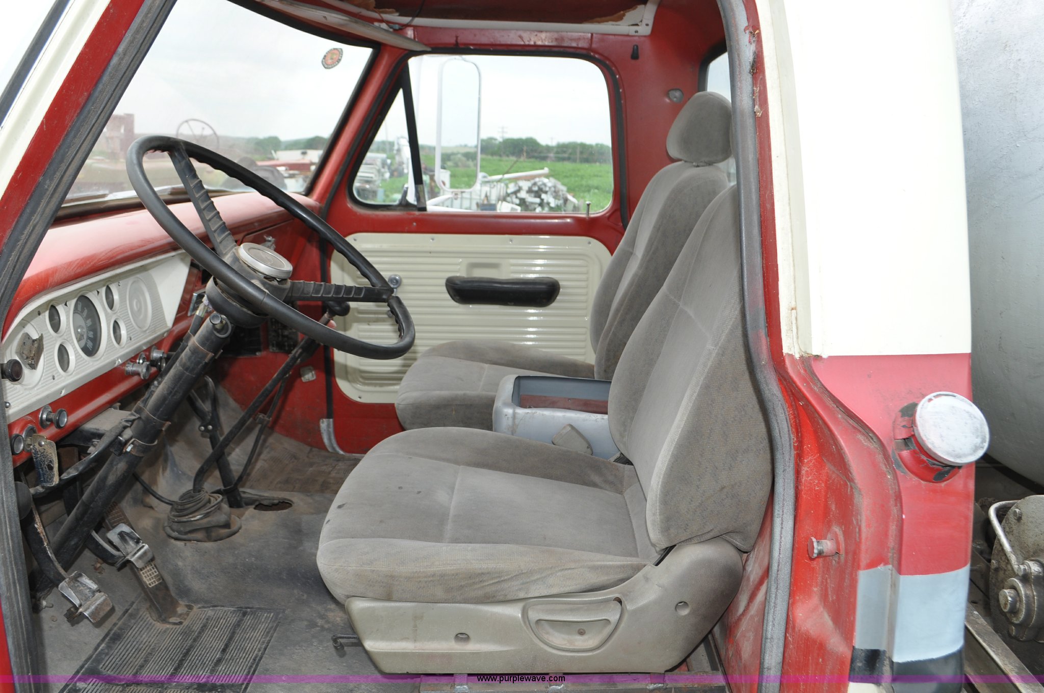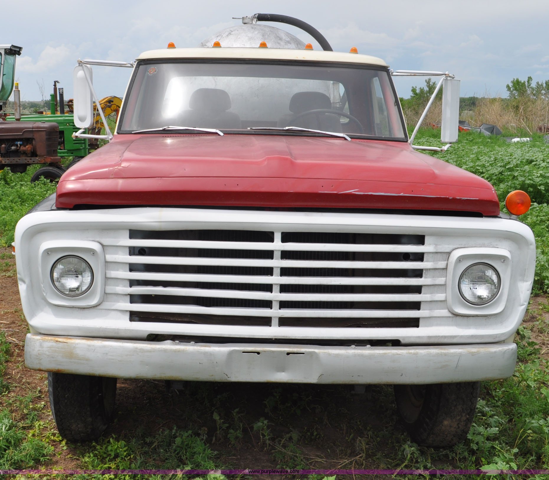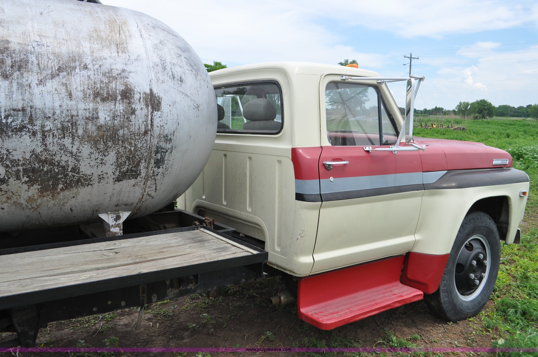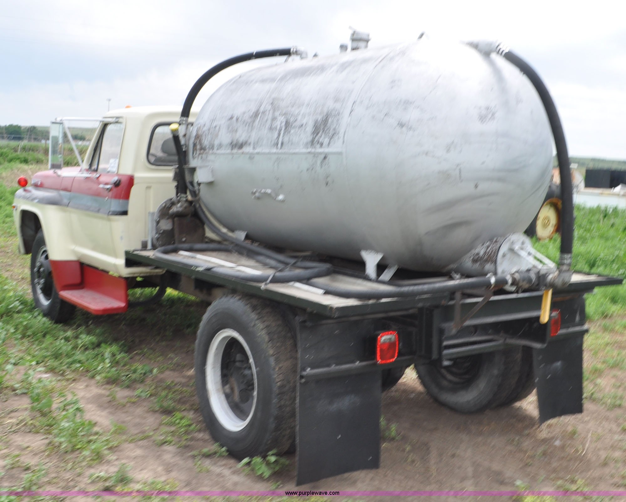 Purple Wave is selling a used Tank Truck or Water Truck in Nebraska. This item is a 1968 Ford F600 tank truck with the following: 66,302 miles on odometer, Ford 330 330 C.I.D. eight cylinder gas engine, Four speed manual transmission, Two speed rear end, Heat, 29" x 103" fender/storage panels, 1,000 gallon used oil tank, Approx. 200 gallon of oil in tank, Clay Equipment Corp. pump, Model MTA210, Pressure/vacuum, PTO driven, Serial 73G644, Spring suspension, Hydraulic brakes, 156" wheelbase, Goodyear 9.00x20 front tires, Goodyear 8.25x20 rear tires, Seat replaced with buckets seats, Interior/exterior cosmetic damage