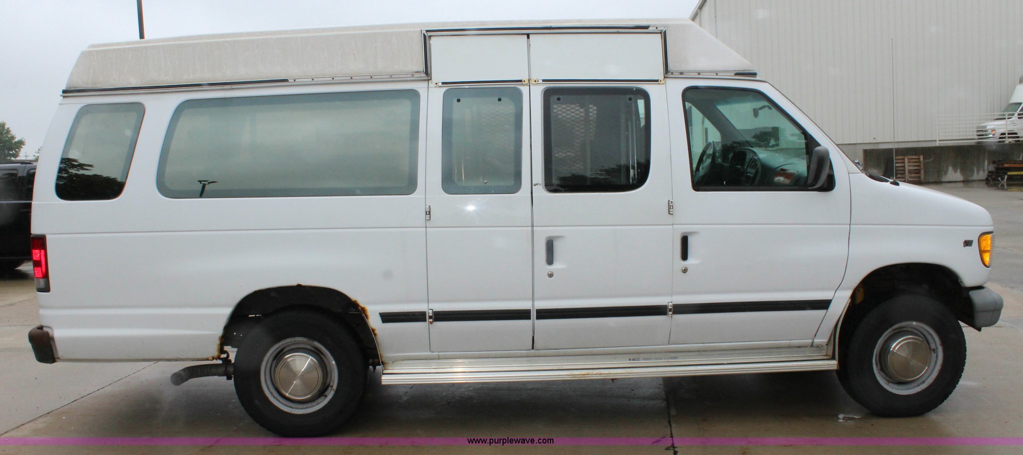 Purple Wave is selling a used Passenger Vehicle in Kansas. This item is a 1997 Ford Club Wagon Super van with the following: 122,511 miles on odometer, 5.4L V8 SOHC 16V gas engine, Automatic transmission, AC and heat, Tilt, Cruise, AM/FM, Power windows, Manual locks, Cloth interior, Wheelchair lift, Needs to be repaired, Running boards, 245/75R16 tires, Interior/exterior cosmetic damage, Rust, Engine burns oil, Unit# JCD3850