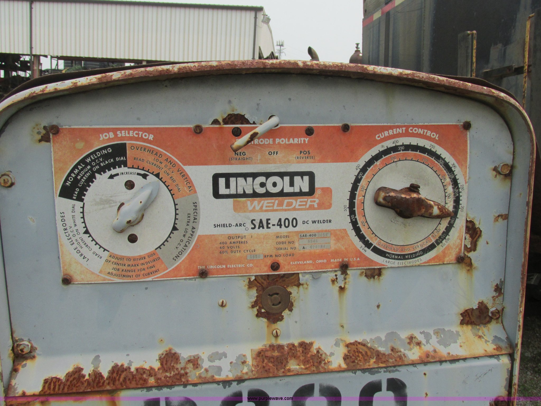 Purple Wave is selling a used Welder (Manual) in Missouri. This item is a Lincoln SAE400-2056 DC welder with the following: Detroit Diesel engine, 400 amps, 40V, Negative or positive polarity, Serial 628184