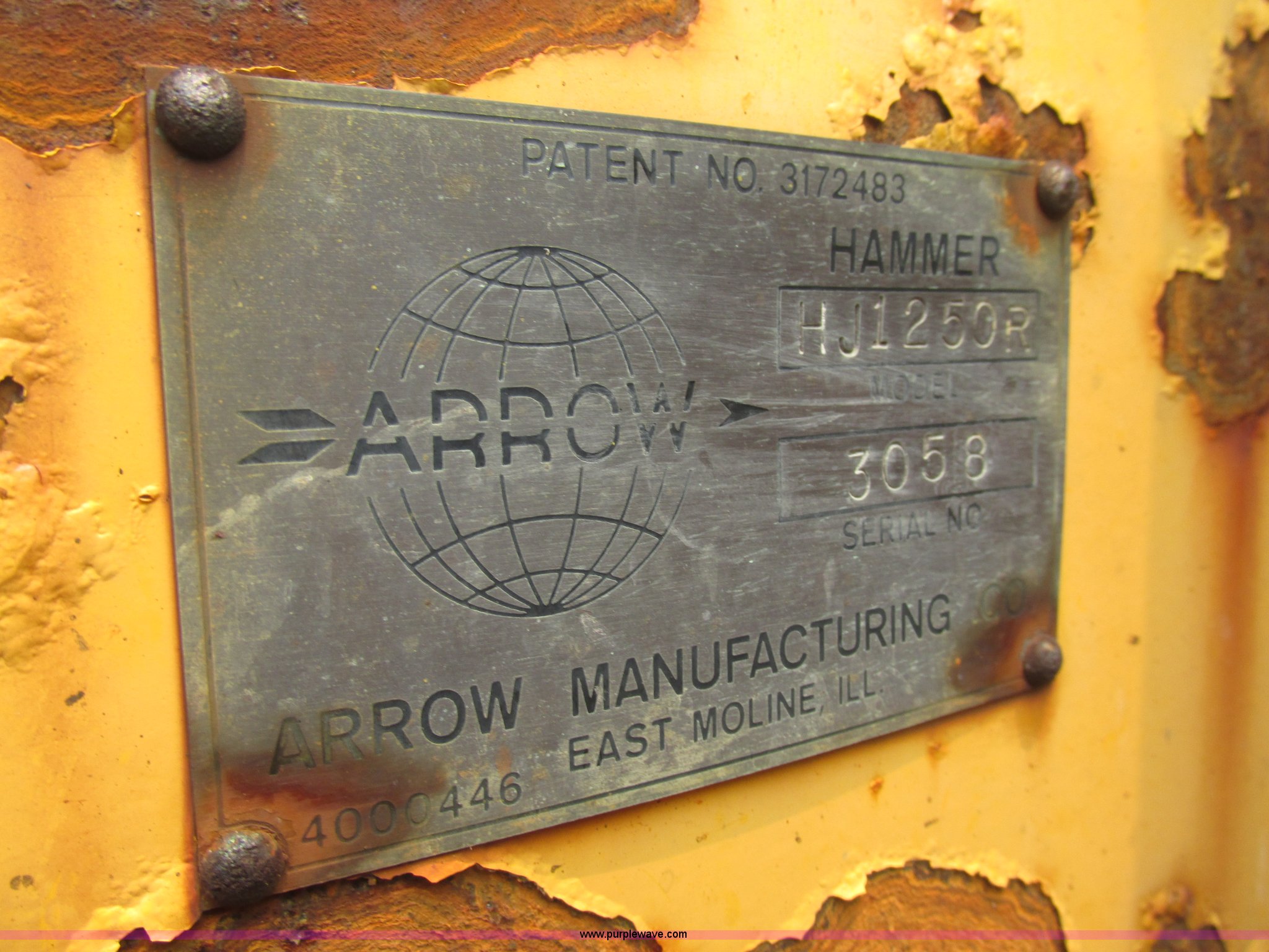 Purple Wave is selling a used Breaker or Hammer in Missouri. This item is a Arrow HJ1250K pavement breaker with the following: 311 hours on meter, John Deer four cylinder diesel engine, Casting R72922, Four speed transmission, Creeper drive, Chisel hammer tip, Boom, Auto stroke, Lay back, Side shift, 12-16.5 front tires, 8.75R16 LT rear tires, Serial 3058