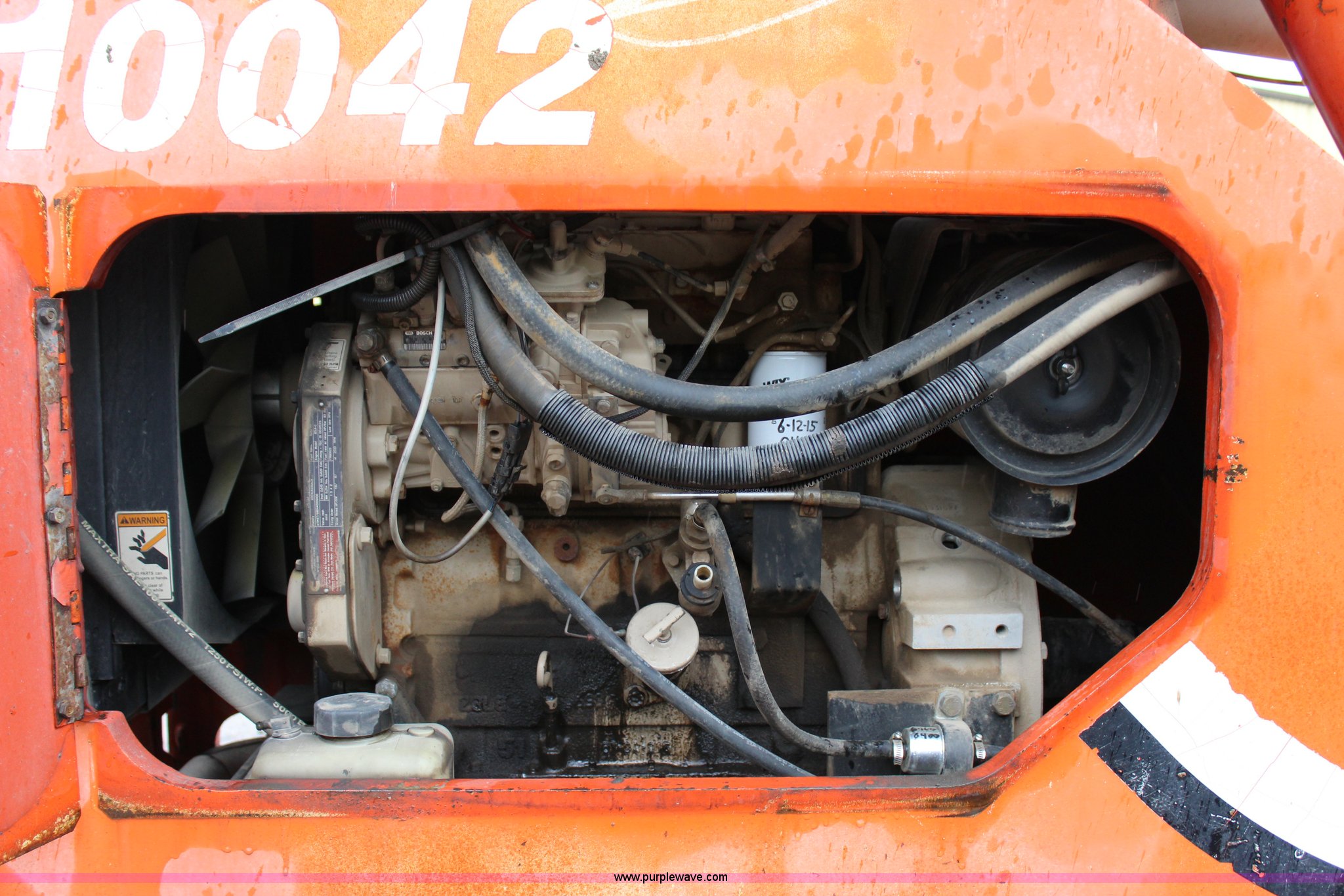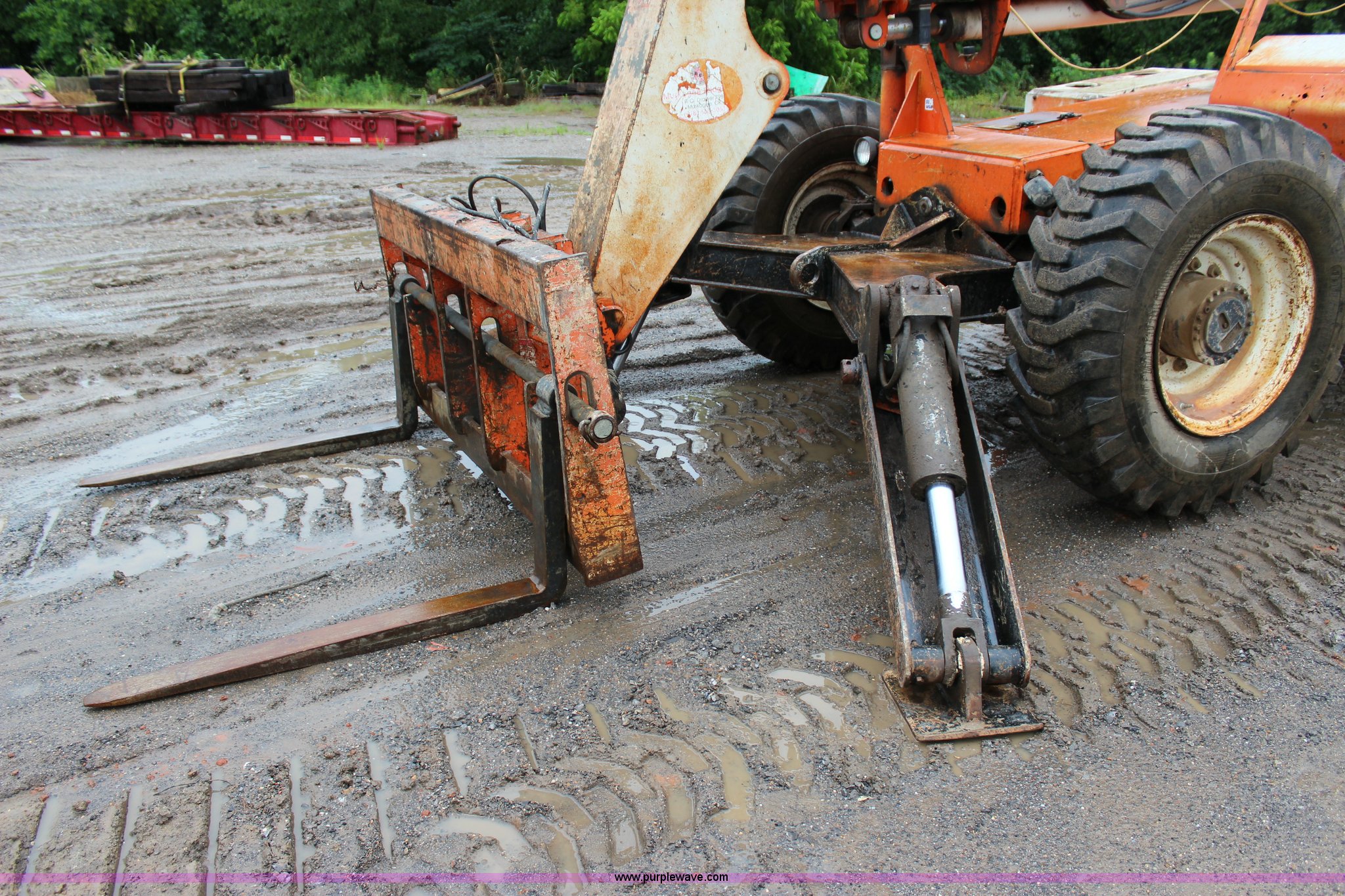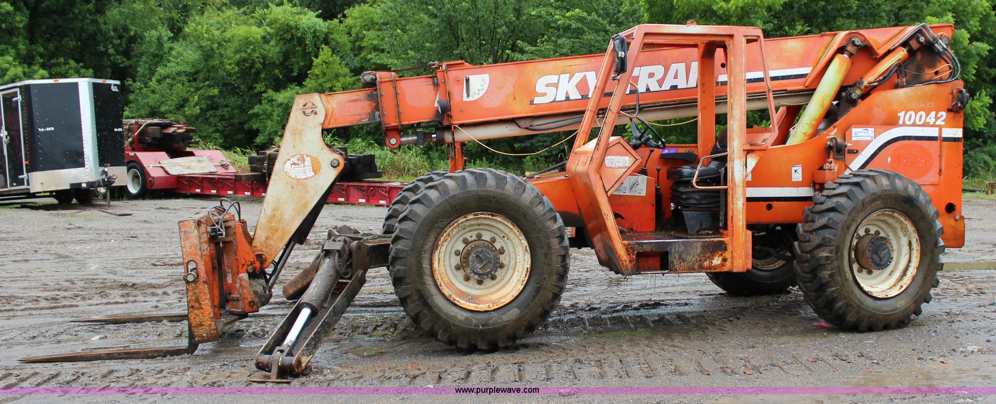 Purple Wave is selling a used Telehandler in Oklahoma. This item is a 1997 Sky Trak 10042 telehandler with the following: 406 hours on meter, Cummins B3.9C four cylinder diesel engine, 116 HP, Serial 45855250, Powershift transmission, 4F-3R gears, Four wheel drive, Locking differential, Crab steering, Four wheel steering, 10,000 lbs maximum lift capacity, 26'7" maximum reach, 42' maximum lift height, Side shift, Hydraulic outriggers, Hydraulic leveling, 48"L forks, 17.5-25 L2 tires, 26,883 lbs. base operating weight, Serial P9989C4697, Unit# 80-21