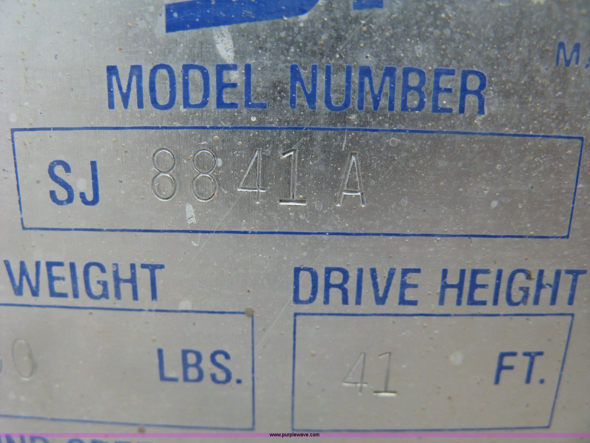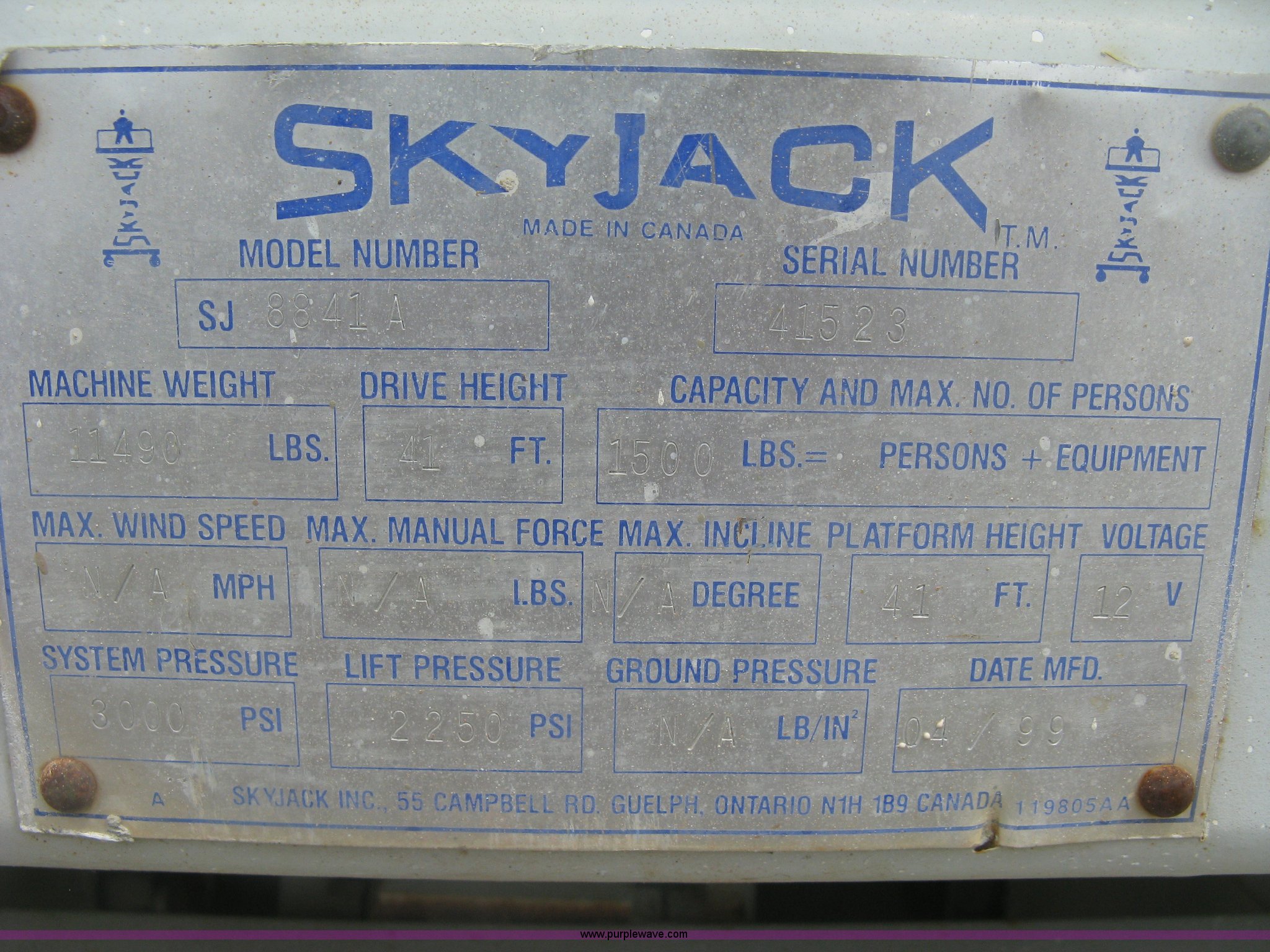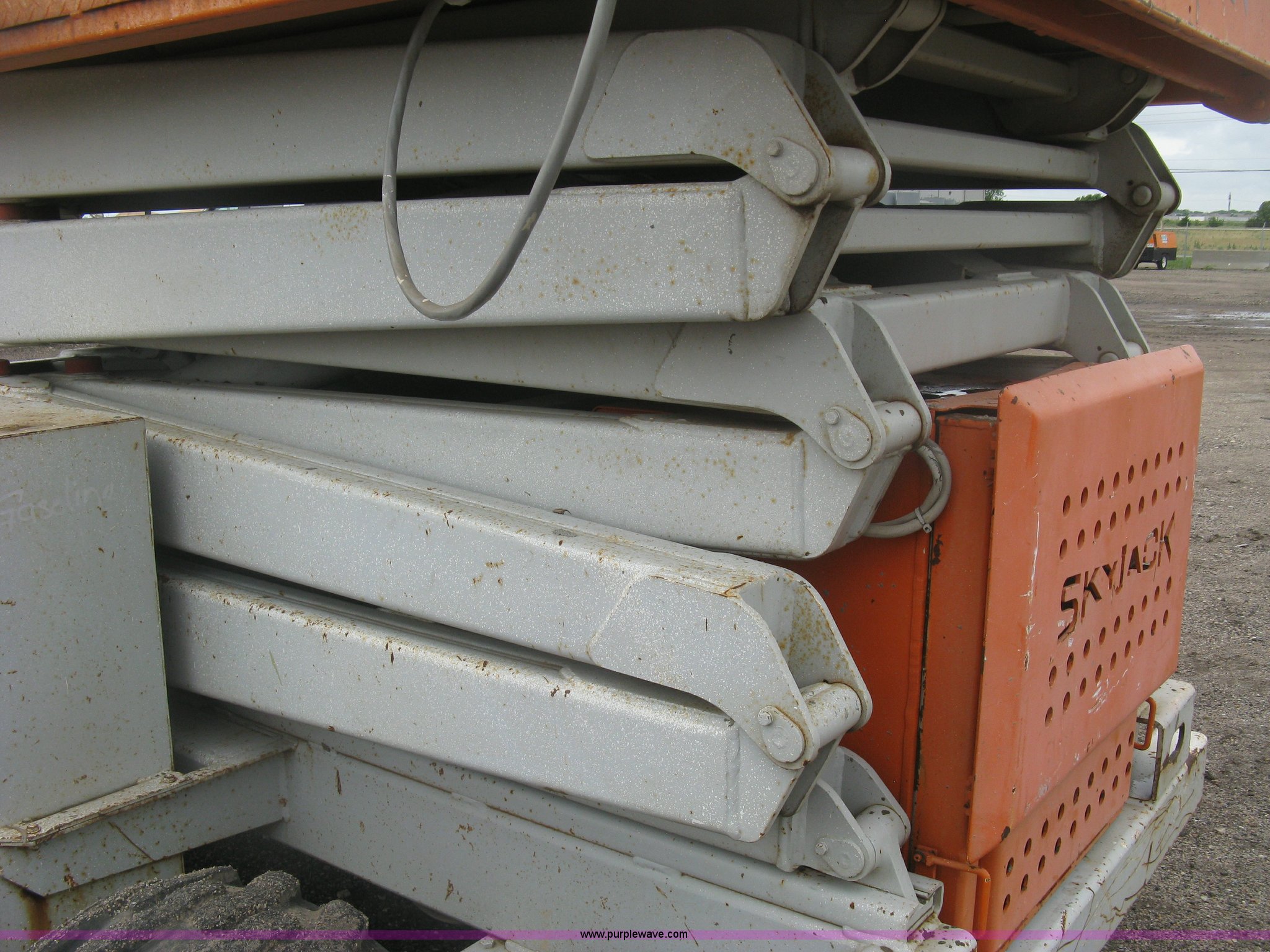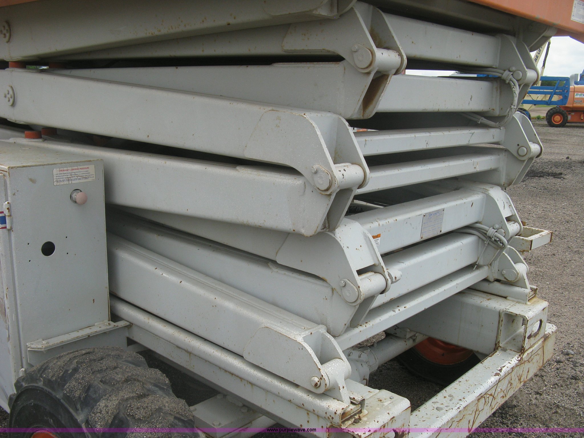 Purple Wave is selling a used Scissor or Vertical Lift in Kansas. This item is a 1999 Sky Jack SJ8841A scissor lift with the following: 4,734 hours on meter, Ford four cylinder dual fuel engine, Gas and propane capable, 41' maximum platform height, 1,500 lbs maximum lift capacity, 11.5' x 5.5'W platform, Slide-out extension, 10-16.5 NHS tires, 11,490 lbs. base operating weight, Annual Inspection completed on March 24, 2015, Manuals, Serial 41523