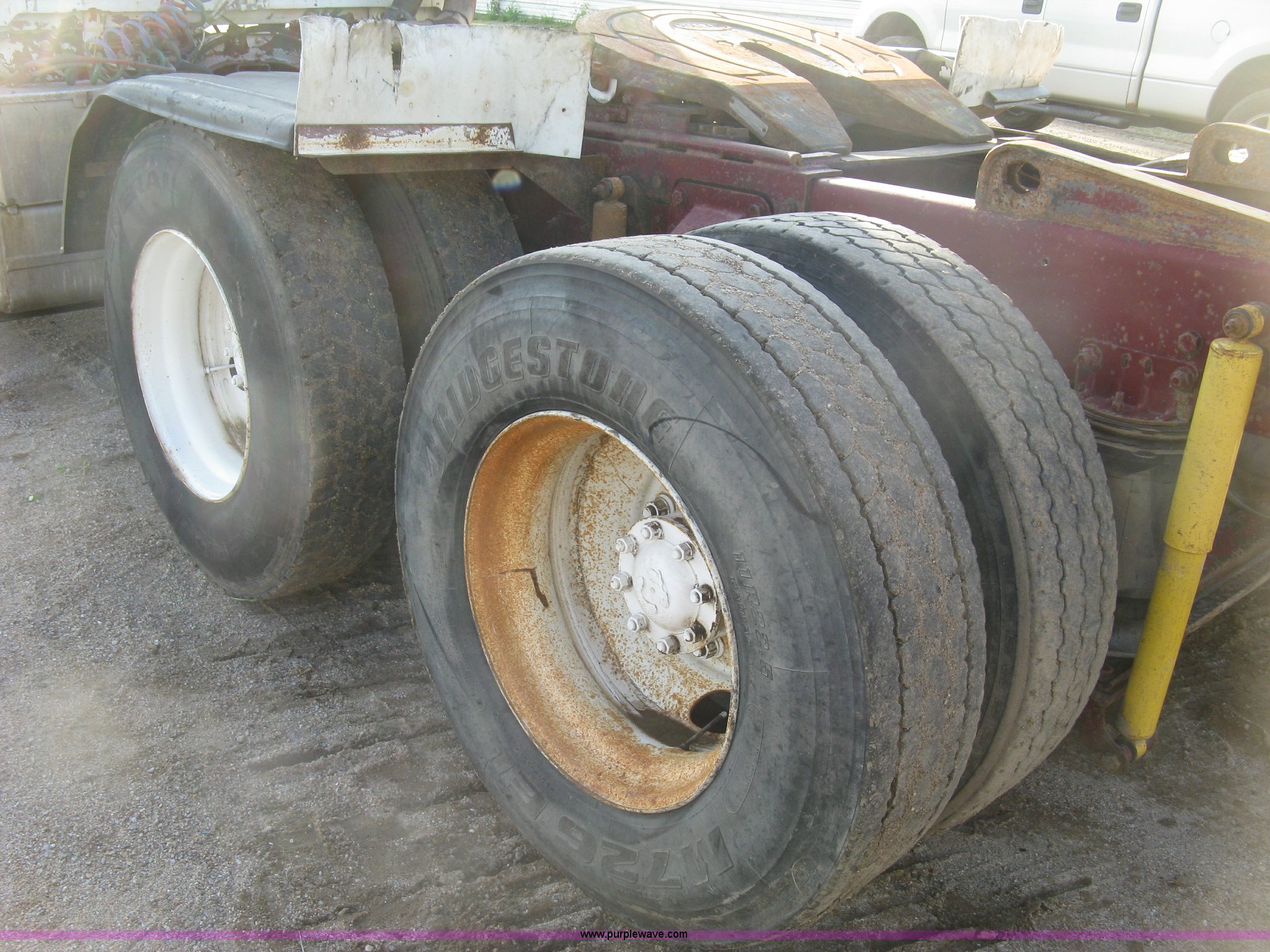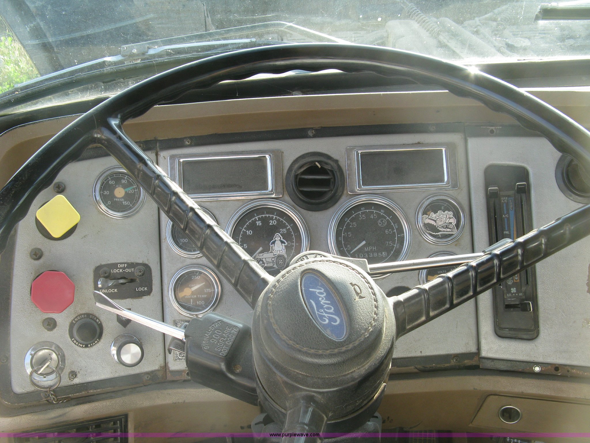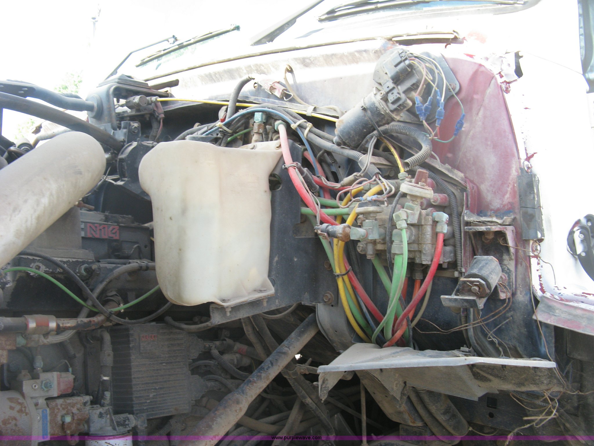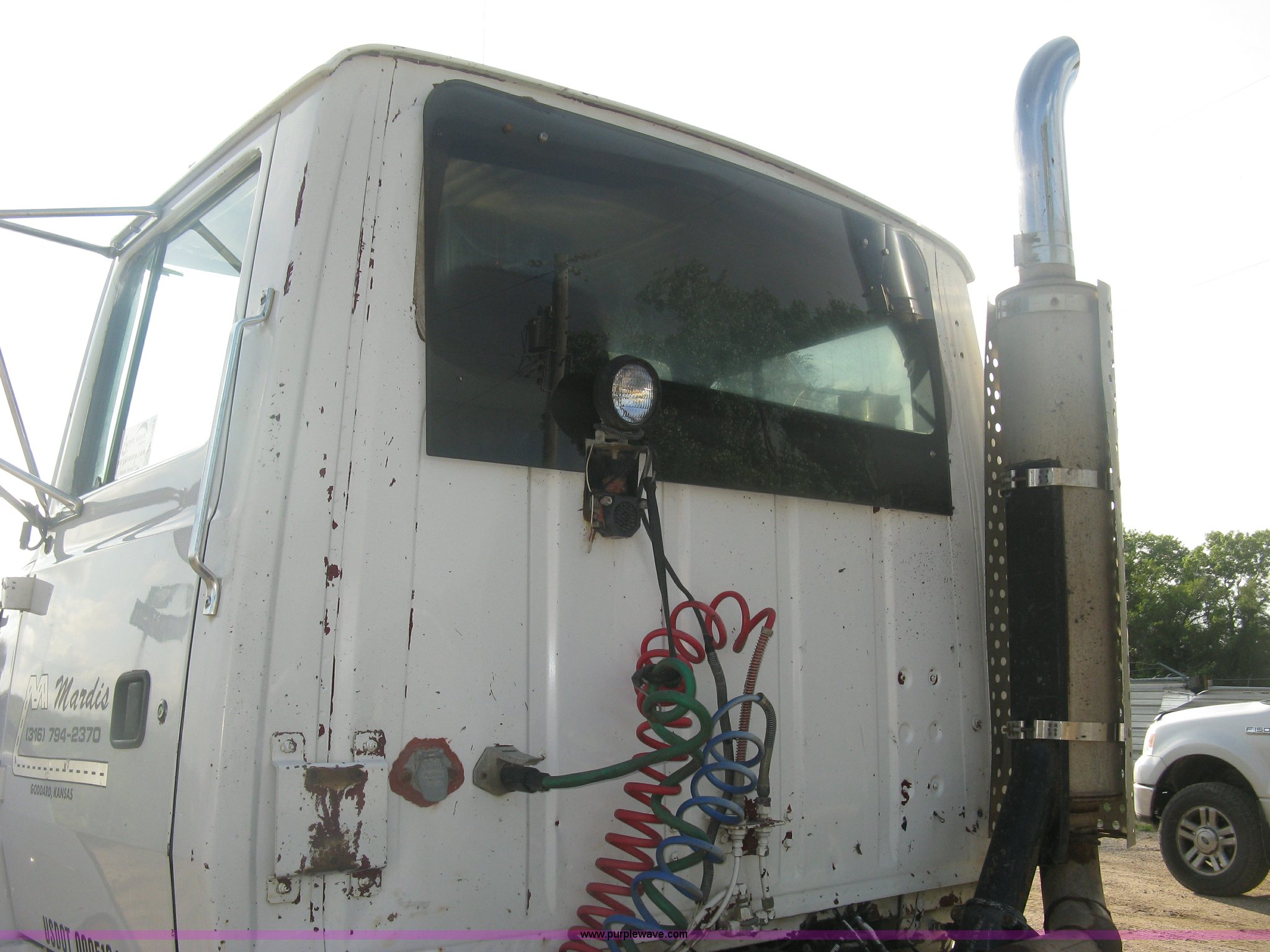 Purple Wave is selling a used Truck Tractor in Kansas. This item is a 1996 Ford LTA9000 Aero Max 106 semi truck with the following: 1,103,395 miles on odometer, Cummins N14 14.0L L6 turbo diesel engine, Eaton Fuller Road Ranger nine speed manual transmission, Tandem axles, Inter-axle differential lock, AC and heat, AM/FM/cassette, Cruise control, Heated driver's seat, Wire cut, Air ride cab, Front tow hooks, Dual fuel tanks, Aluminum deck plate, Sliding air operated fifth wheel plate, Half fenders, Single exhaust stack, Air suspension, Air brakes, 143" wheelbase, 11R22.5 tires, GVWR 52,000 lbs, FAWR 12,000 lbs, IAWR 20,000 lbs, RAWR 20,000 lbs, Annual inspection completed in July 2014, Exterior body damage, Rear of cab damaged, Rear window removed and covered with plexi-glass