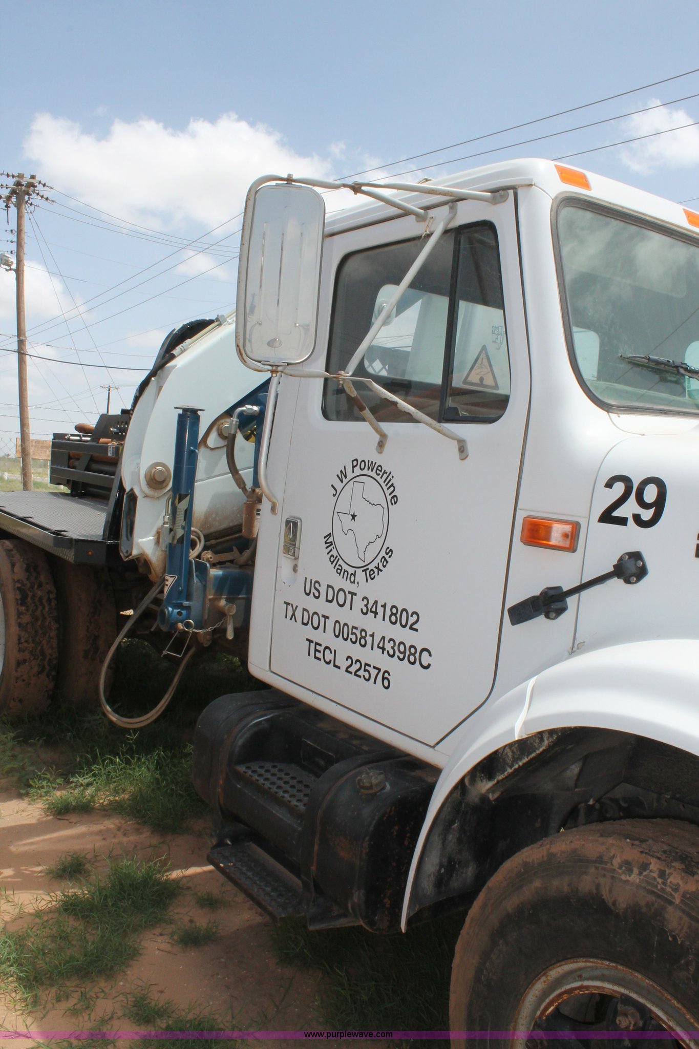 1994 International 4900 crane truck. 35,375 miles on odometer, 8,219 hours on meter, International DT466 7.6L L6 turbo diesel engine, Eight speed manual transmission, AC and heat, 12'L x 8'W utility bed Gormagh knuckle boom, Serial 8700E2, Spring suspension, Hydraulic brakes, 170" wheelbase, 11R22.5 tires, GVWR 33,000 lbs, FAWR 12,000 lbs, RAWR 31,000 lbs, Unit# 29. Title distribution may be delayed up to 14 days from verification of funds. 1HTSDAAP2RH583848. JW Powerline. 700 S. Fairgrounds Road. Midland, TX 79701