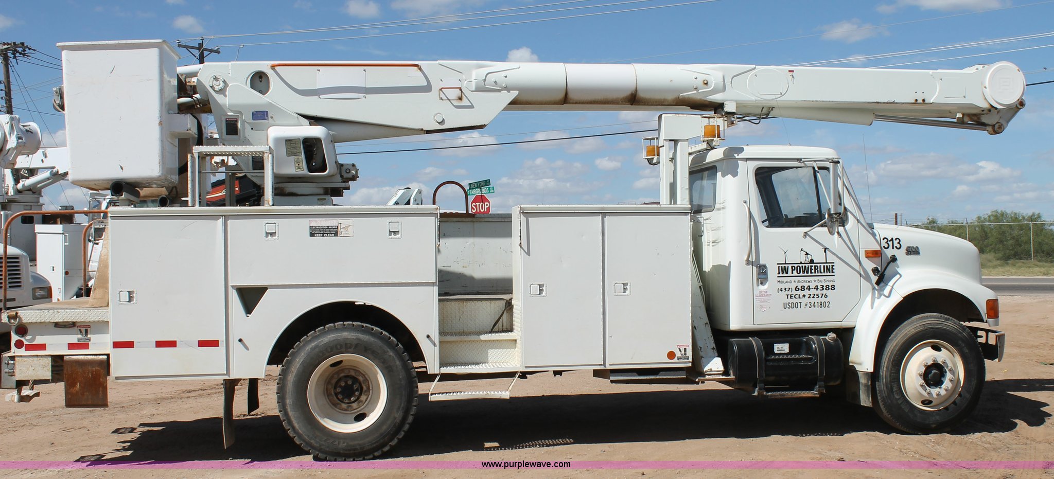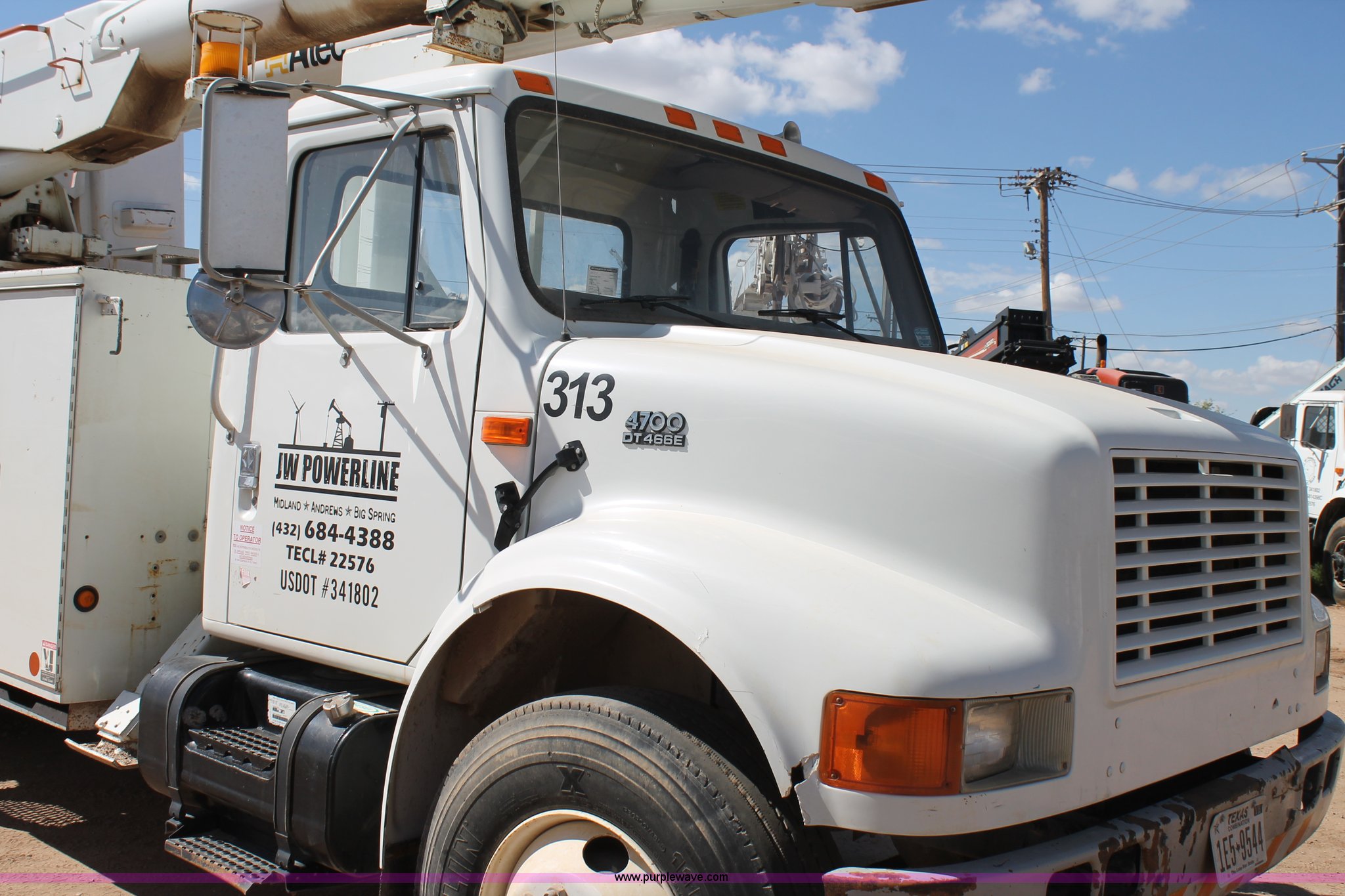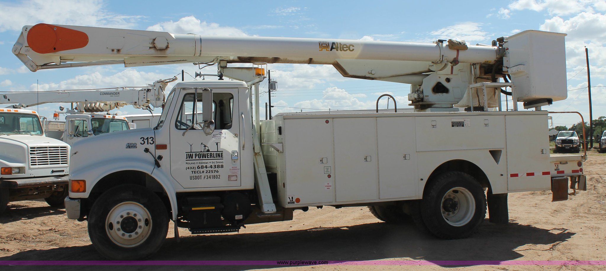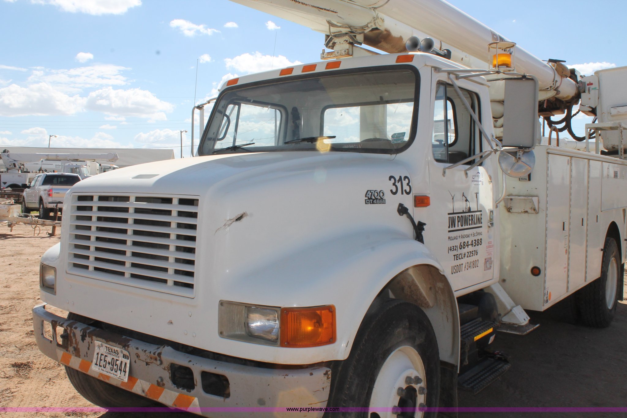 Purple Wave is selling a used Bucket Truck in Texas. This item is a 2001 International 4700 bucket truck with the following: 89,658 miles on odometer, International DT466E 7.6L L6 turbo diesel engine, Automatic transmission, AC and heat, AM/FM/cassette, Suspension seat, Service bed, Shelving, Slide-out drawers, Utility rack, Compartment lights, Enclosed body, Altec AM855 boom, 55'L boom, (4) outriggers, 350 lbs per ft. max lift capacity, Double man basket, 55' max lift height, Ground and platform controls, Material handler, Pole guide, Remote control, Articulating insulated boom, Serial 0600BB2097,, Pintle hitch, Trailer wiring, PTO, Spring suspension, Air brakes, 188" wheelbase, 11R22.5 tires, GVWR 33,000 lbs, Unit# 313