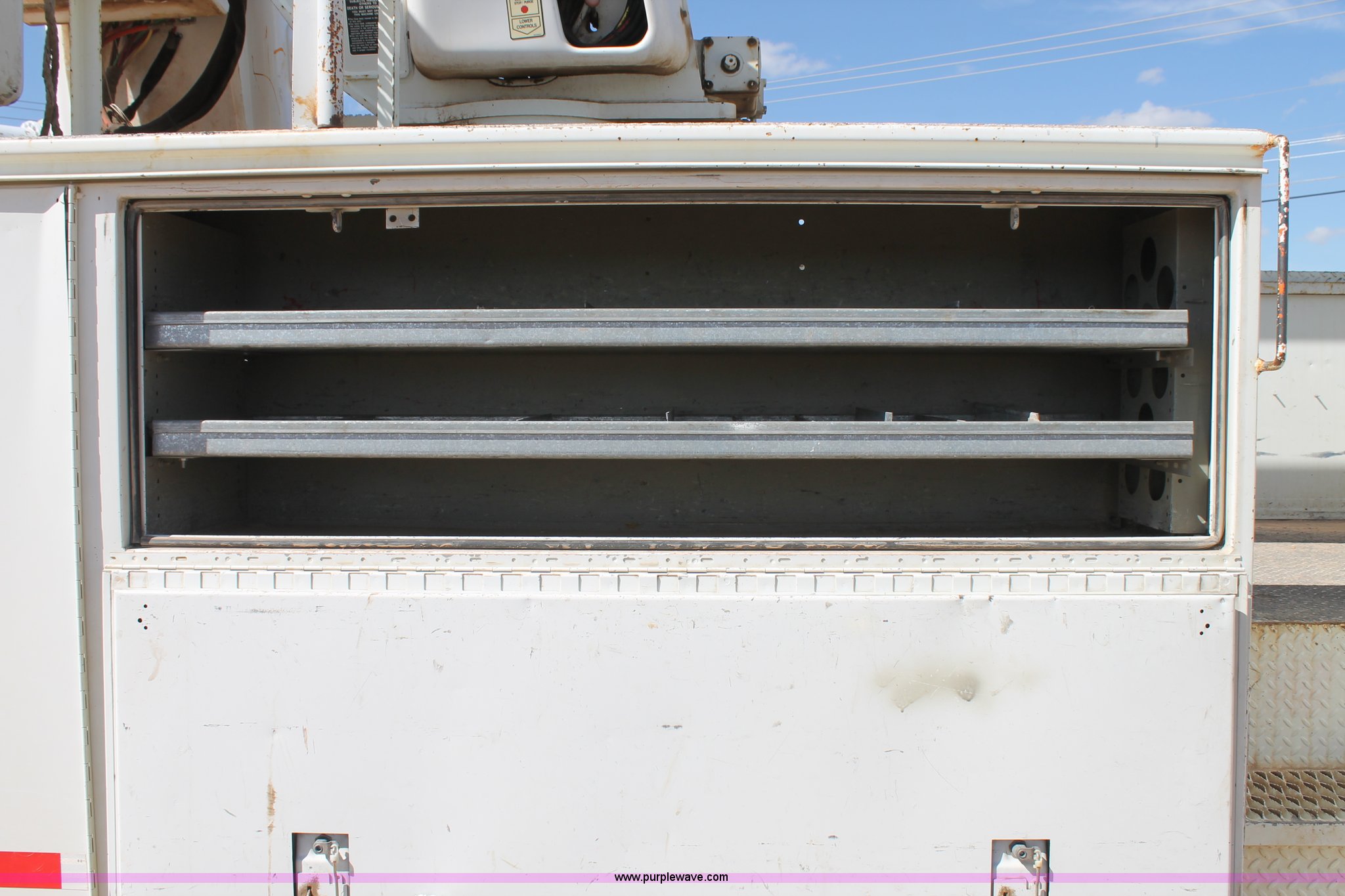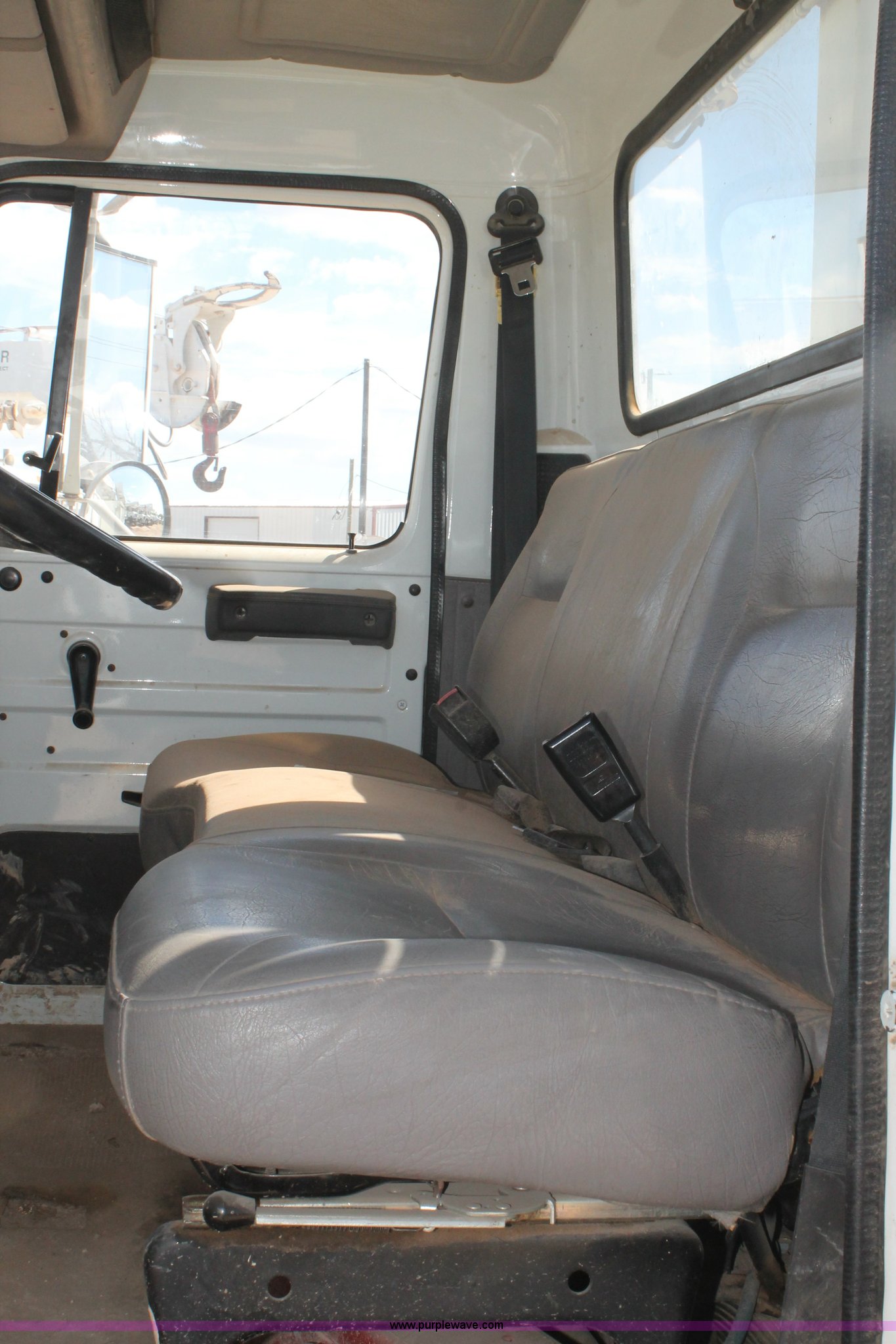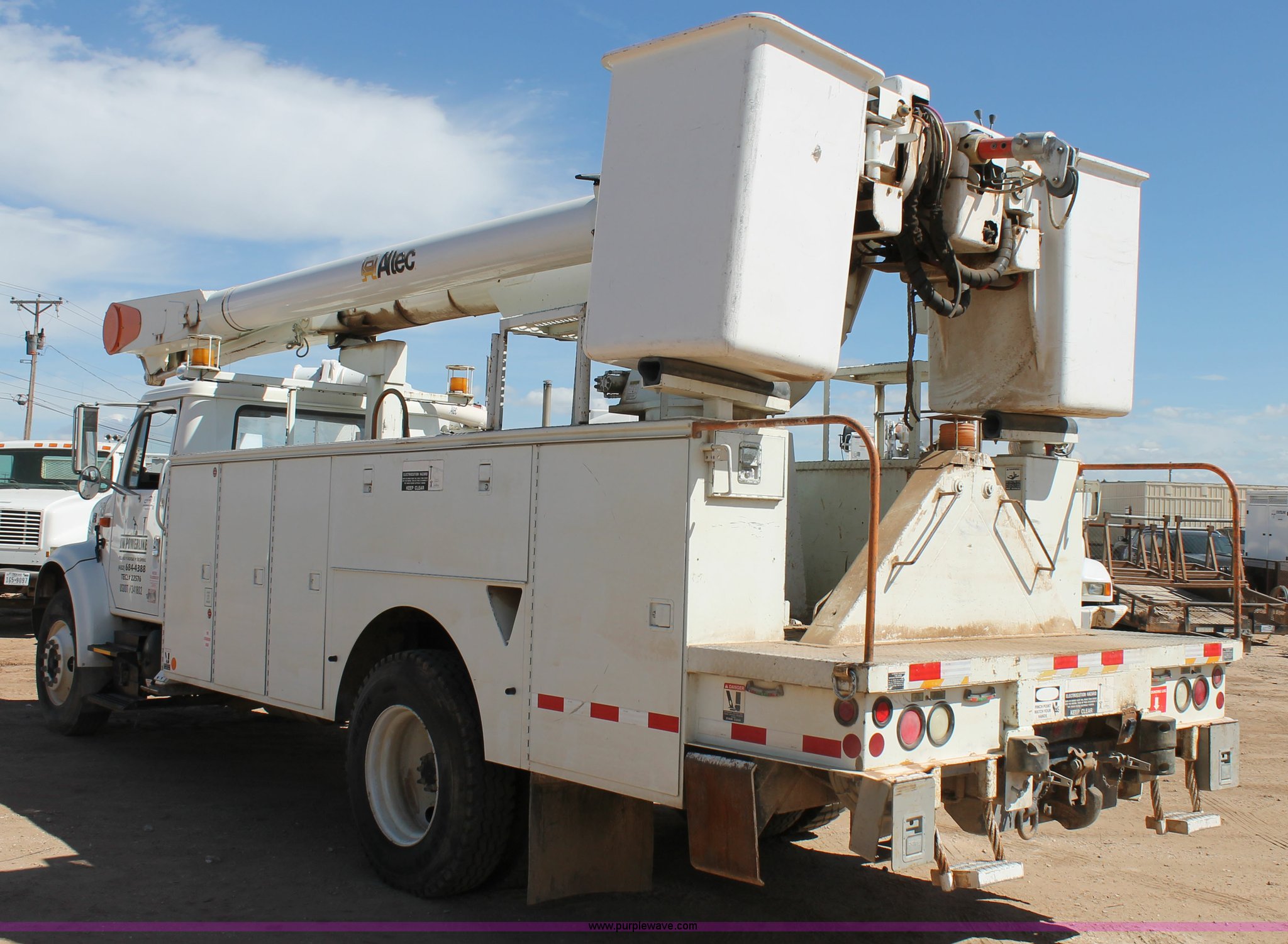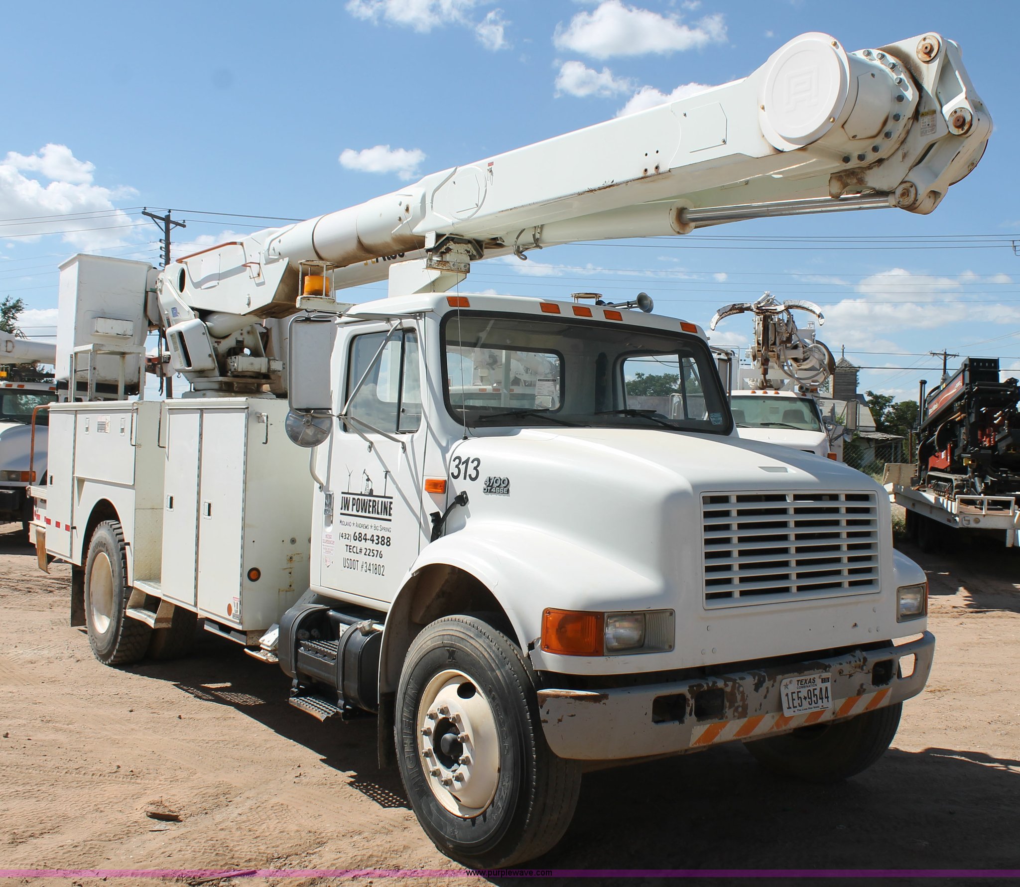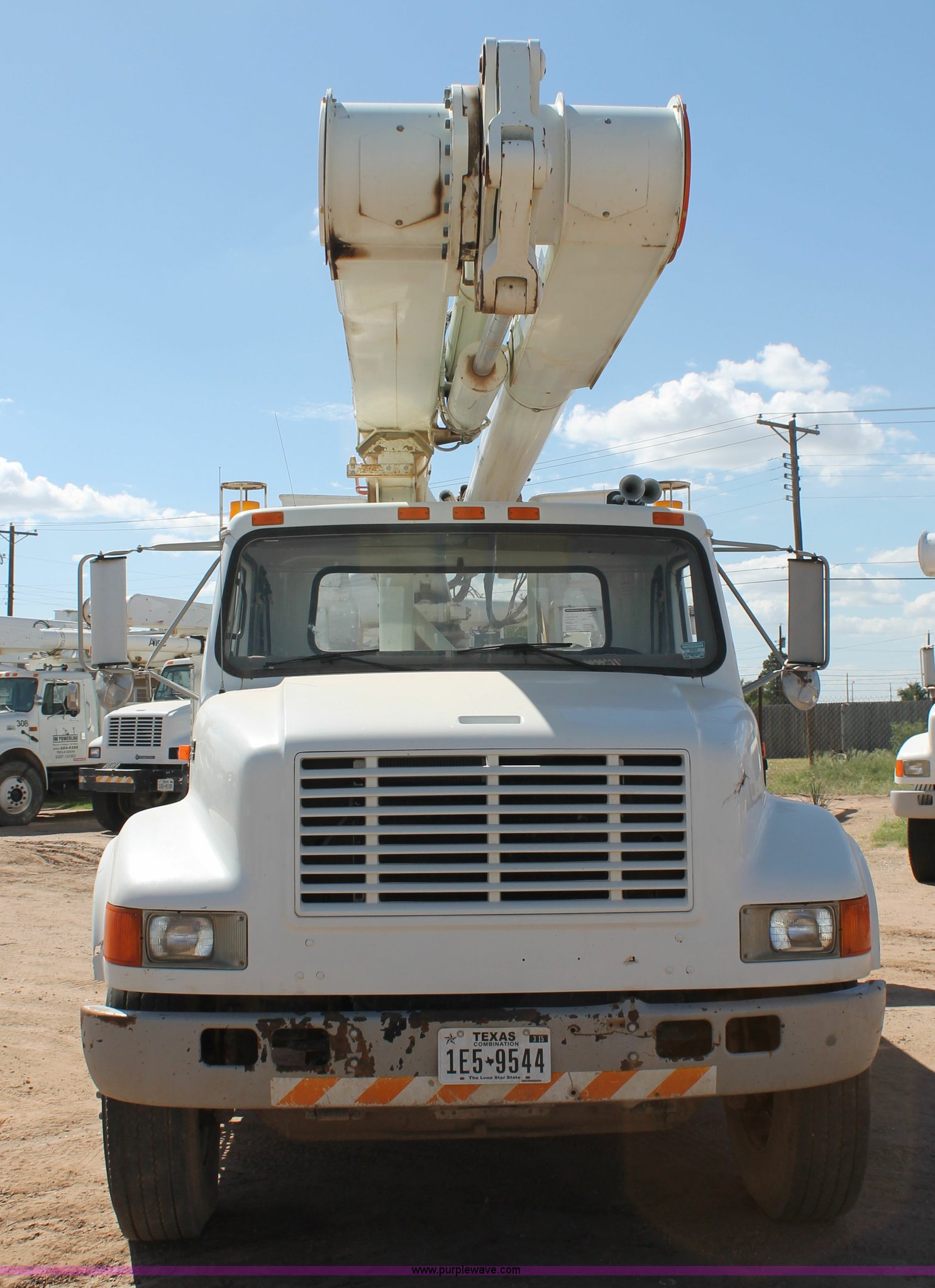 Purple Wave is selling a used Bucket Truck in Texas. This item is a 2001 International 4700 bucket truck with the following: 89,658 miles on odometer, International DT466E 7.6L L6 turbo diesel engine, Automatic transmission, AC and heat, AM/FM/cassette, Suspension seat, Service bed, Shelving, Slide-out drawers, Utility rack, Compartment lights, Enclosed body, Altec AM855 boom, 55'L boom, (4) outriggers, 350 lbs per ft. max lift capacity, Double man basket, 55' max lift height, Ground and platform controls, Material handler, Pole guide, Remote control, Articulating insulated boom, Serial 0600BB2097,, Pintle hitch, Trailer wiring, PTO, Spring suspension, Air brakes, 188" wheelbase, 11R22.5 tires, GVWR 33,000 lbs, Unit# 313