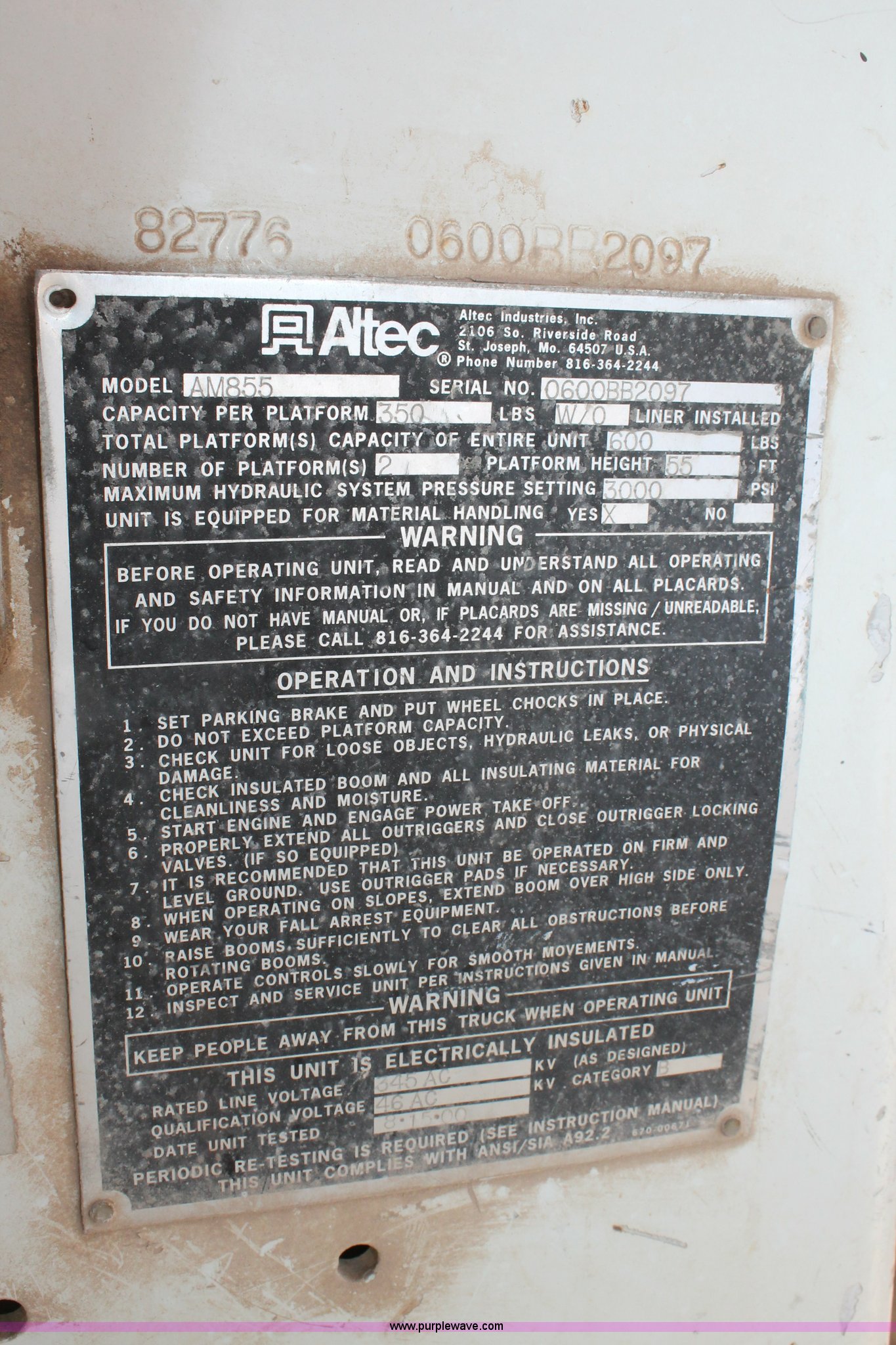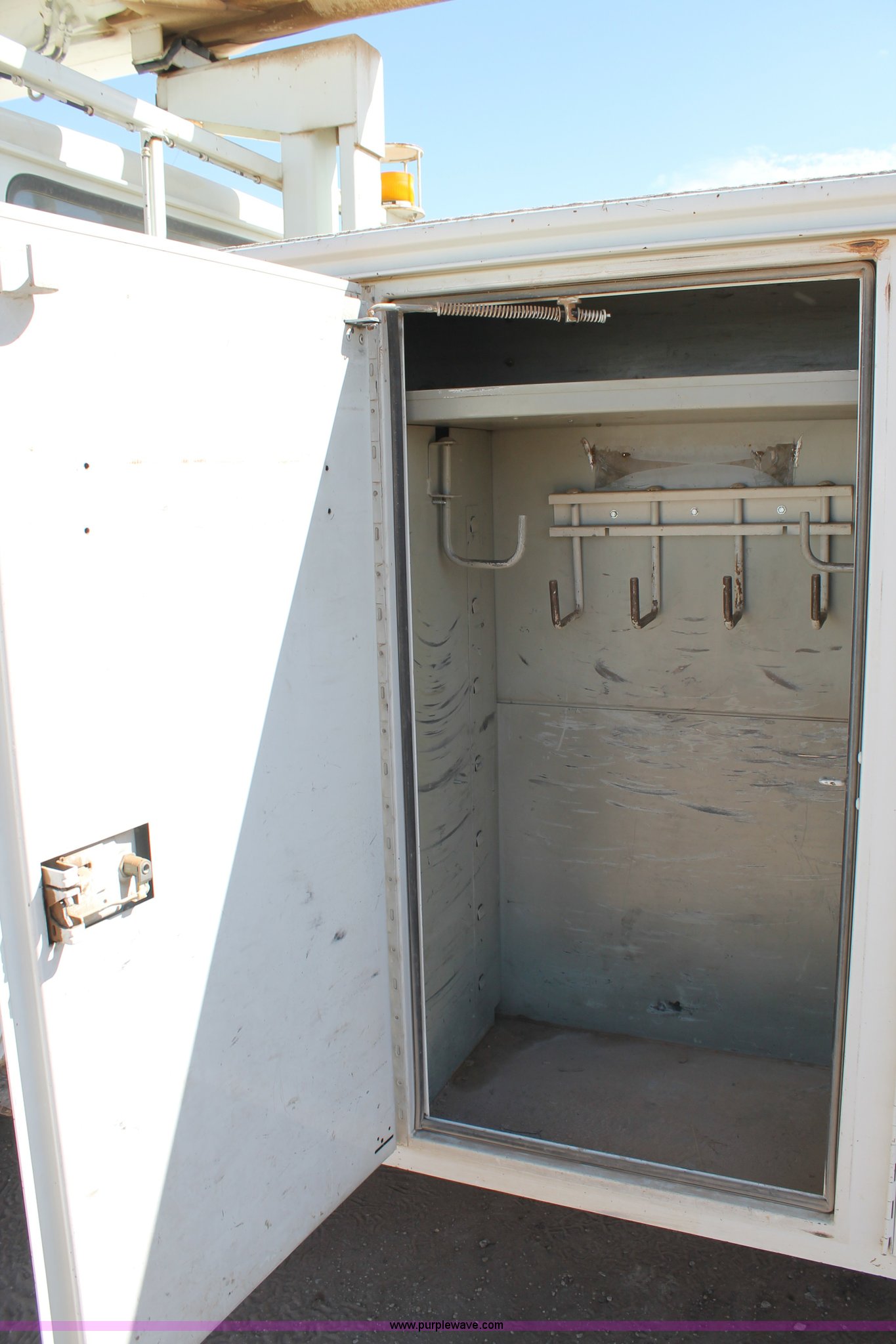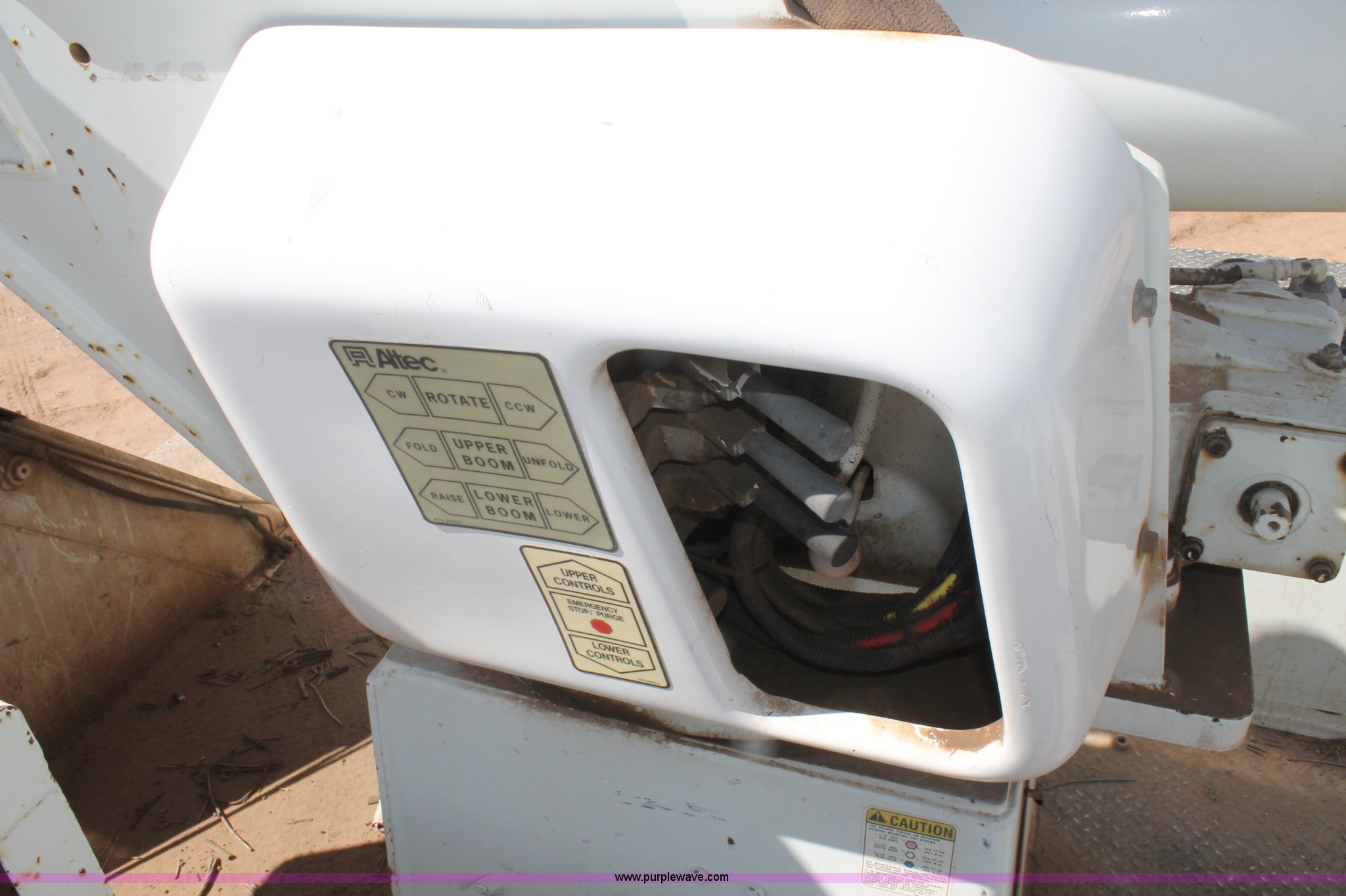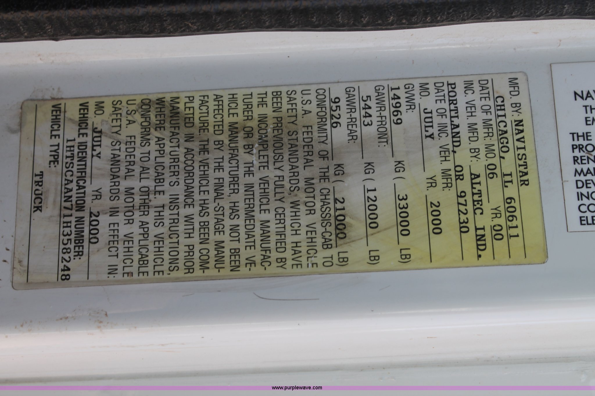 Purple Wave is selling a used Bucket Truck in Texas. This item is a 2001 International 4700 bucket truck with the following: 89,658 miles on odometer, International DT466E 7.6L L6 turbo diesel engine, Automatic transmission, AC and heat, AM/FM/cassette, Suspension seat, Service bed, Shelving, Slide-out drawers, Utility rack, Compartment lights, Enclosed body, Altec AM855 boom, 55'L boom, (4) outriggers, 350 lbs per ft. max lift capacity, Double man basket, 55' max lift height, Ground and platform controls, Material handler, Pole guide, Remote control, Articulating insulated boom, Serial 0600BB2097,, Pintle hitch, Trailer wiring, PTO, Spring suspension, Air brakes, 188" wheelbase, 11R22.5 tires, GVWR 33,000 lbs, Unit# 313