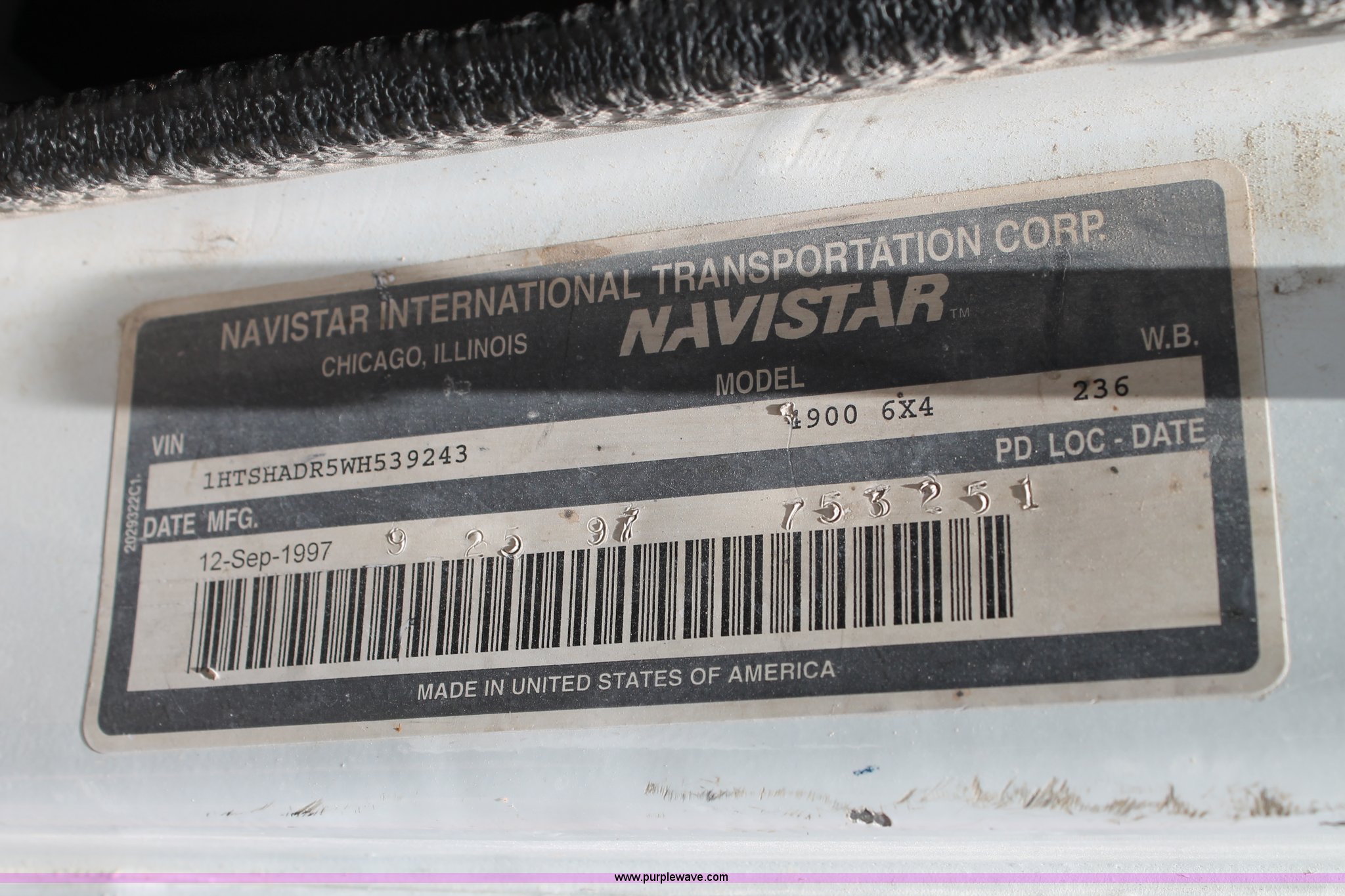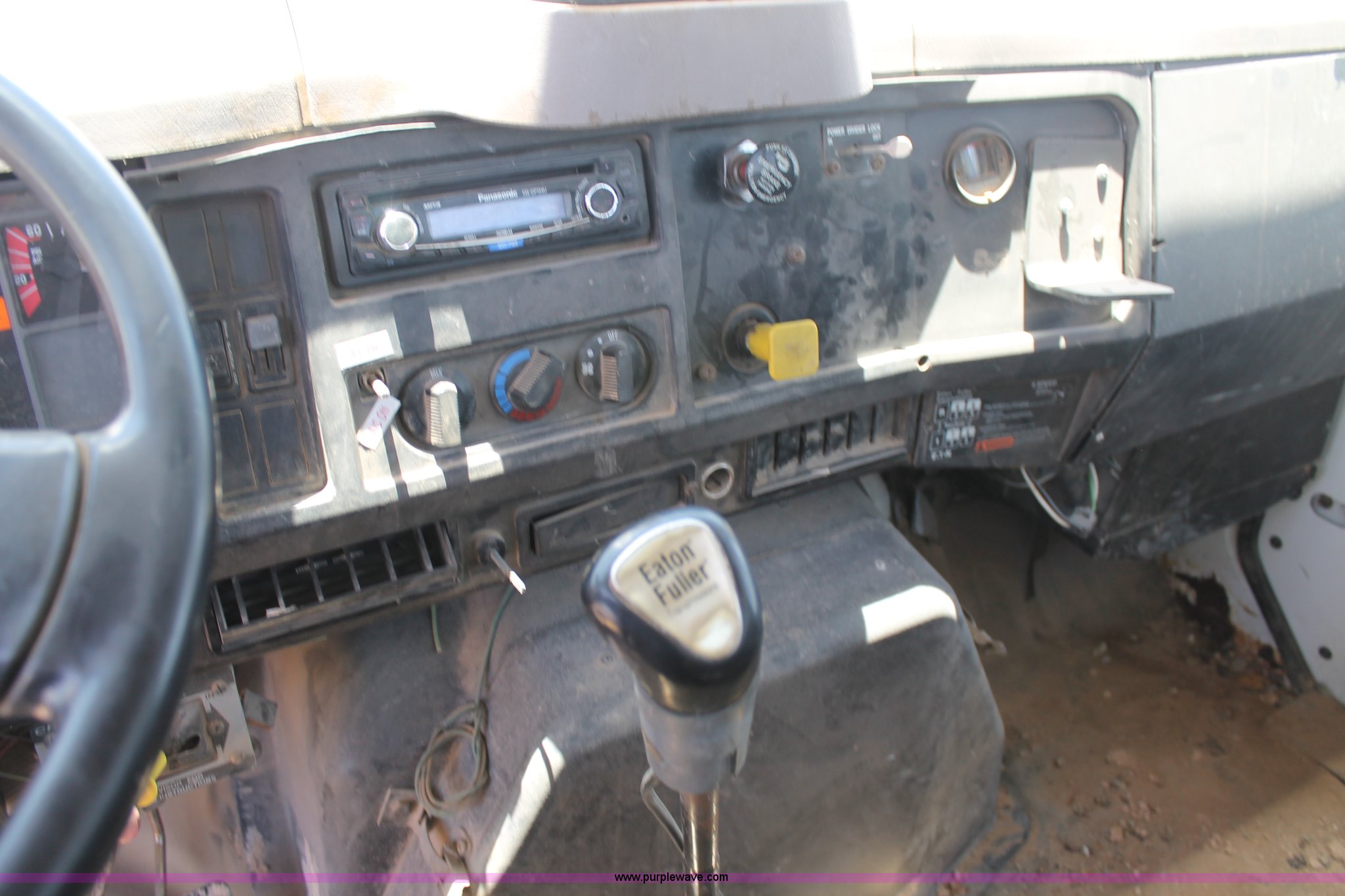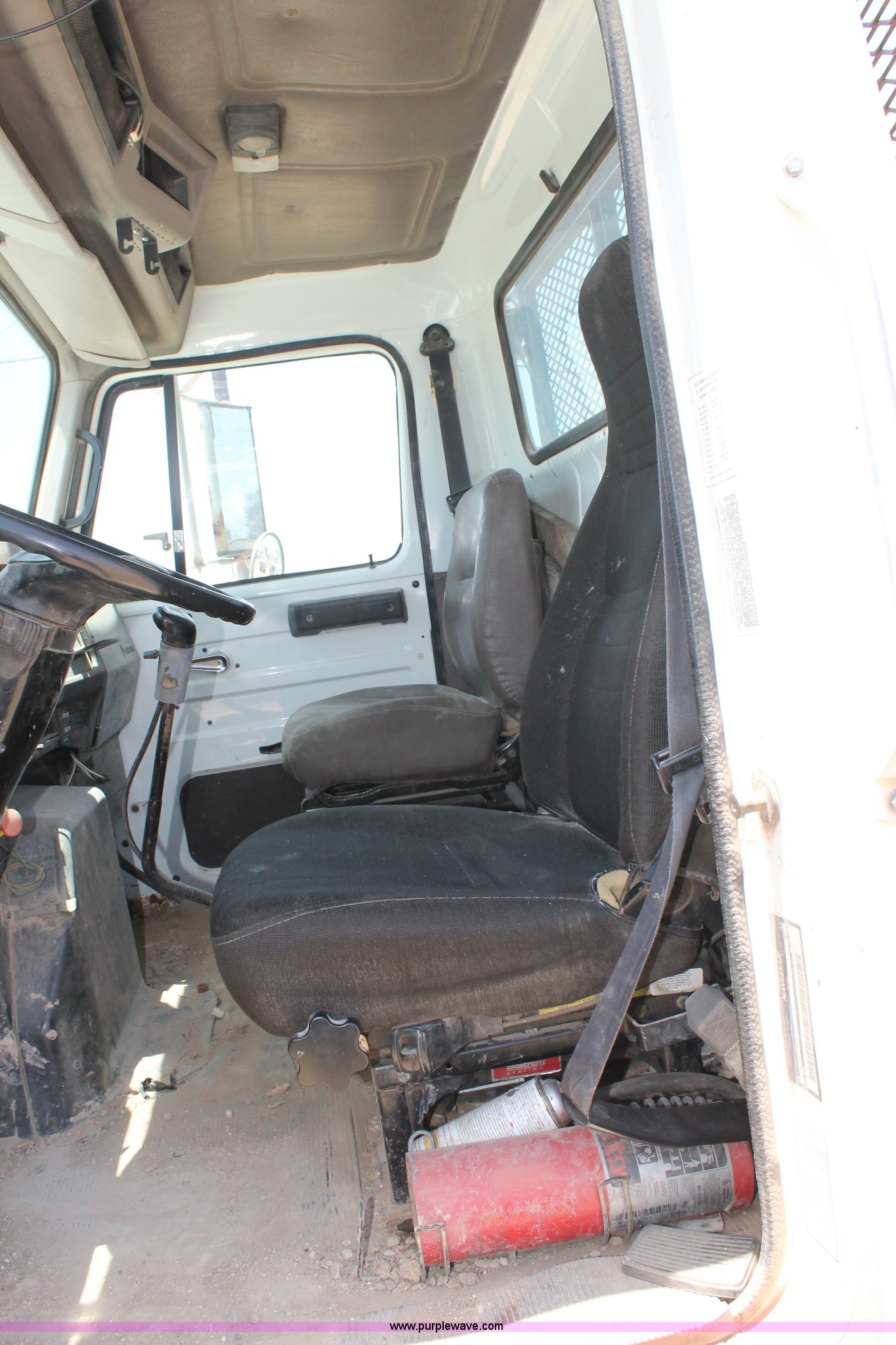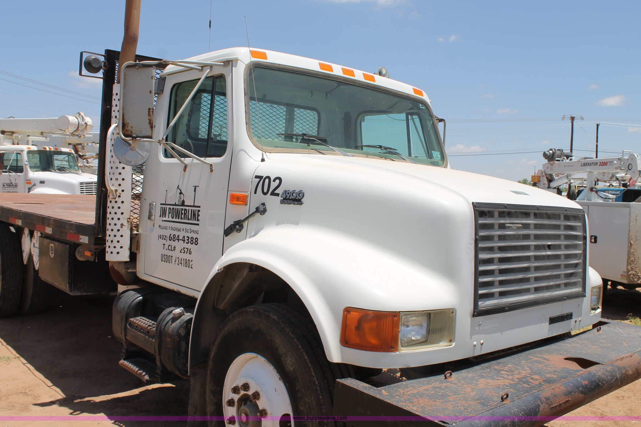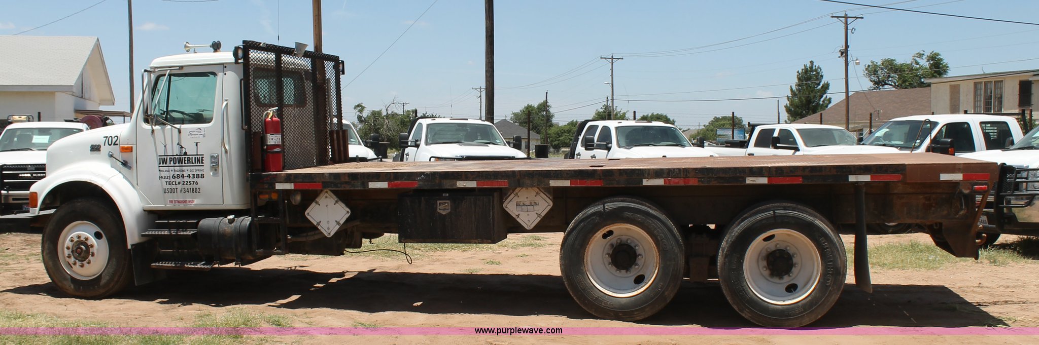 Purple Wave is selling a used Flat Bed Truck in Texas. This item is a 1998 International 4900 flatbed truck with the following: 44,823 miles on odometer, International DT530 Power 8.7L L6 diesel engine, Eaton Fuller nine speed manual transmission, AC and heat, AM/FM/CD, Suspension seat, 22'L flatbed, 4' headache rack, Single exhaust stack, Dual fuel tanks, Pintle hitch, Trailer wiring, Spring suspension, Air brakes, 236" wheelbase, 11R22.5 tires, Unit# 702