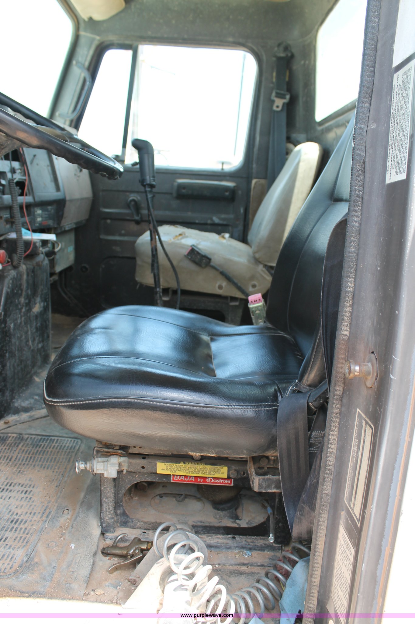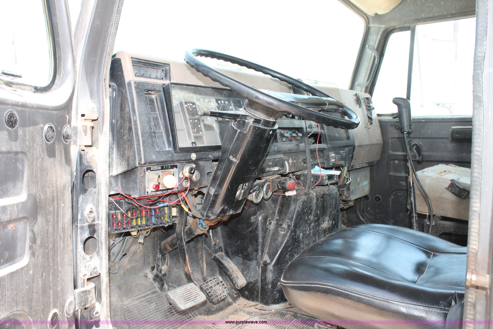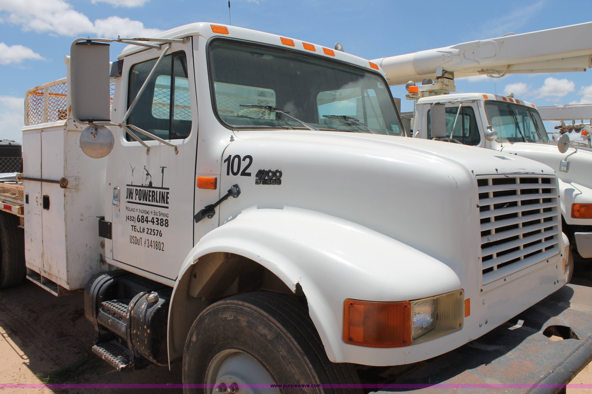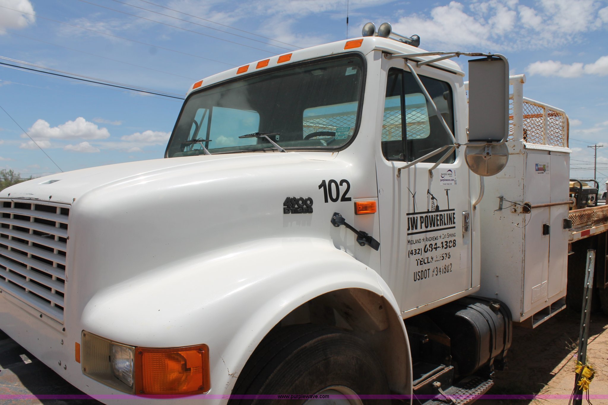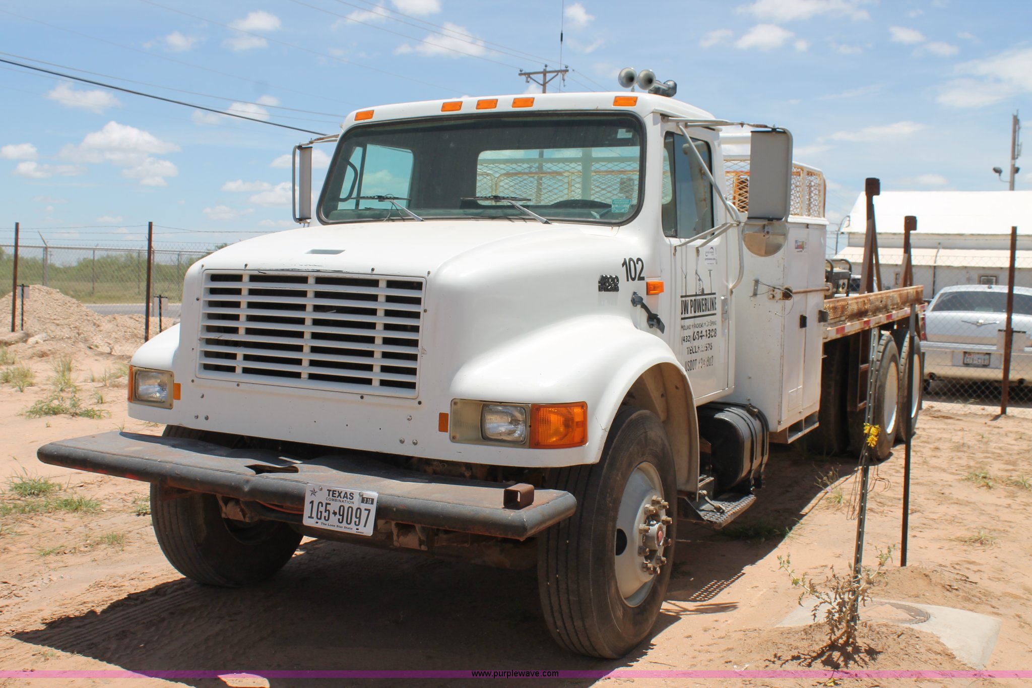 Purple Wave is selling a used Flat Bed Truck in Texas. This item is a 1994 International 4900 flatbed truck with the following: Unknown miles on odometer, International DT466 six cylinder diesel engine, Nine speed manual transmission, AC and heat, 18' service bed, Shelving, Slide-out drawers, Utility rack, Dual fuel tanks, Pintle hitch, Trailer wiring, Spring suspension, Air brakes, 236" wheelbase, 11R22.5 tires, Unit# 102