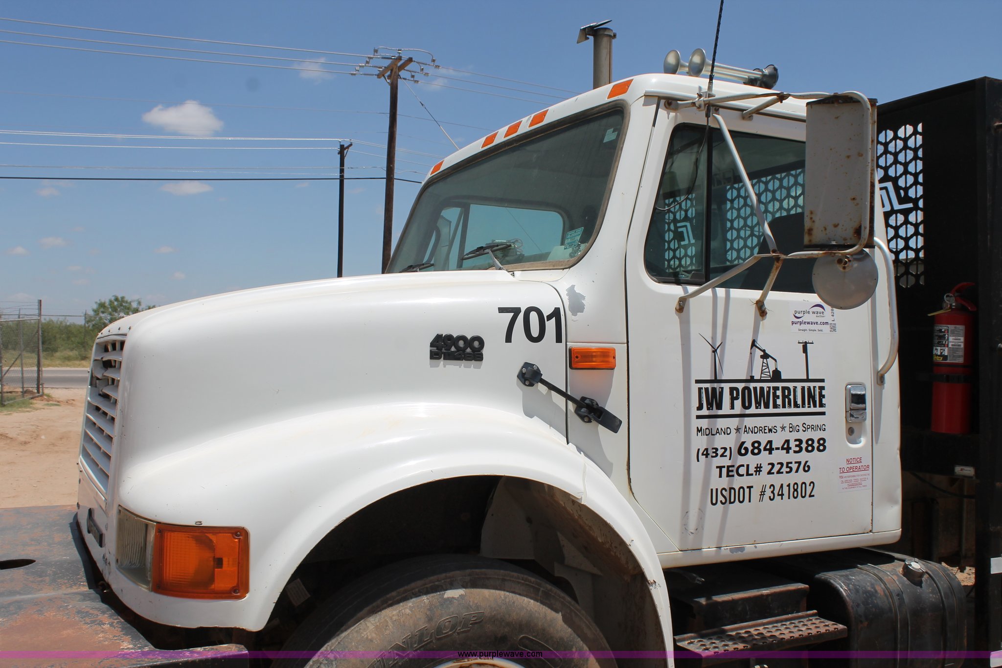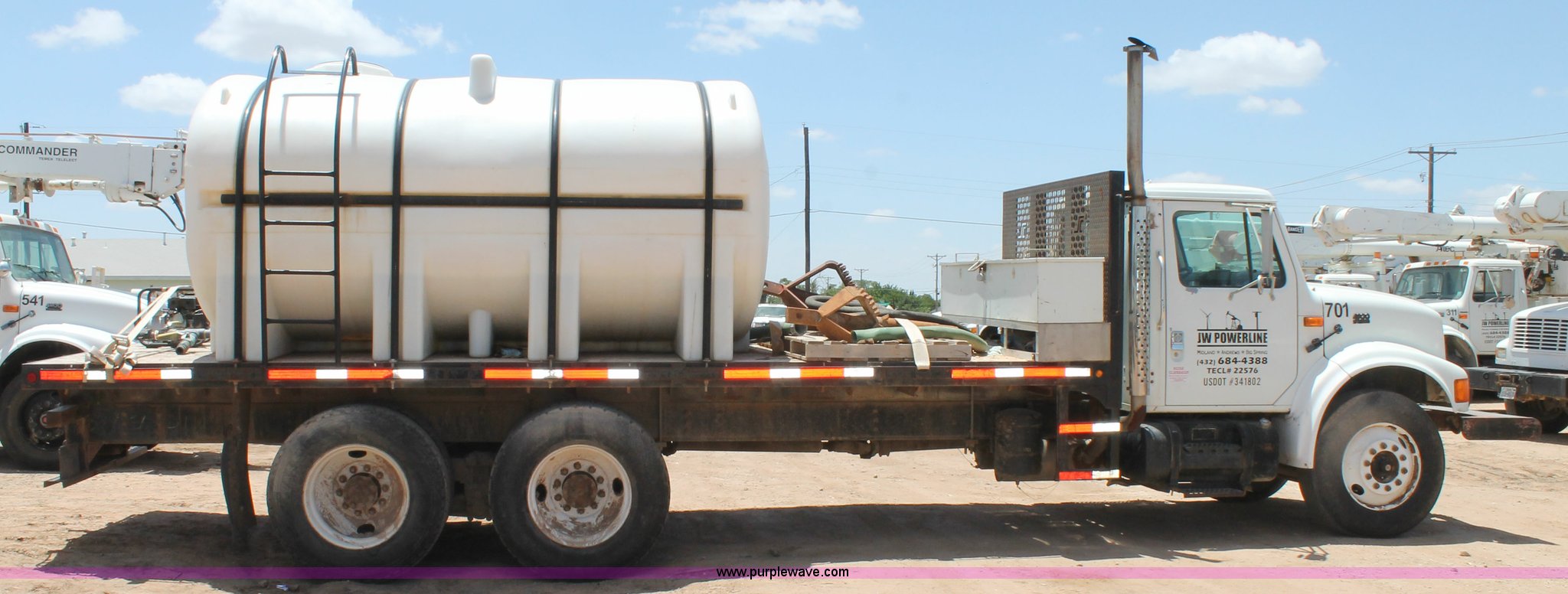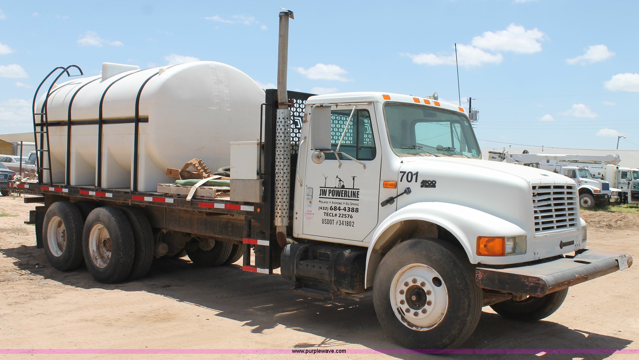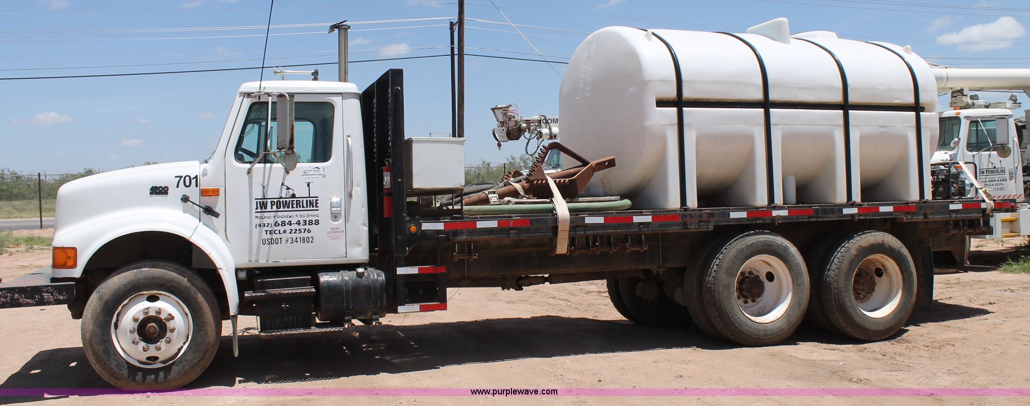 Purple Wave is selling a used Flat Bed Truck in Texas. This item is a 1996 International 4900 flatbed truck with the following: Unknown miles on odometer, International DT466 7.6L L6 turbo diesel engine, Nine speed manual transmission, AC and heat, AM/FM/CD, 22.5'L flatbed, 4' headache rack, Toolbox, 3,300 gallon water tank, Water pump, Dual fuel tanks, Pintle hitch, Trailer wiring, Spring suspension, Air brakes, 236" wheelbase, 11R22.5 tires, Back reamers not included, Unit# 701