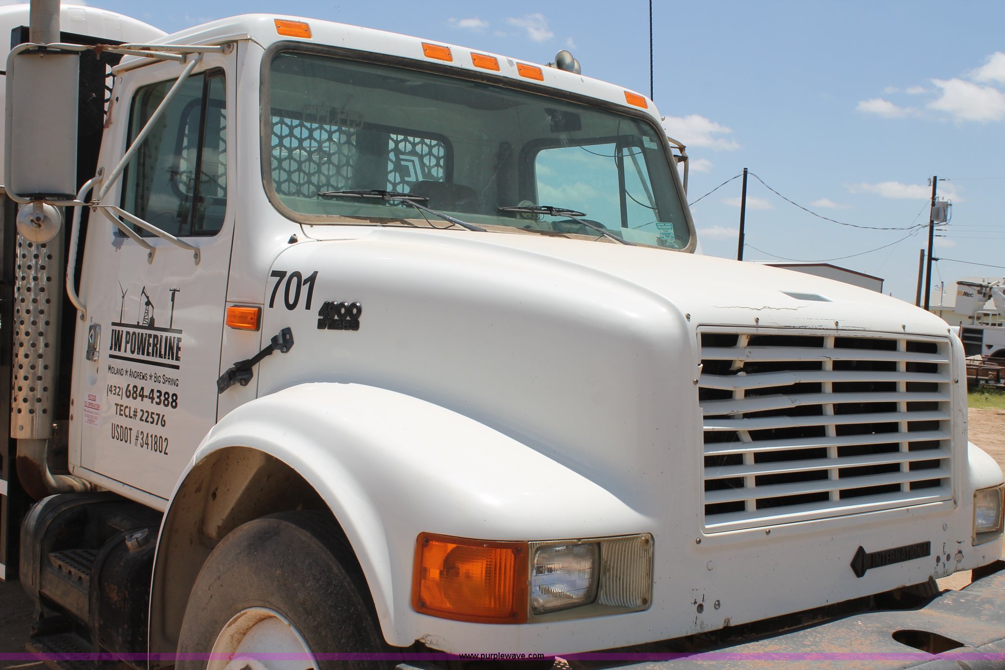 1996 International 4900 flatbed truck. Unknown miles on odometer, International DT466 7.6L L6 turbo diesel engine, Nine speed manual transmission, AC and heat, AM/FM/CD, 22.5'L flatbed 4' headache rack Toolbox, 3,300 gallon water tank, Water pump, Dual fuel tanks, Pintle hitch, Trailer wiring, Spring suspension, Air brakes, 236" wheelbase, 11R22.5 tires, Back reamers not included, Unit# 701. Title distribution may be delayed up to 14 days from verification of funds. 1HTSHAAR5TH311131. JW Powerline. 700 S. Fairgrounds Road. Midland, TX 79701