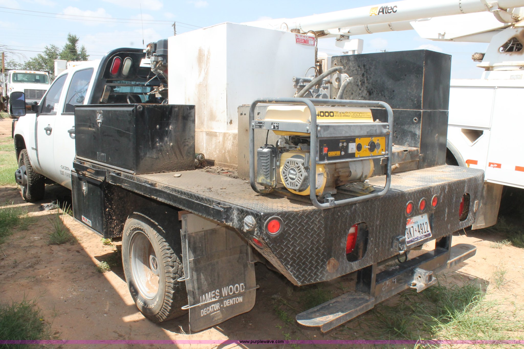 Purple Wave is selling a used Service Truck in Texas. This item is a 2012 GMC Sierra 3500HD Crew Cab flatbed utility truck with the following: Unknown miles on odometer, 6.6L V8 32V OHV turbo diesel engine, Automatic transmission, Four wheel drive, AC and heat, AM/FM, Power windows and locks, Suspension seat, Brake controller, Ranch Hand grill guard, Flatbed utility bed, (7) toolboxes, Champion 4000 generator, Gas engine, 240V outlet, 120V outlet, Air compressor, Honda 390 gas engine, Hose reel, Motor oil reservoir, Pump,, Receiver hitch, Trailer wiring, Spring suspension, Hydraulic brakes, 235/80R17 tires, GVWR 13,200 lbs, Unit# 286