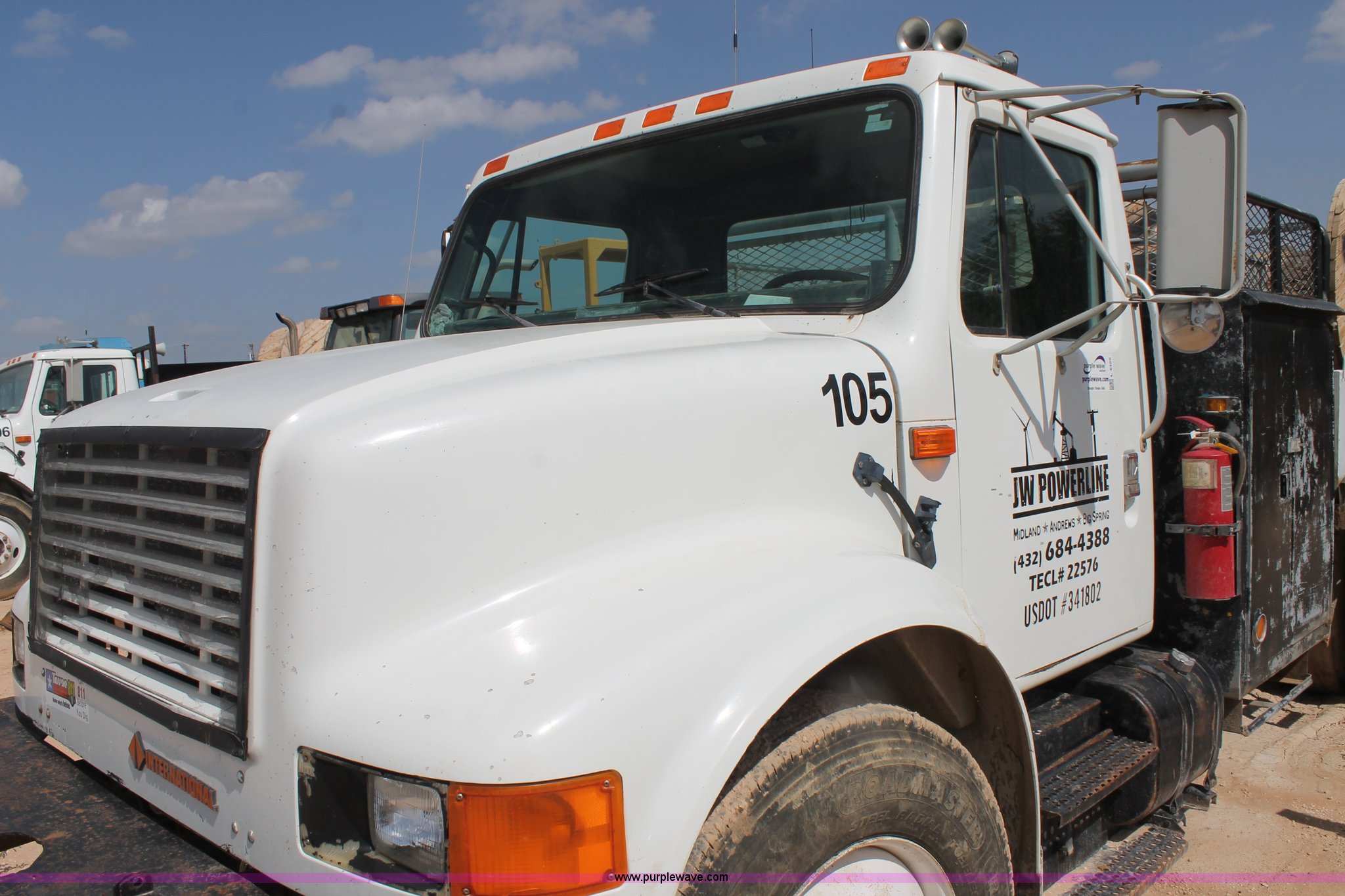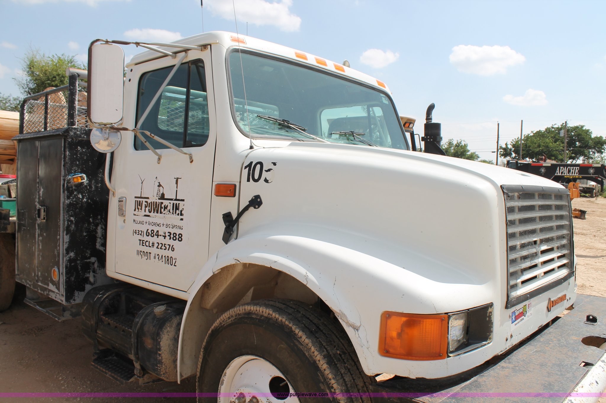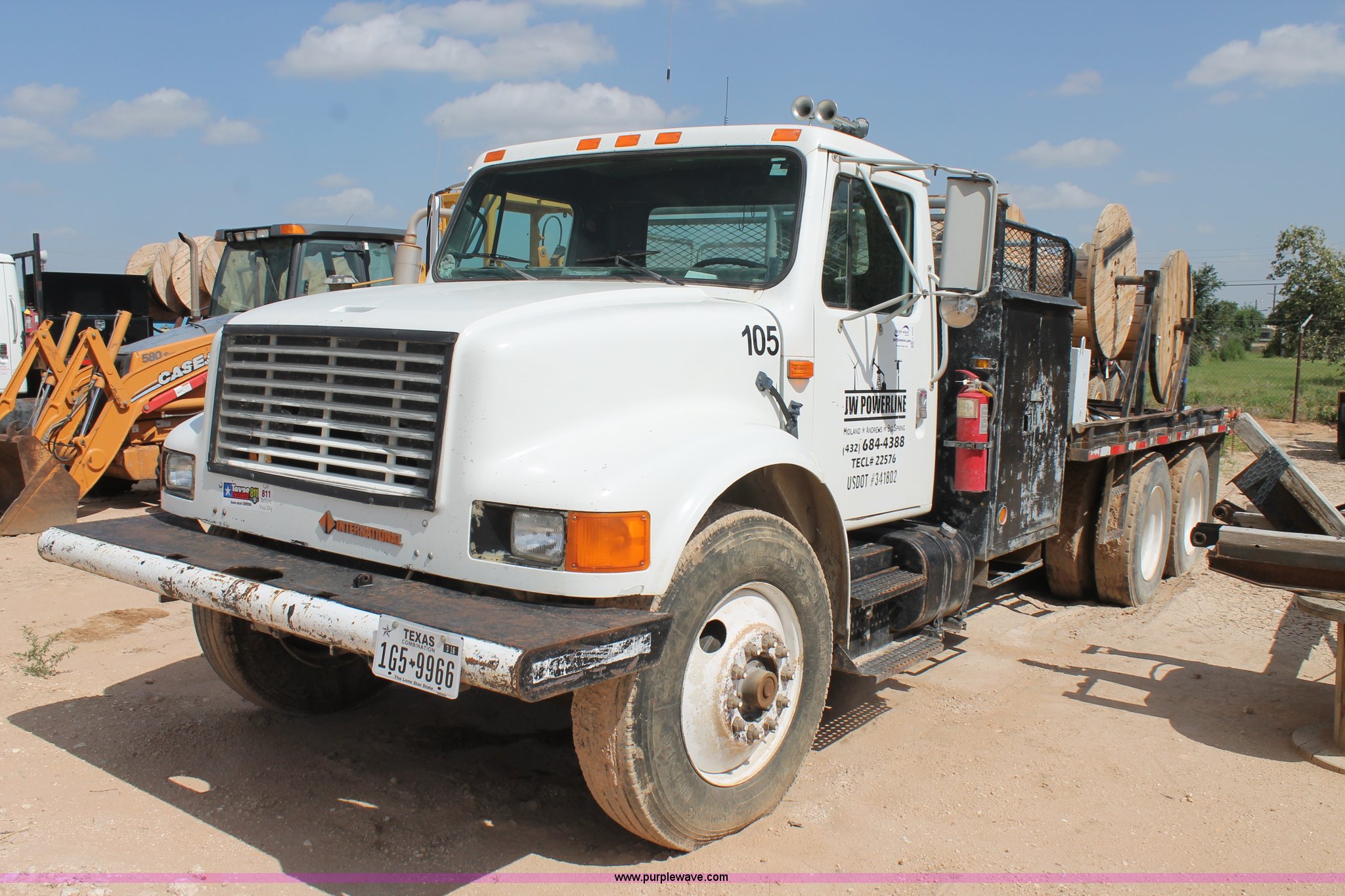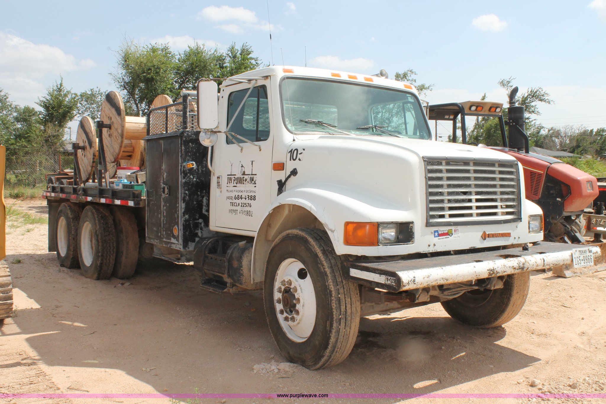 1992 International 4900 flatbed truck. 10,409 miles on odometer, International DT466 7.6L L6 turbo diesel engine, 10 speed manual transmission, Tandem axles, AC and heat, AM/FM/cassette, Air suspension seat, 16'L flatbed Shelving, Cable reels not included, will be removed prior to auction, Dual fuel tanks, Pintle hitch, Trailer wiring, Spring suspension, Air brakes, 11R24.5 tires, GVWR 52,000 lbs, Unit# 105. Title distribution may be delayed up to 14 days from verification of funds. 1HTSHNXR6NH401860. JW Powerline. 700 S. Fairgrounds Road. Midland, TX 79701